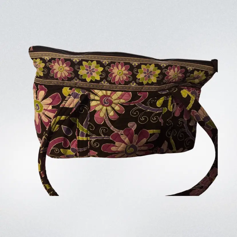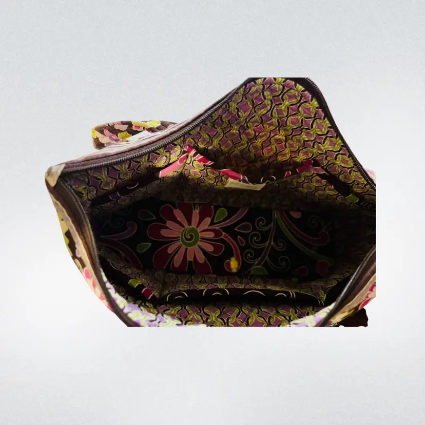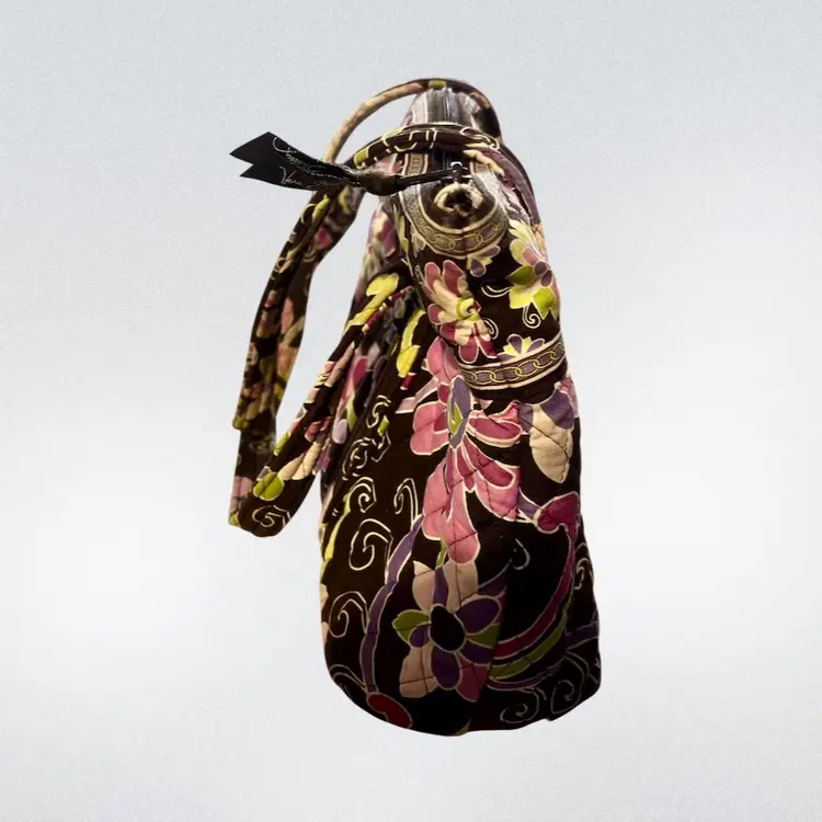 A vibrant and classic retired Vera Bradley print featuring a rich chocolate brown background with pink, purple, and lime paisley floral detailing.