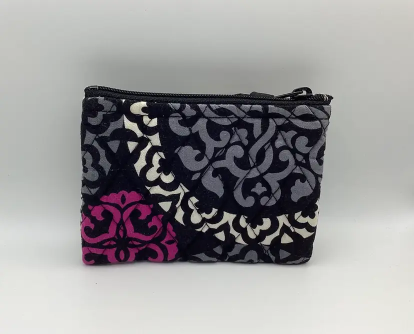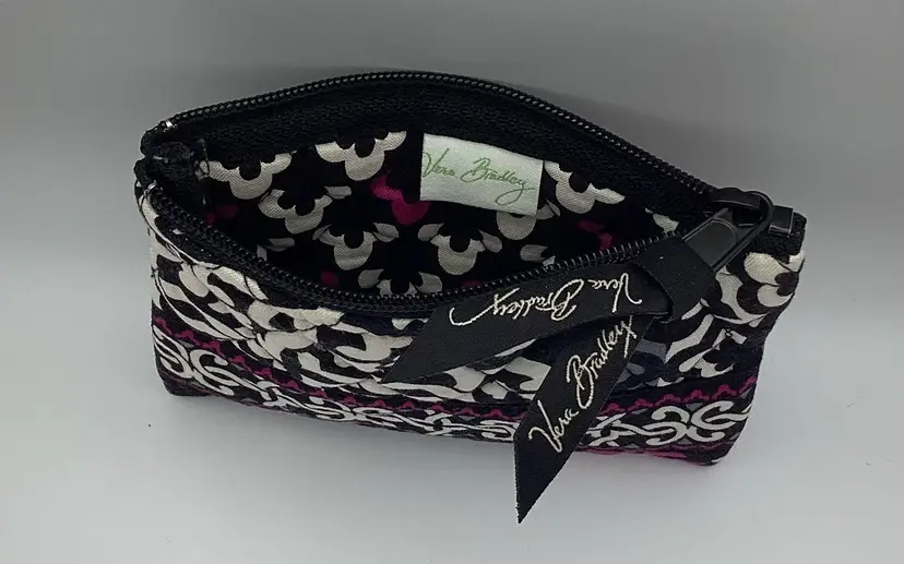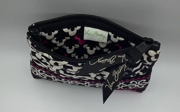 Brand: Vera Bradley Identifier: Tag inside and Ribbon outside Features: Zipper / Decorative band across the front Material: Cloth Pattern/Design: Canterbury Magenta Color: Black / White / Gray / Magenta Measurements: Height - 3 and 3/4” Width - 5”