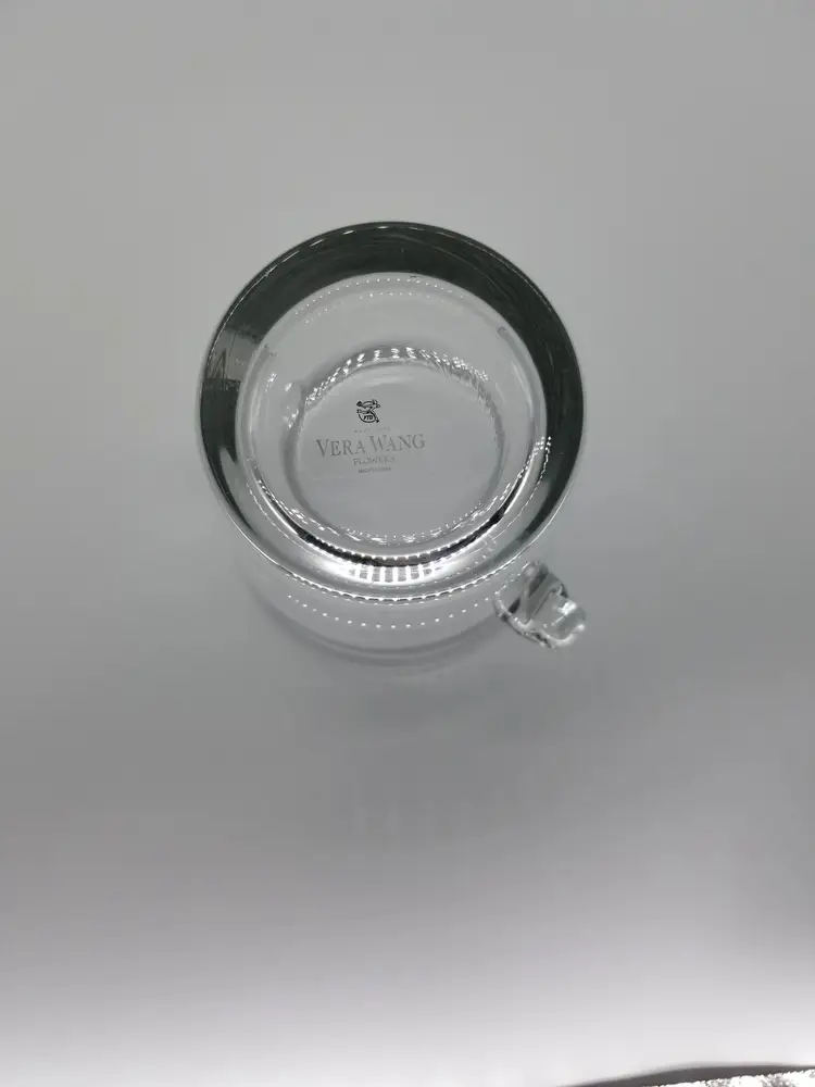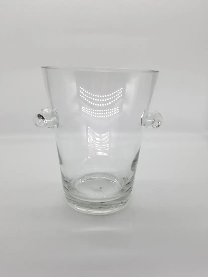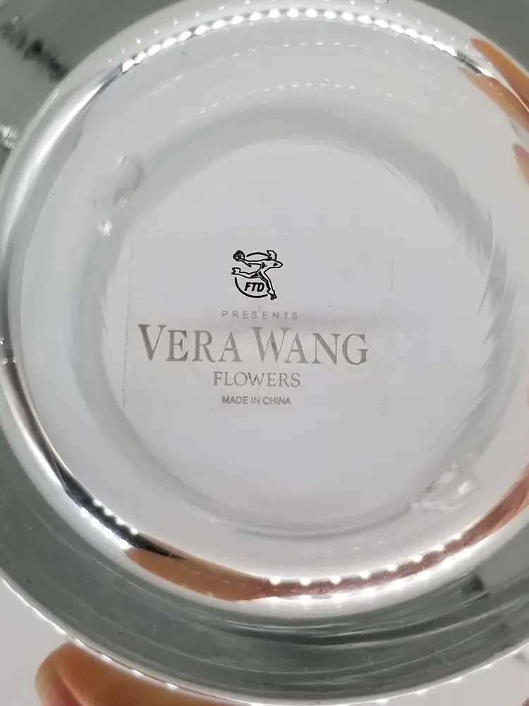 Vera Wang FTD Glass Ice Bucket Vase is 7" tall x 6 1/2" wide with handles. Nice ice bucket sold as a vase. Scrolled handles. No chips, cracks or repairs. Please view pictures as part of the description and feel free to ask questions. Thank you for visiting my shop.