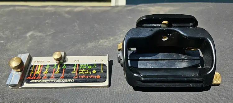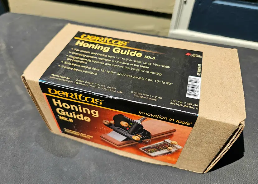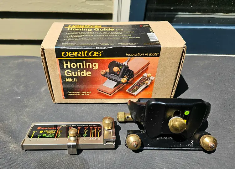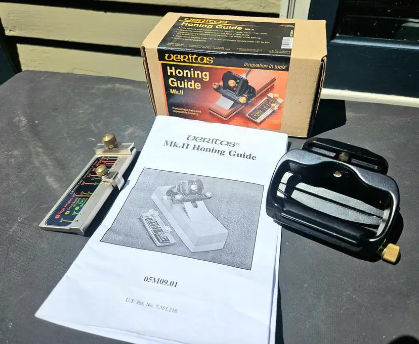 Lightly used with original box and instructions. The best honing guide I have ever worked with. I learned to sharpen on water stones with this tool and now its time to pass it along to the next person.