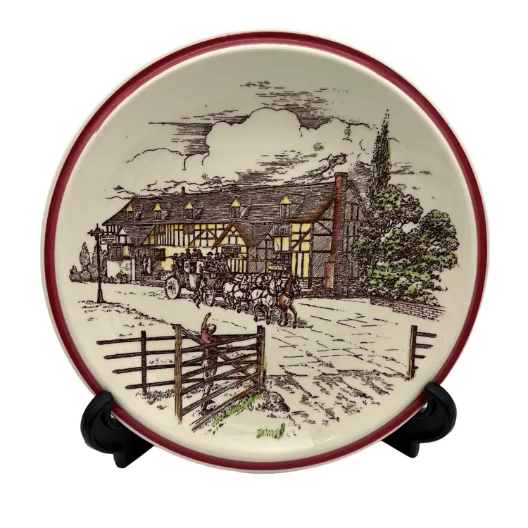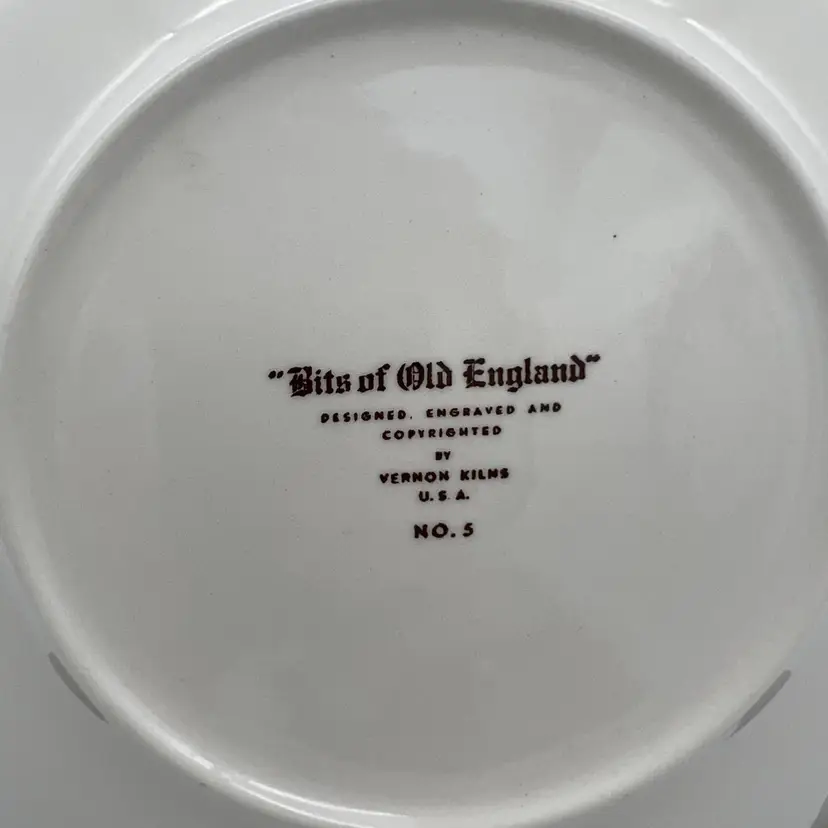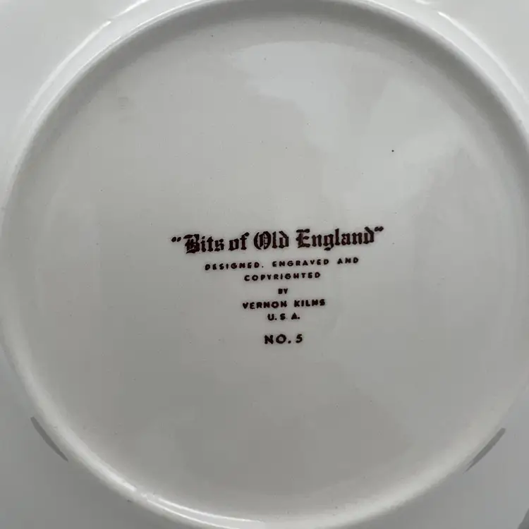 Vintage "Bits of Old England" collectible plate from Vernon Kilns. It is plate number 5 in the series. The plate measures approximately 8 1/4" across. Made in the USA.