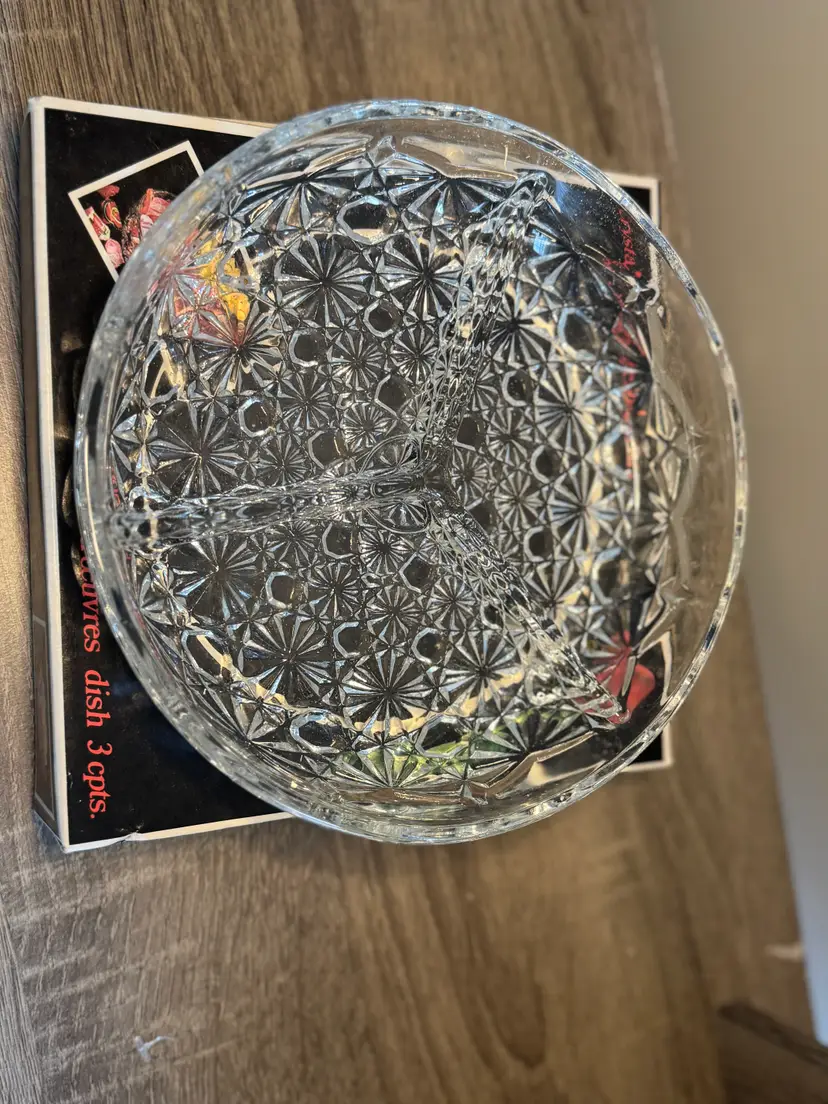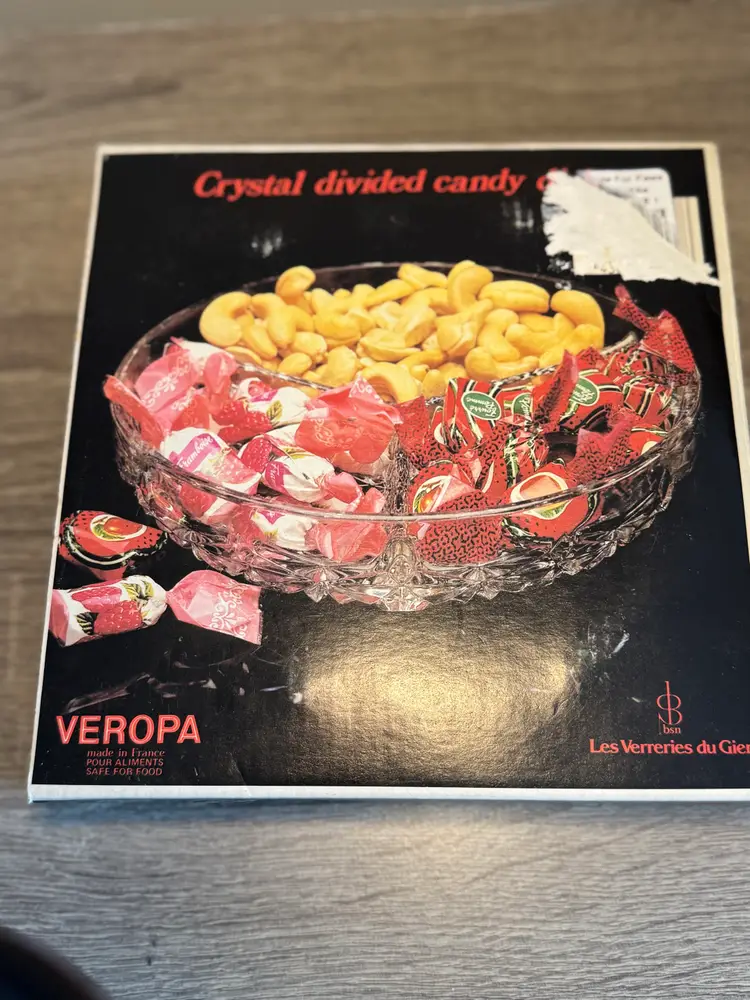 The Veropa crystal candy dish, made in France, is divided into three sections. It comes in its original box.