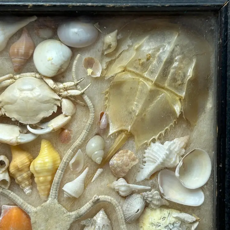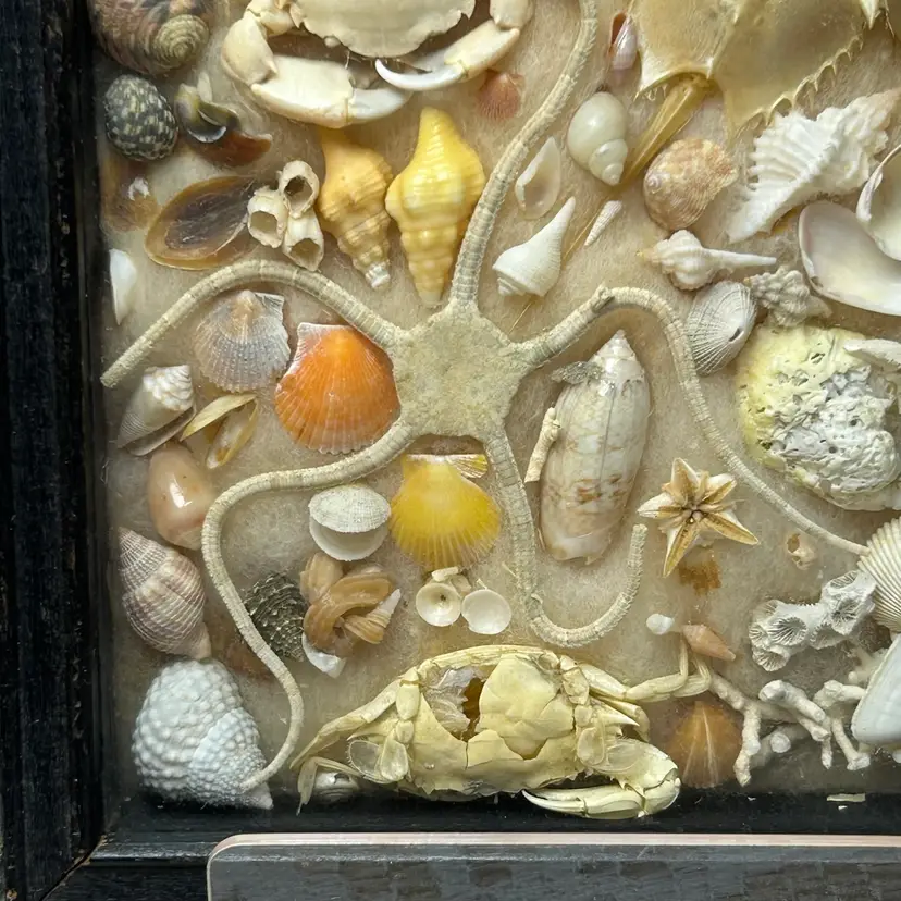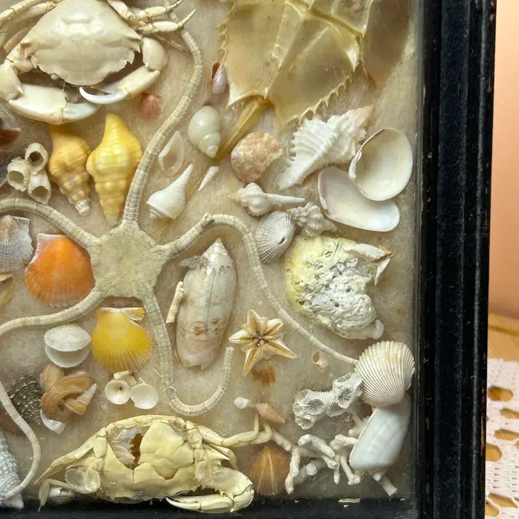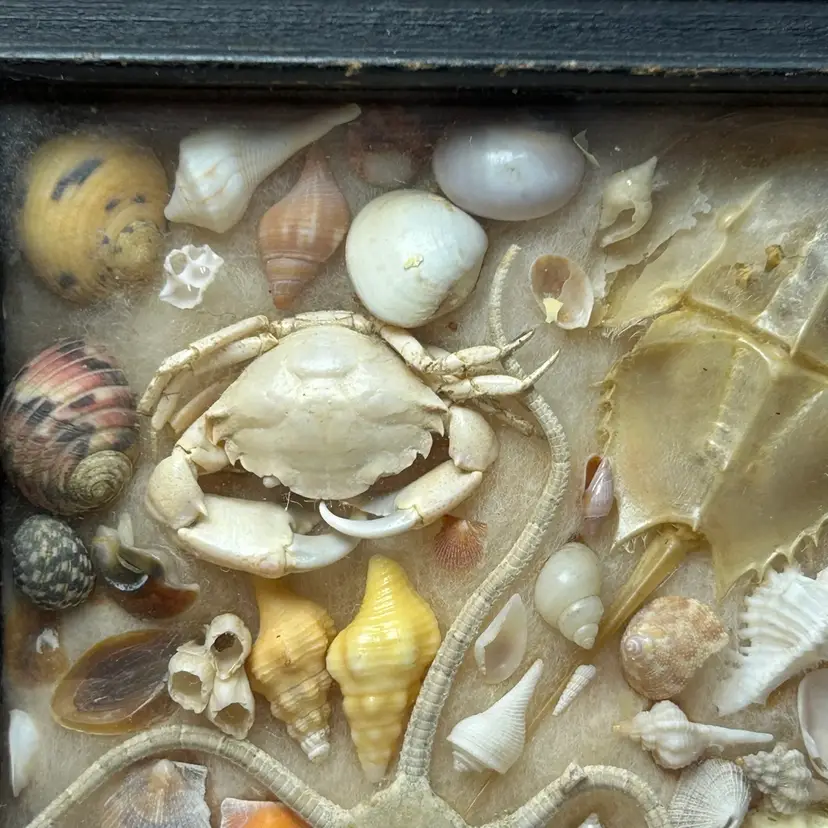 Framed in a black colored wooden frame, it includes a taxidermied starfish, two crabs, and a horseshoe crab exoskeleton. A variety of seashells, such as whelks, conchs, and bivalves. Other natural elements like coral pieces and sea urchin spines. From around late 30s to 40s. See photos to assess condition of frame. Items inside are in excellent condition.