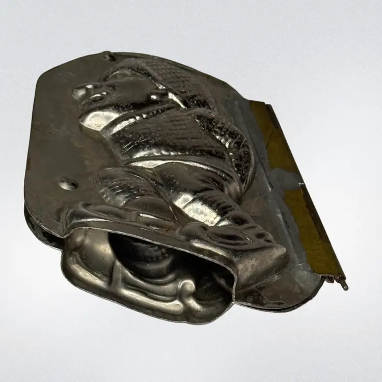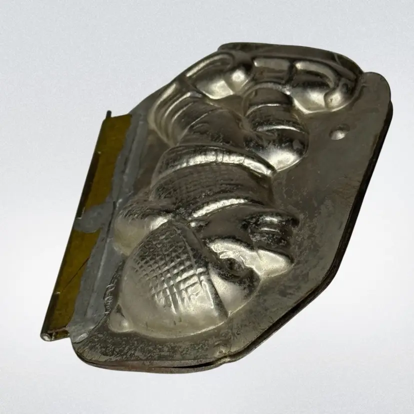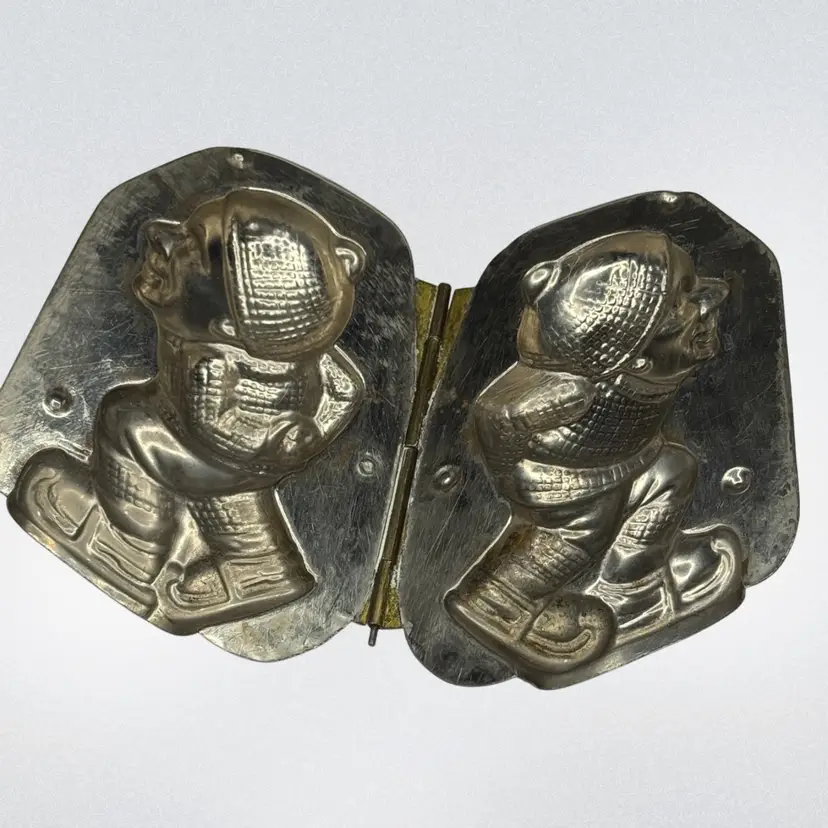 This is an authentic tin chocolate mold used to make hollow chocolates. Made in Holland and depicts an ice skater. Measures 5" x 4".