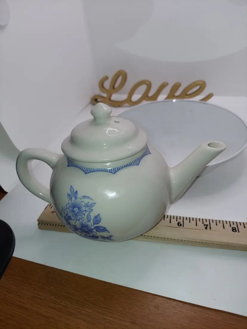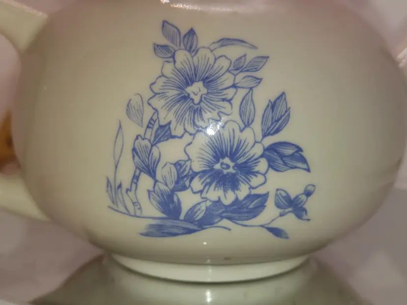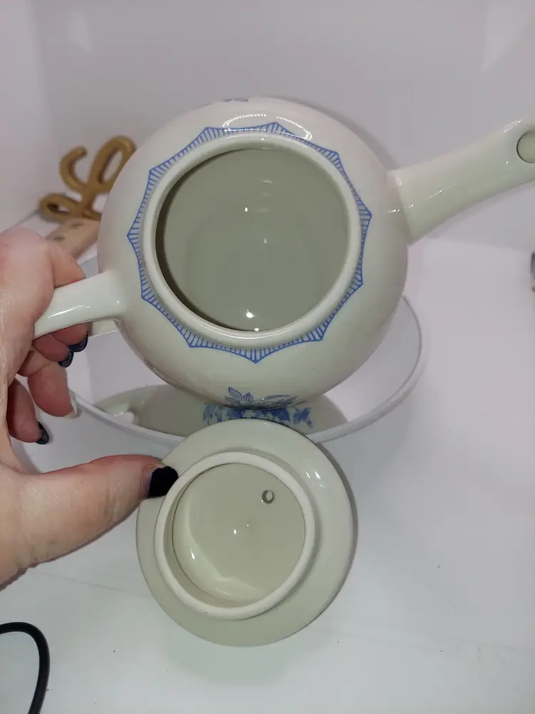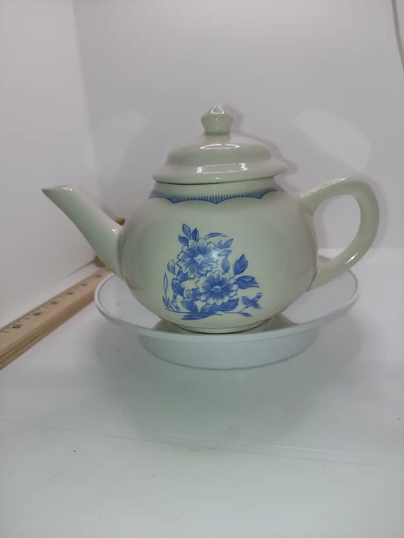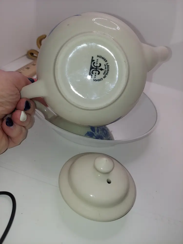 This product is a very rare Homer Laughlin vintage teapot from 1993, featuring white ceramic round pot with blue flowers. It is a French country style tea pot with a glossy finish and hand-painted decorative elements. The teapot has a 2-cup capacity, includes a lid and handles for easy filling and carrying. Made in California as part of the art pottery production style, this teapot is a unique and collectible piece for tea and coffee enthusiasts. Measures about 4 inches. This has Never been used, only displayed. It is in Like New condition. This item is cross-posted on other apps so if you love it grab it, then its GONE when you come back--that means it was SOLD on another app! Also please see our other items for sale as we love to bundle to save on shipping! All of our packages are packed with love and care so rest assured it will arrive safely. Please send serious offers as we usually accept ones that are lower than competitively priced!