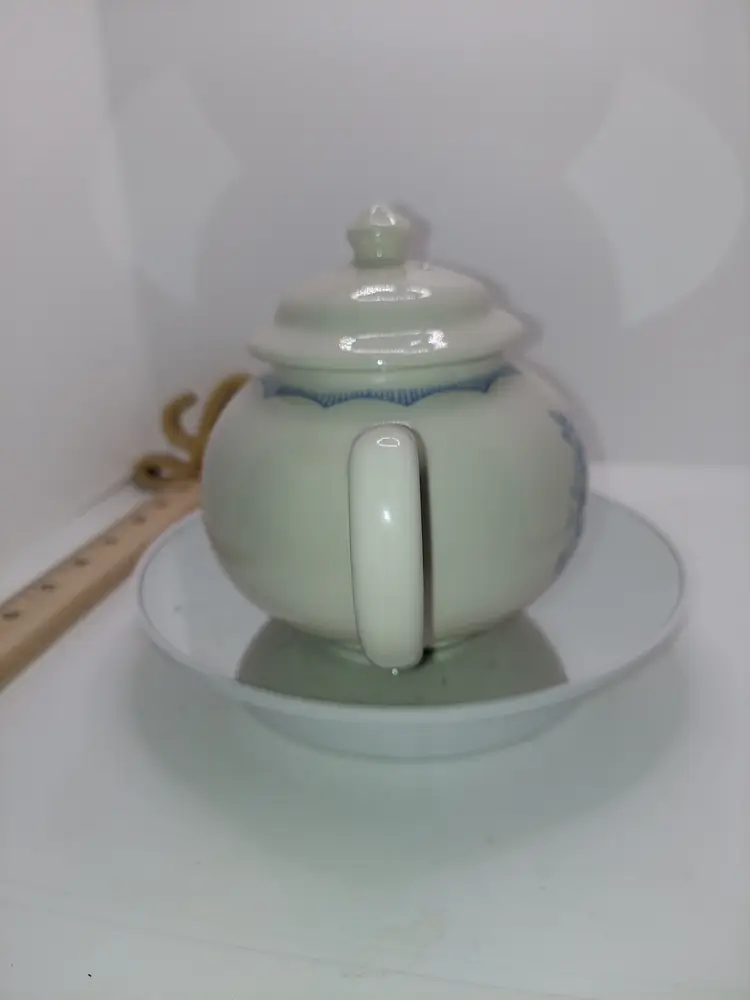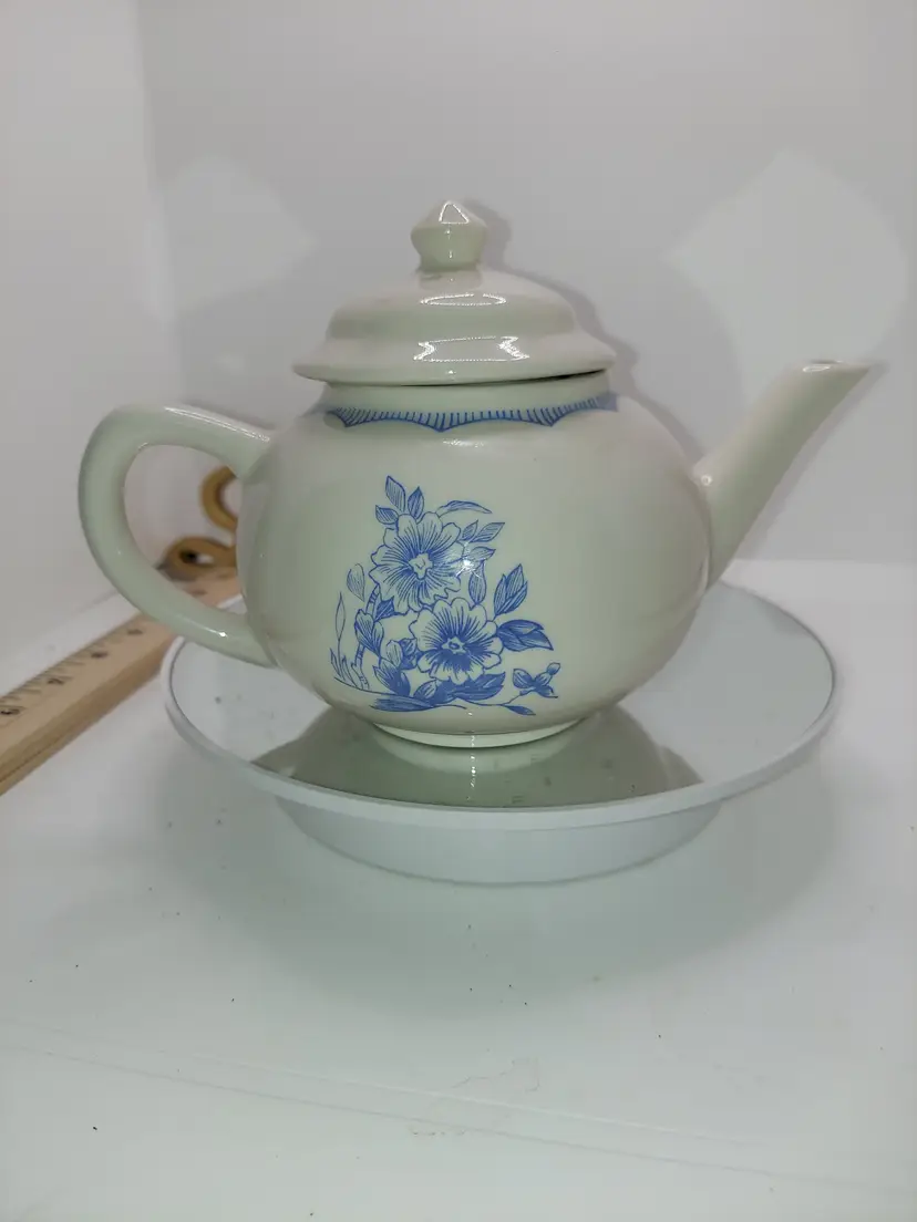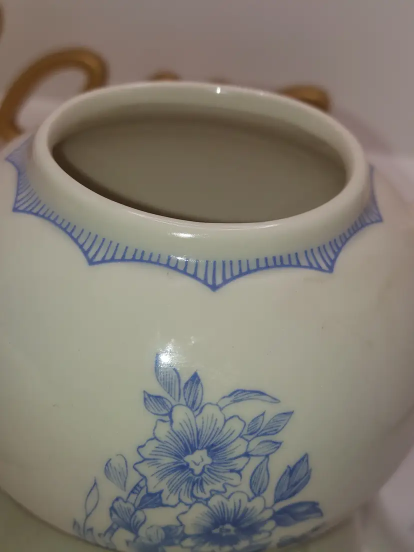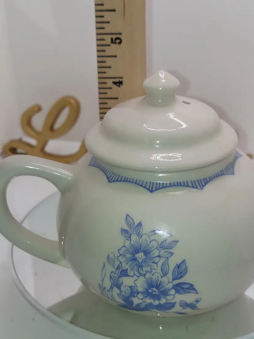 This product is a very rare Homer Laughlin vintage teapot from 1993, featuring white ceramic round pot with blue flowers. It is a French country style tea pot with a glossy finish and hand-painted decorative elements. The teapot has a 2-cup capacity, includes a lid and handles for easy filling and carrying. Made in California as part of the art pottery production style, this teapot is a unique and collectible piece for tea and coffee enthusiasts. Measures about 4 inches. This has Never been used, only displayed. It is in Like New condition. This item is cross-posted on other apps so if you love it grab it, then its GONE when you come back--that means it was SOLD on another app! Also please see our other items for sale as we love to bundle to save on shipping! All of our packages are packed with love and care so rest assured it will arrive safely. Please send serious offers as we usually accept ones that are lower than competitively priced!