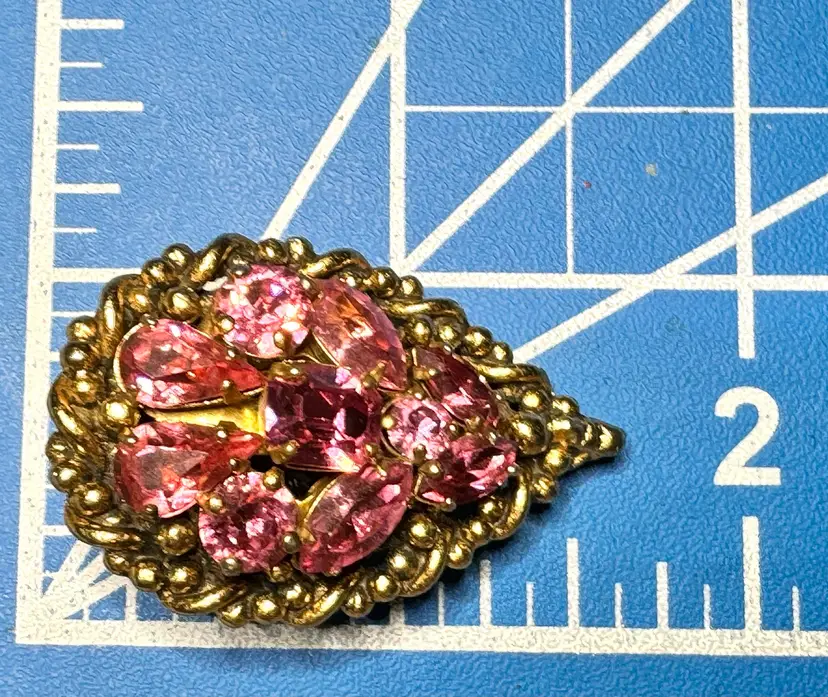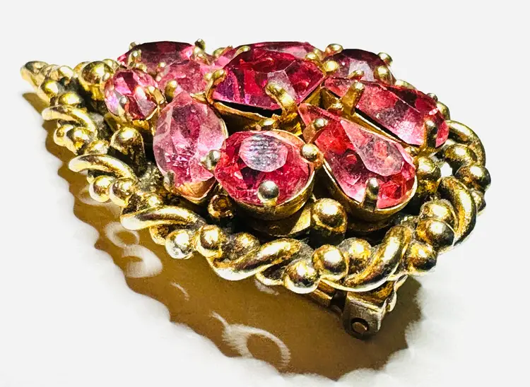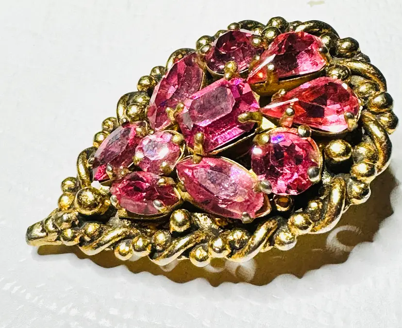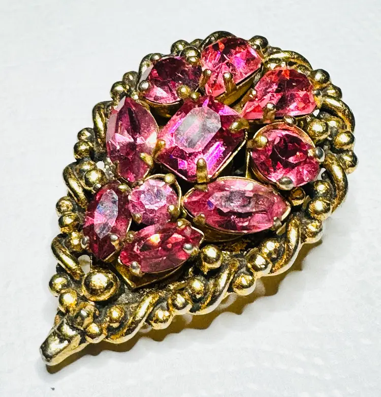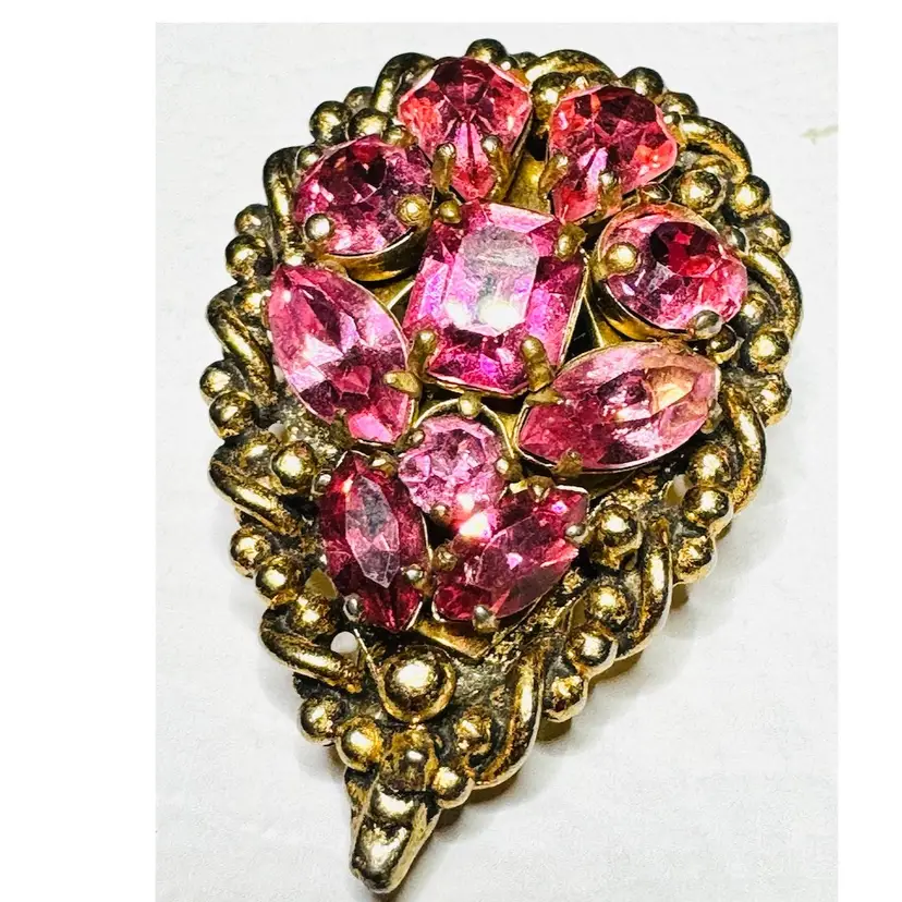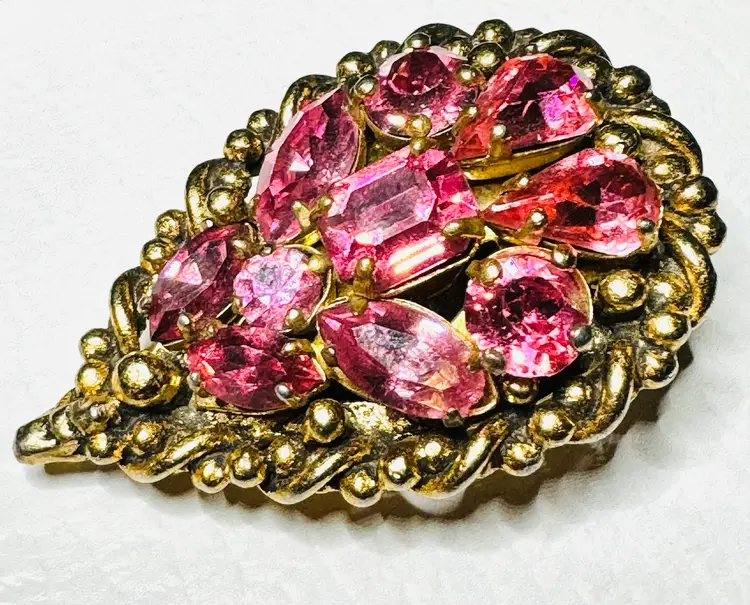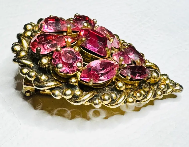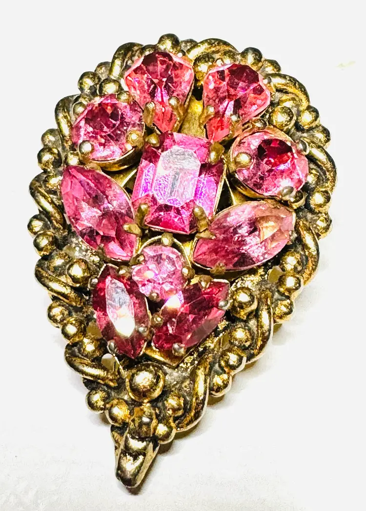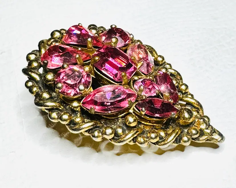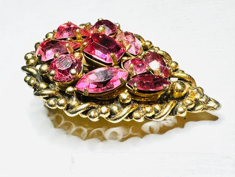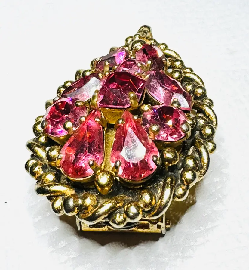 Very rare Barclays pink rhinestone fur clip. Measures about 1.5” x 1”. Likely gold plated.