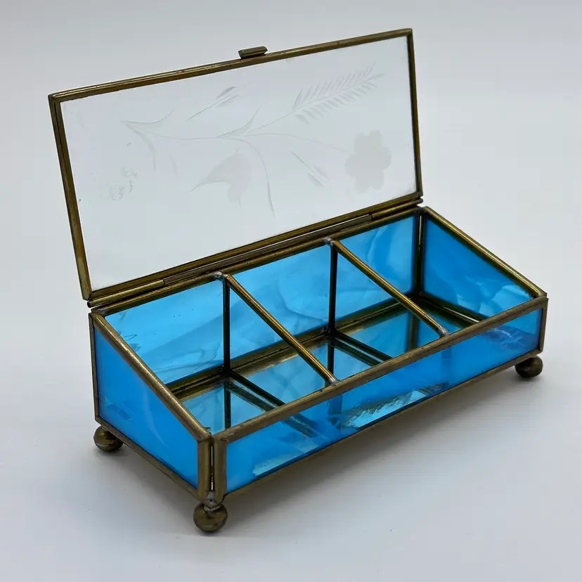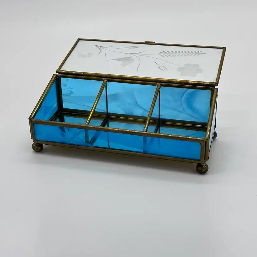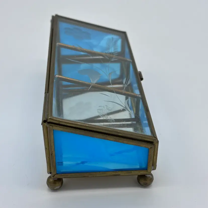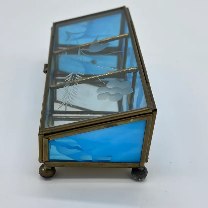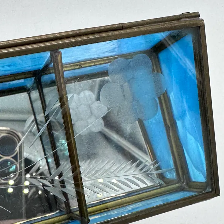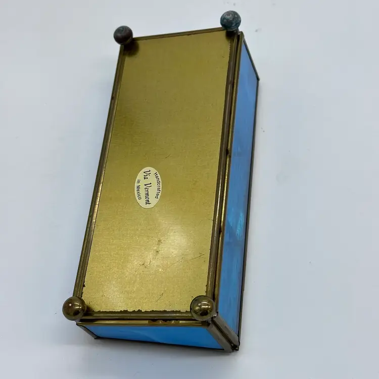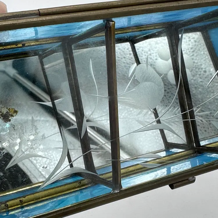 Via Vermont Mexico Blue White Swirl Glass And Brass Mirror Divided Etched Trinket Box. Has flowers and bird etching on the lid. In good condition. Does not have any chips or cracks. There is a spot of mirror rot in the mirror. There is some oxidation on the feet. Measures 6 1/4 inches long and 2 3/4 inches wide. Stands 2 1/4 inches tall.