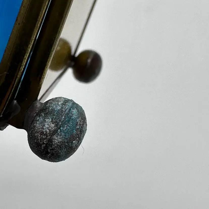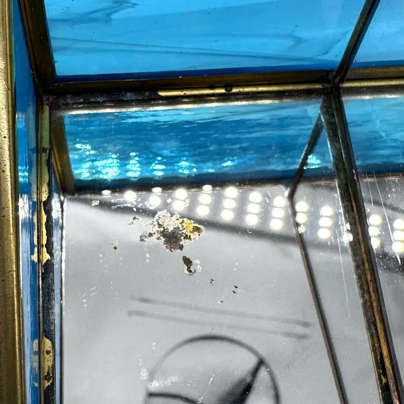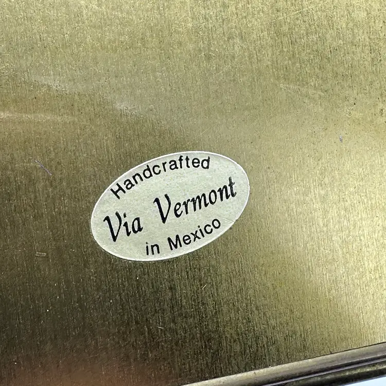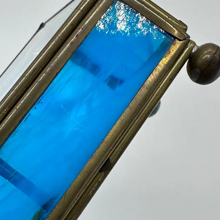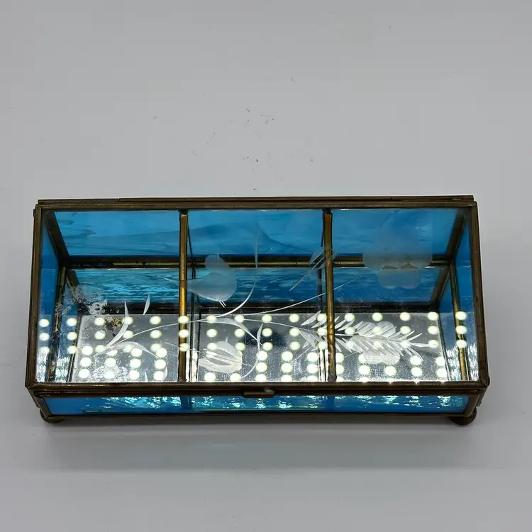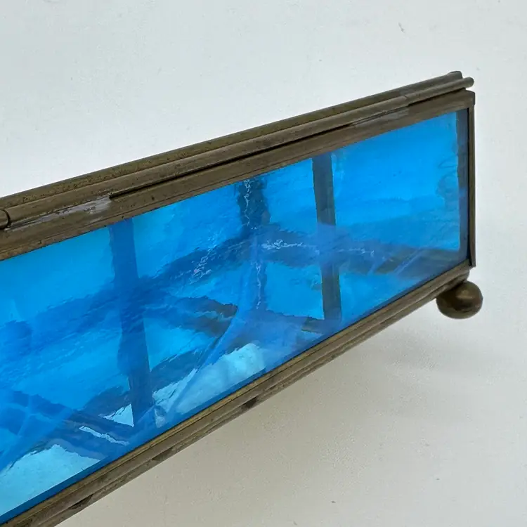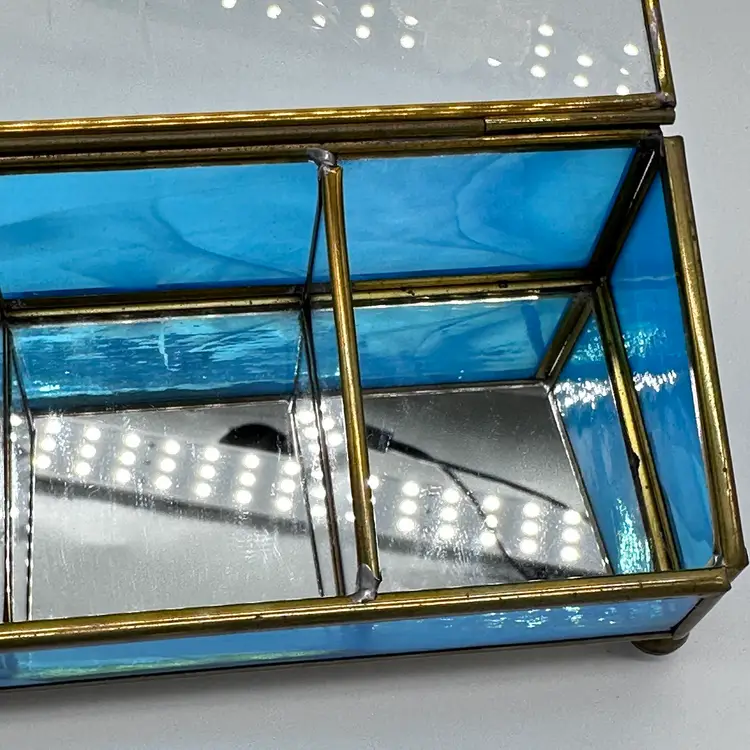Via Vermont Mexico Blue White Swirl Glass And Brass Mirror Divided Etched Trinket Box. Has flowers and bird etching on the lid. In good condition. Does not have any chips or cracks. There is a spot of mirror rot in the mirror. There is some oxidation on the feet. Measures 6 1/4 inches long and 2 3/4 inches wide. Stands 2 1/4 inches tall.