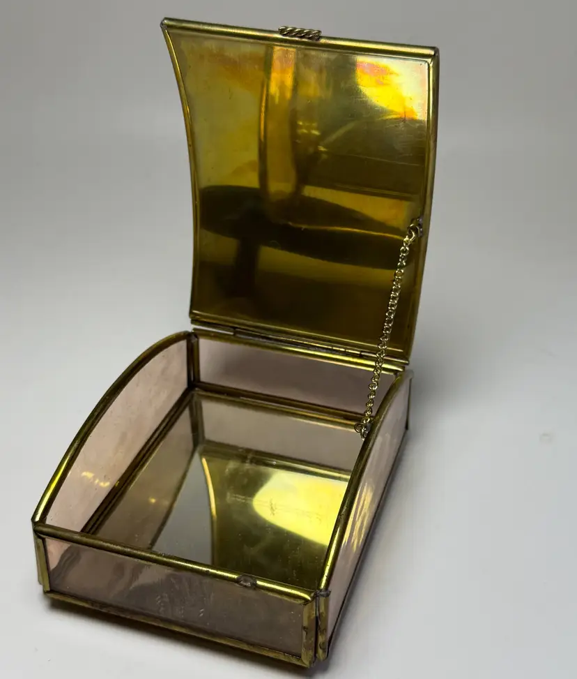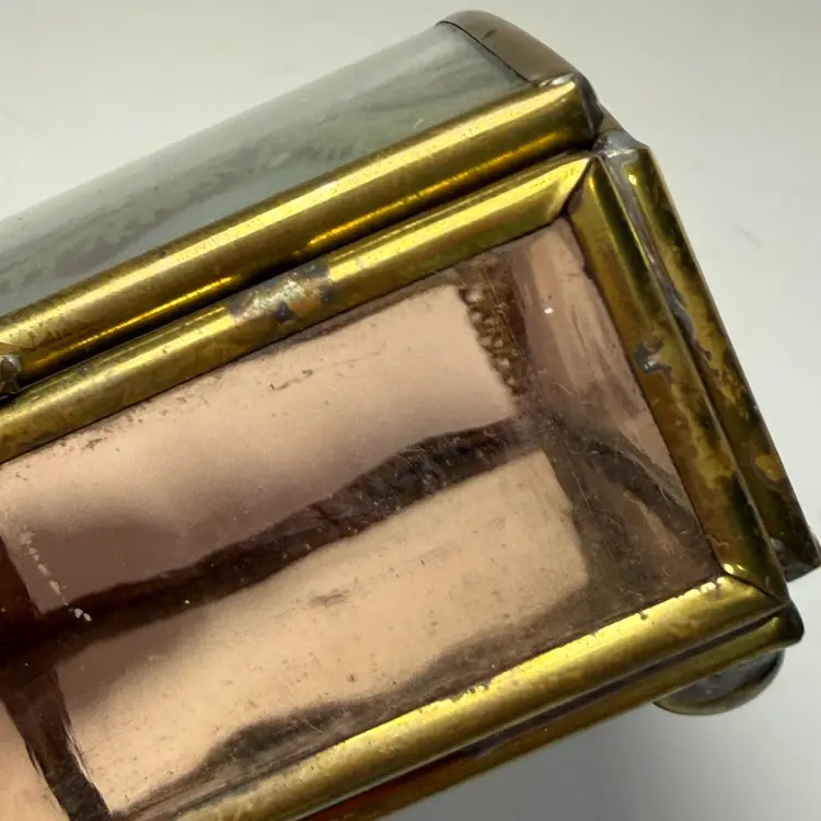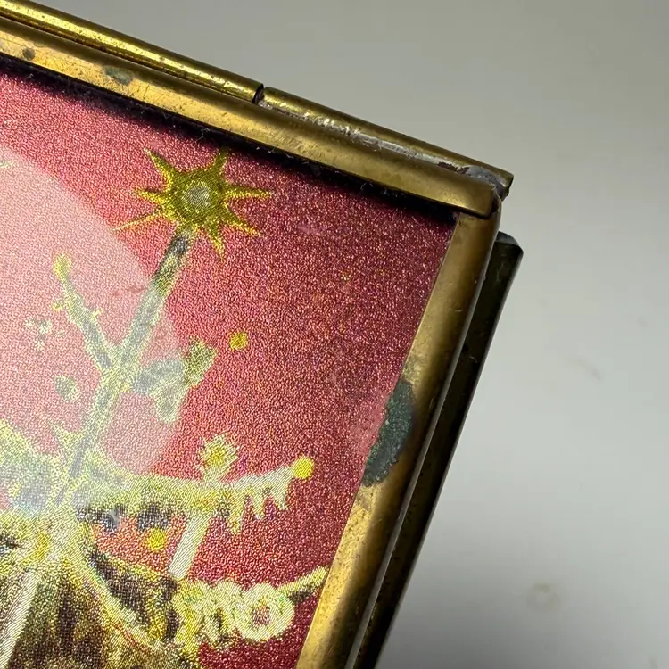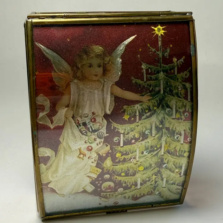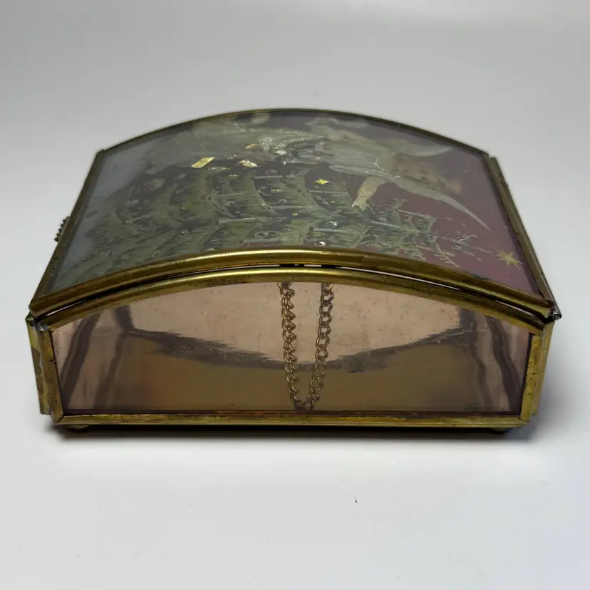 Via Vermont Stained Pink Glass Brass Trinket Box Foil Victorian Angel Christmas Tree. 2.25" tall x 5" x 4". Good condition with some light wear as shown. No chips, no cracks. Mirror inside on bottom.