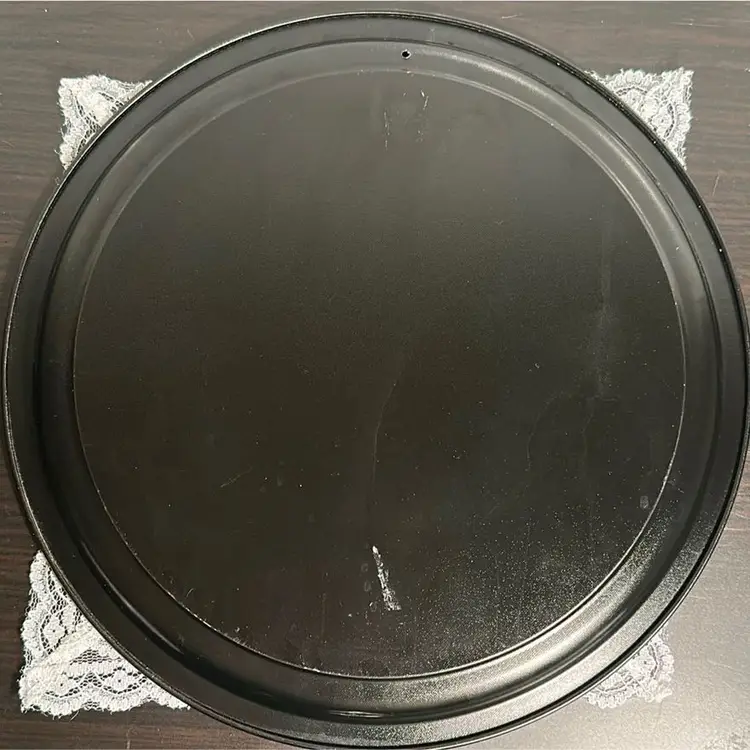 The tray measures 12” in diameter, and each coaster is 3 1/2” in diameter.