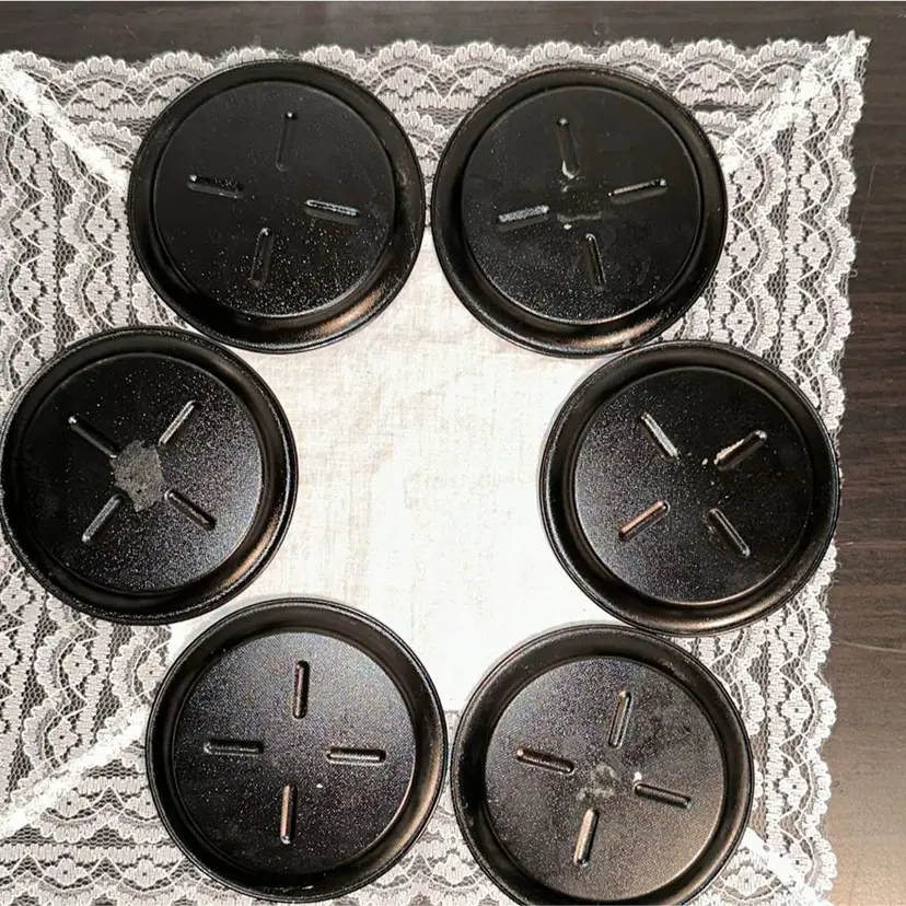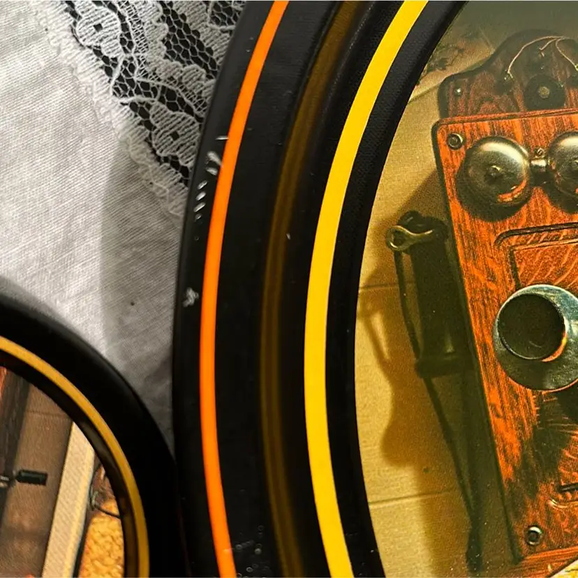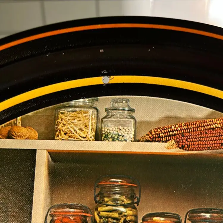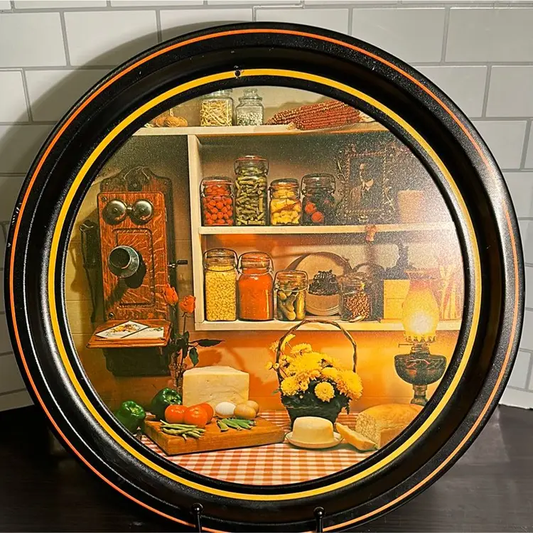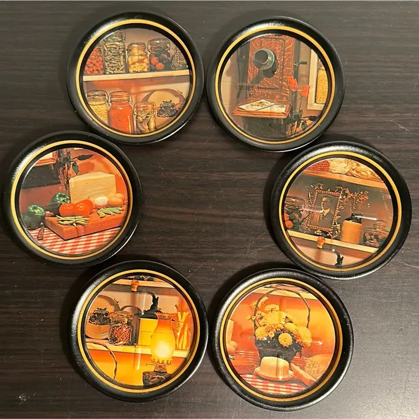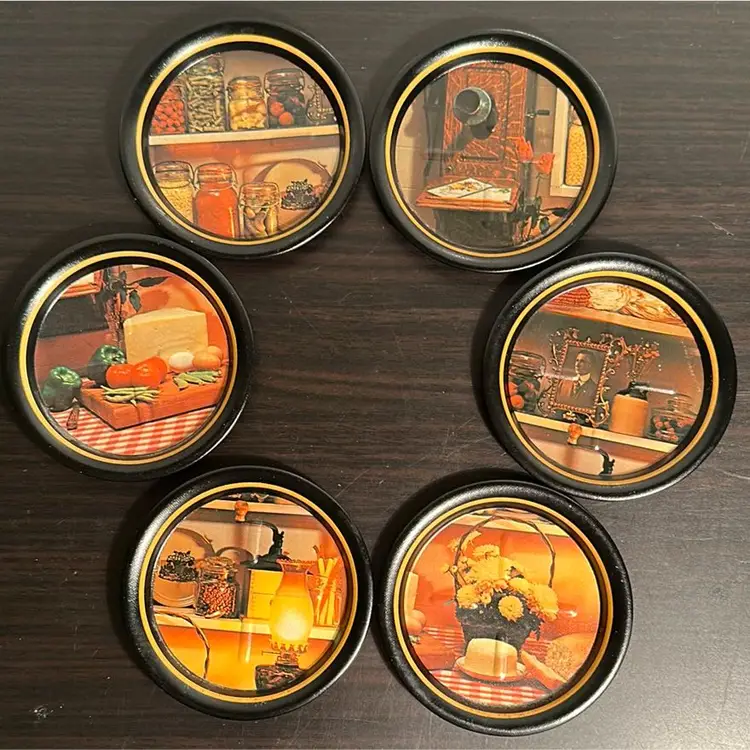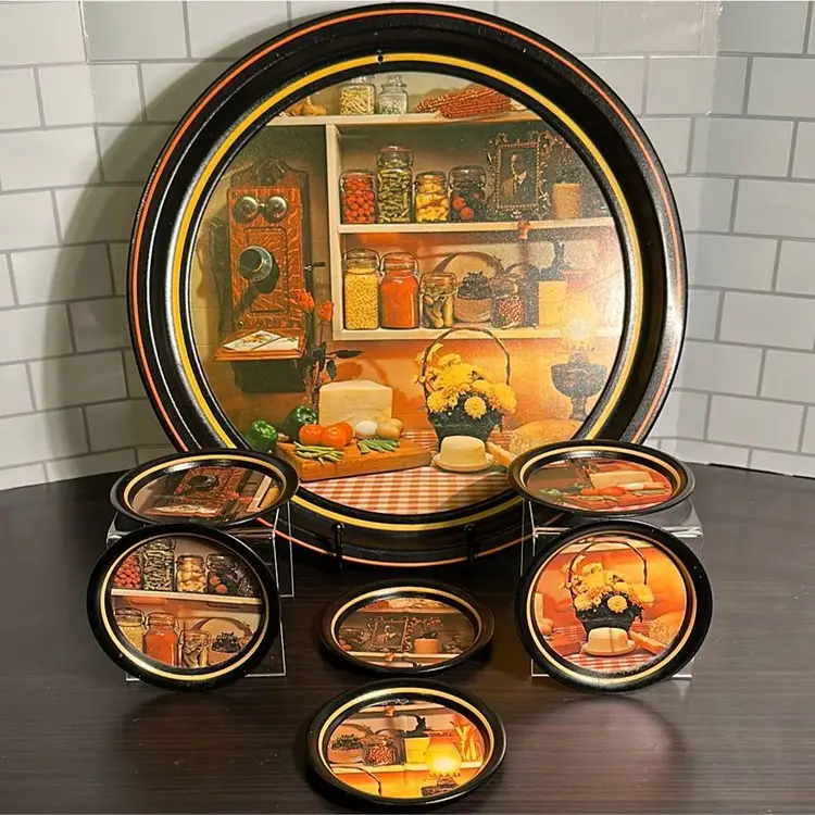 There are no markings on this tin litho tray or coasters. They appear to have been previously used as wall decor as the tray had a hole drilled into it, and each coaster was found with double stick tape residue. Almost all of the residue has been removed, but a small amount remains. There are also minor scratches on some of the coaster and the rim of the tray. Please review pictures for detail.