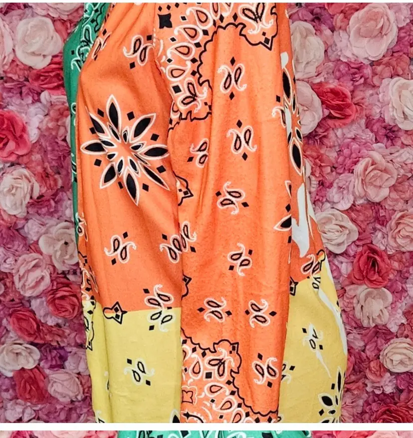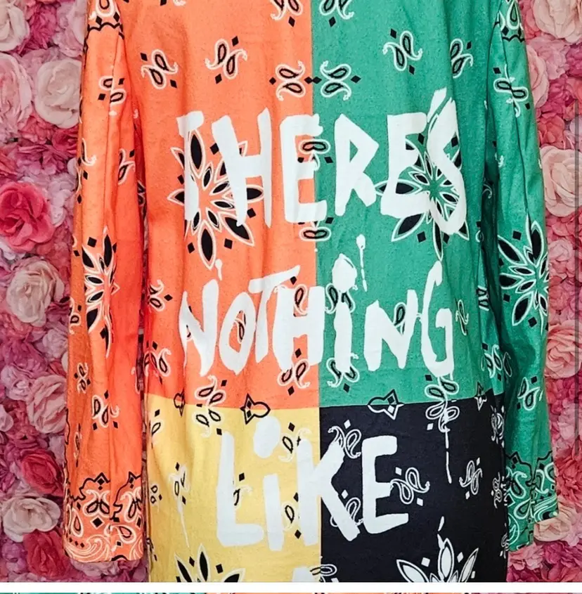 Step out in style with this vibrant patchwork cardigan a bold mix of green, orange, yellow, and black bandana prints. The long sleeves and collared neckline add a classic touch, while the eye-catching color blocks and graphic lettering on the back make sure you stand out in any crowd.