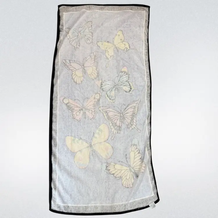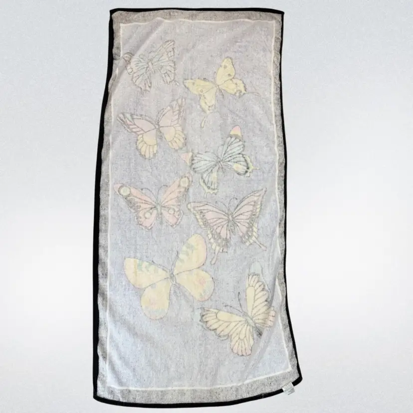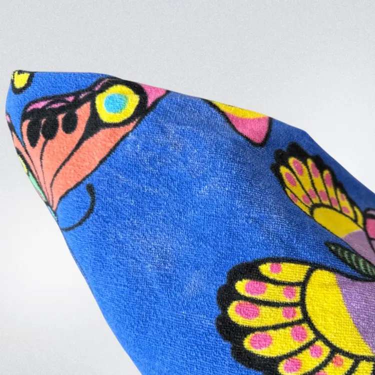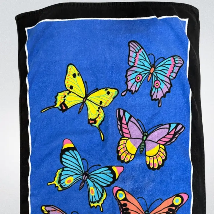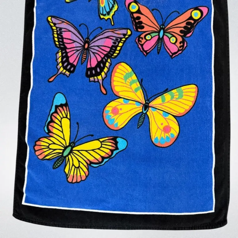 Vibrant and clean vintage butterfly beach or pool towel, 100% cotton and made in Brazil. This towel is about 54.5x26.75in. It’s in great condition minus one area of a very slight discoloration and some writing on the tag.