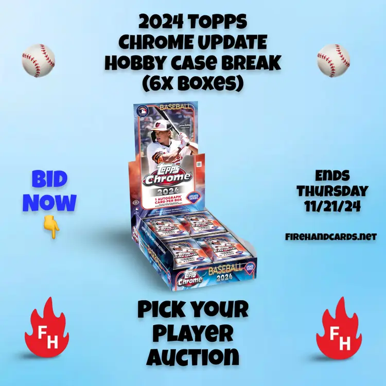 You are bidding on all the cards of the player listed in the title in this CASE (6x Hobby Boxes) of 2024 Topps Chrome Update Baseball Cards. Auctions end Thursday night 11/21 & Case will be opened LIVE on Friday 11/22 in the afternoon. Opening will be viewable & simulcast on Firehand Cards District as well as YouTube. US Shipping is $5.00 for your first auction spot won and only $.25 per additional spot won after that! Any spot won where no cards of the player are found in the box will receive a bonus card or pack from the Firehand collection. Any hit pulled (Cut Signatures, Sketches, Reverence etc) of a player who is NOT listed in the auction will be assigned by draw between all participants. Any multi-player numbered cards, relics, or autographs will be assigned by draw between the spots depicted on the card