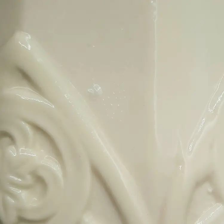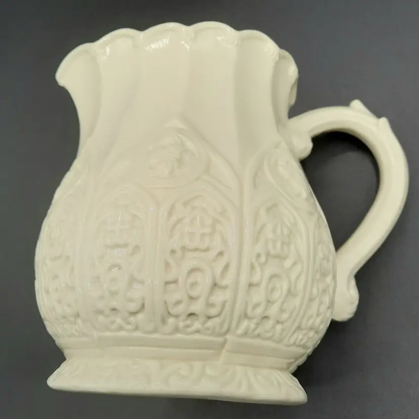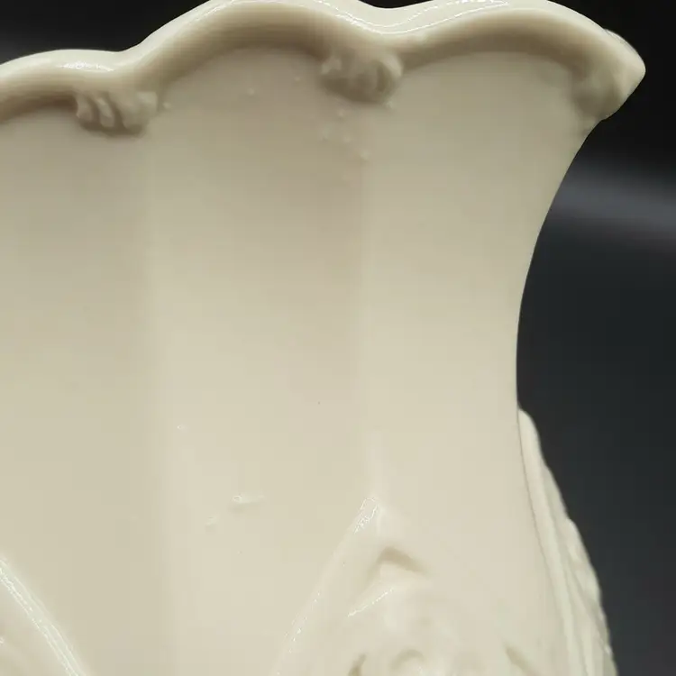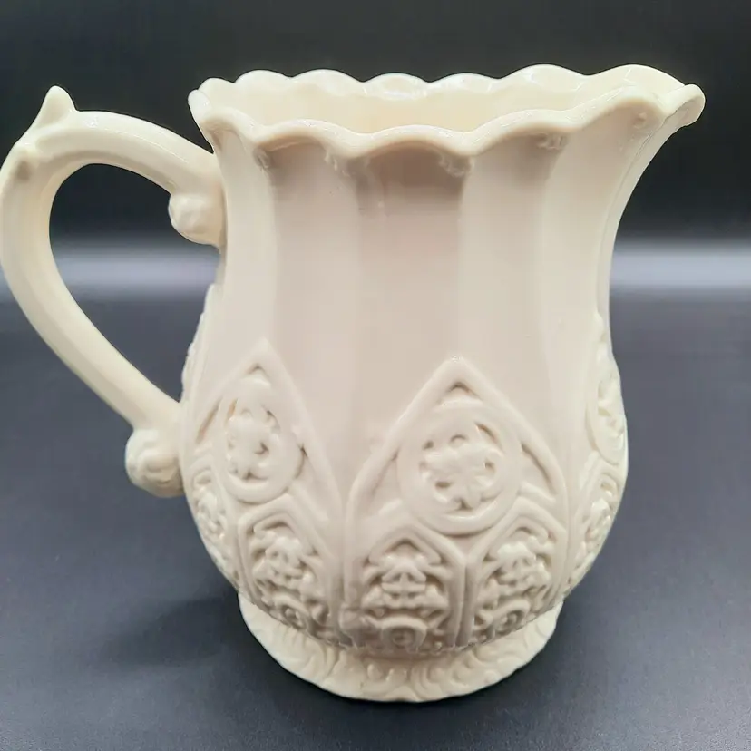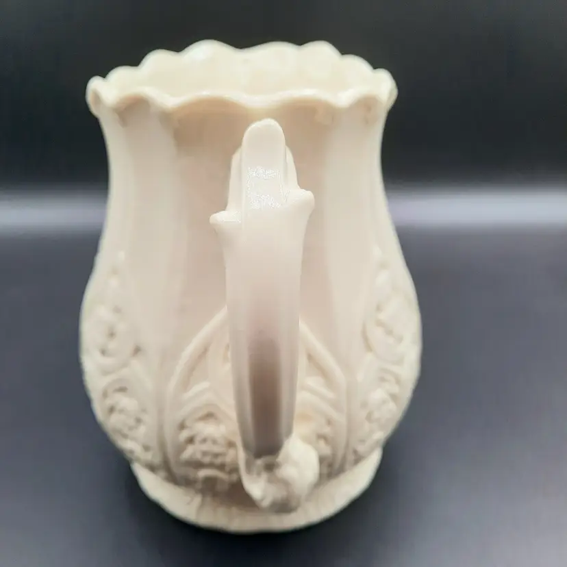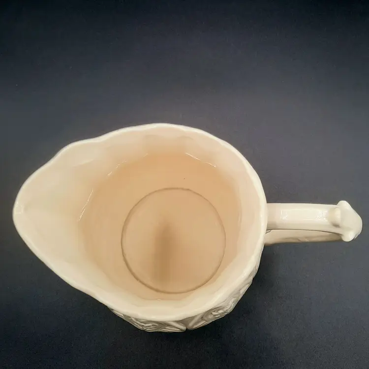 Unique pitcher is 6 1/4"H x 7 1/2"W handle to spout, no chips or cracks, does have some design defect bubbles in glaze