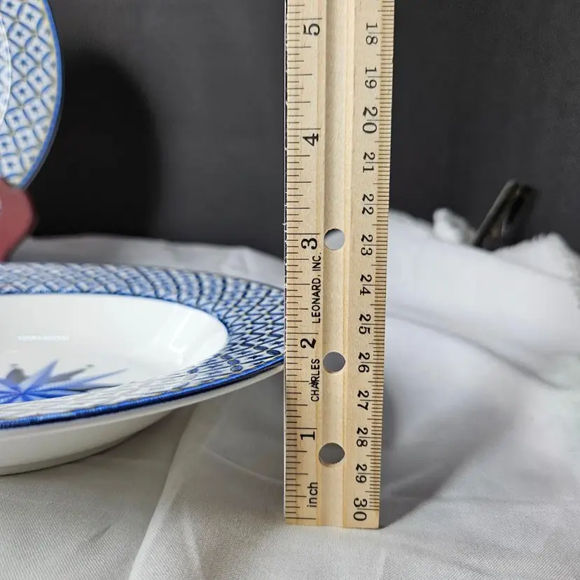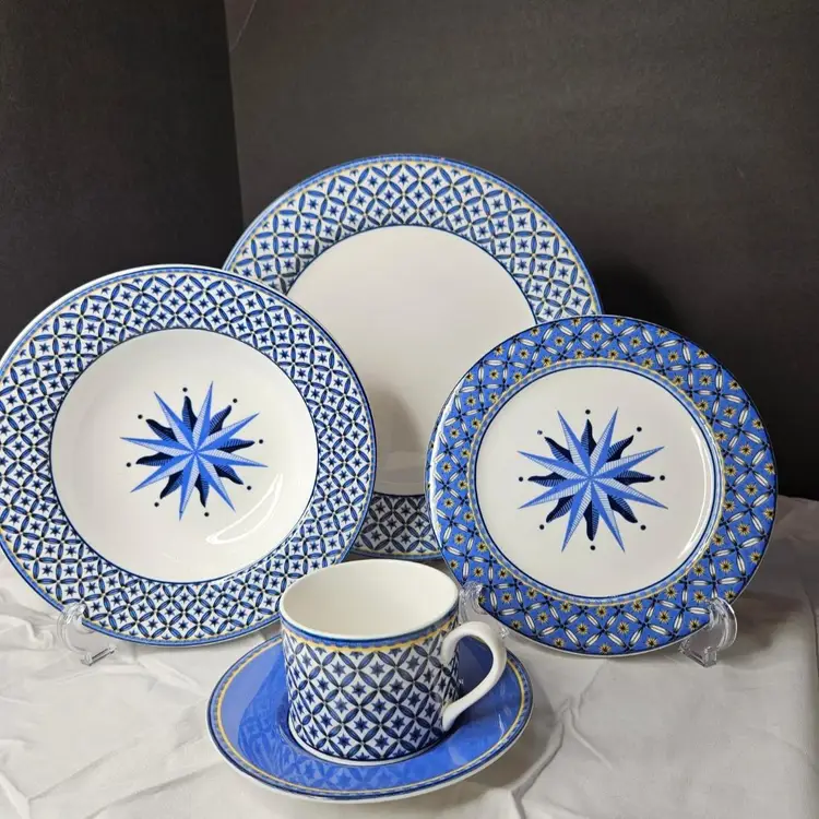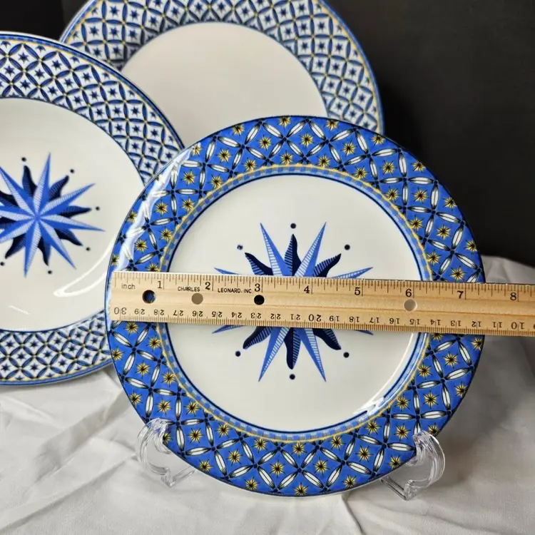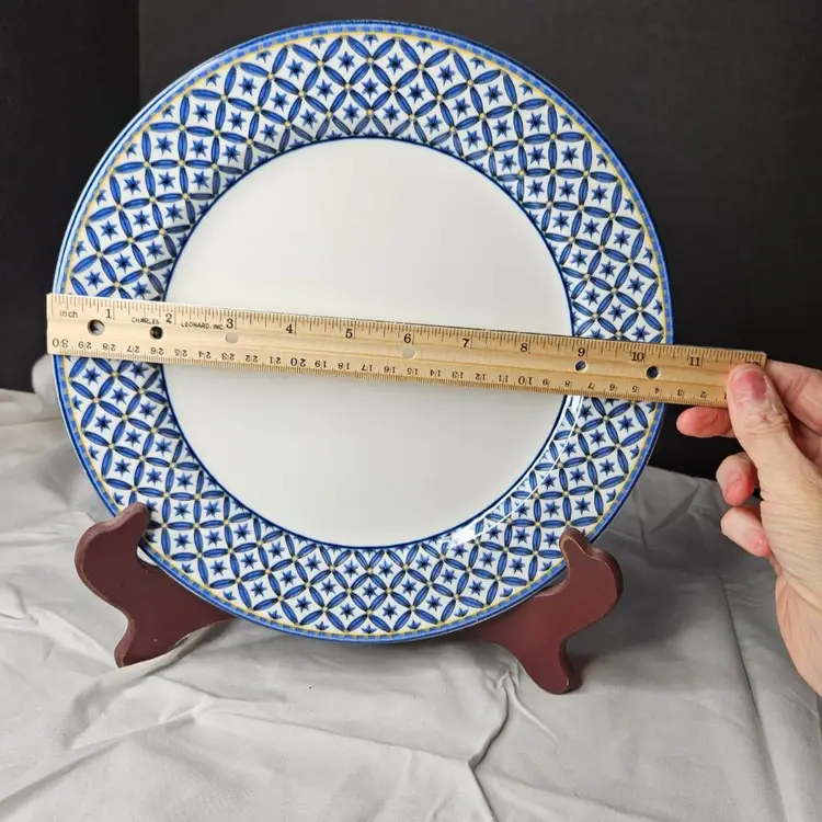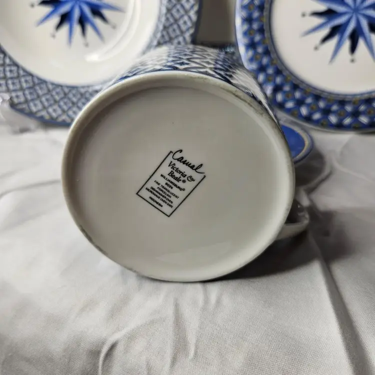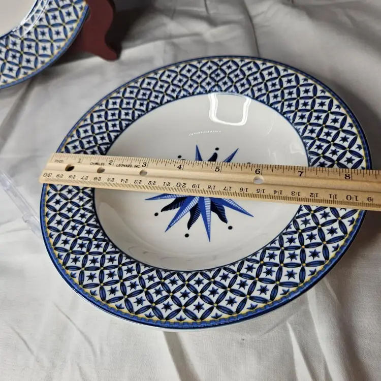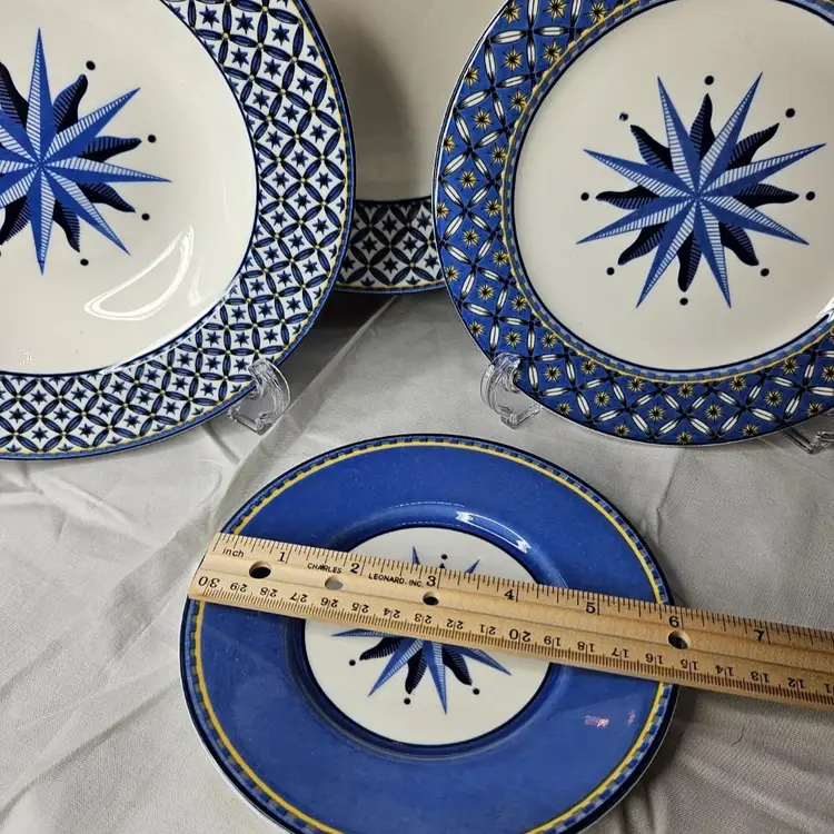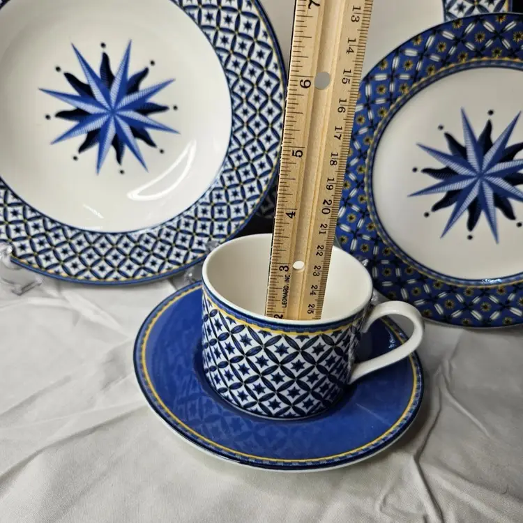 Crafted In Indonesia* Discontinued Pieces Oven Safe, Dishwasher Safe, Microwave Safe Set Pieces----------------->>> 1 - Flat Cup & Saucer Set 2 1/2 in, 6 1/4" SAUCER 1 - Dinner Plate 10 3/4 in 1 - Salad Plate 7 3/4 in 1 - Rim Soup Bowl 8 3/4 in
