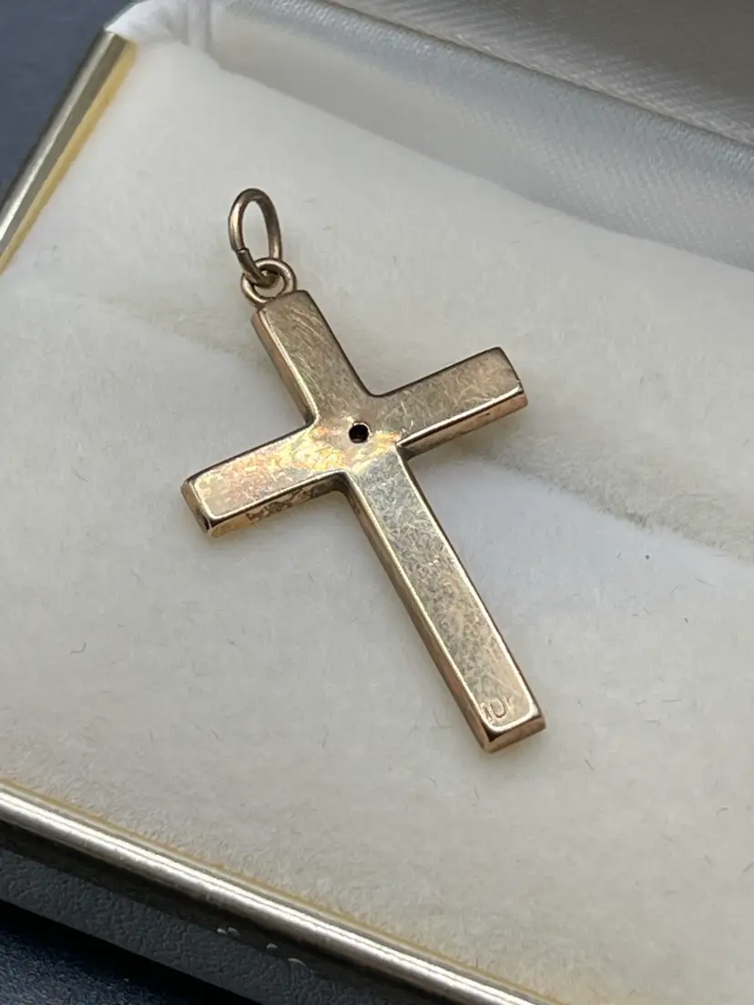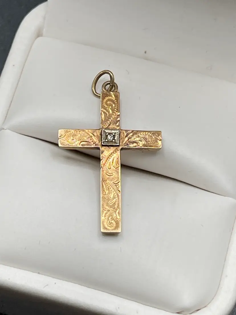 This cross exudes antique charm with its etched floral or scroll-style patterning—all likely done by hand—and the subtle glint of a diamond framed in a square setting.