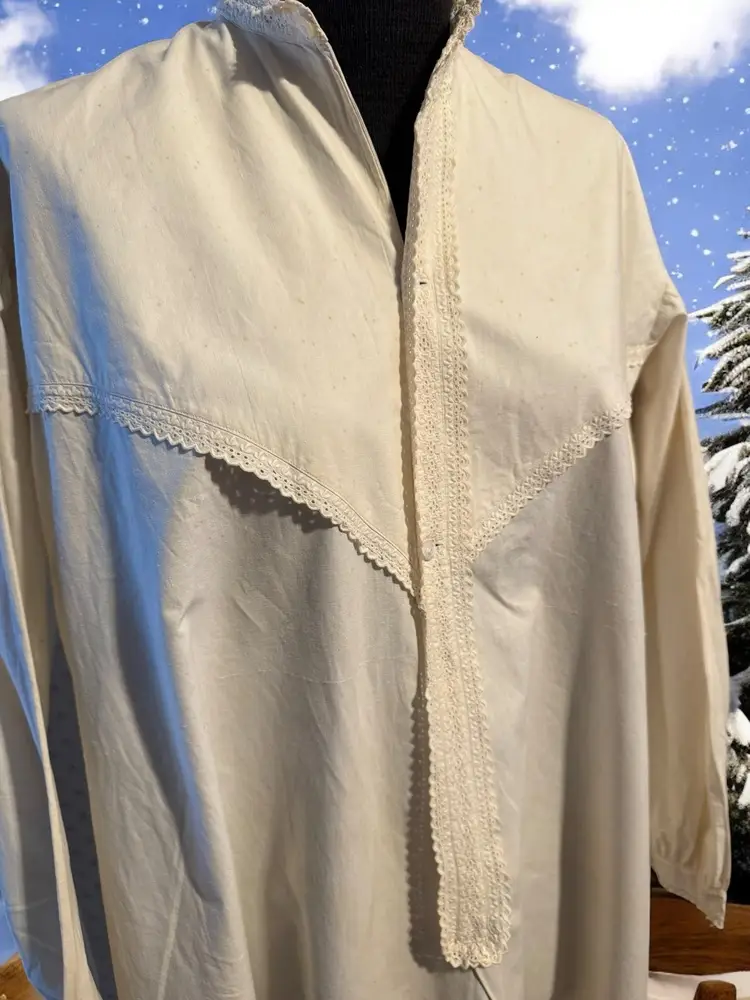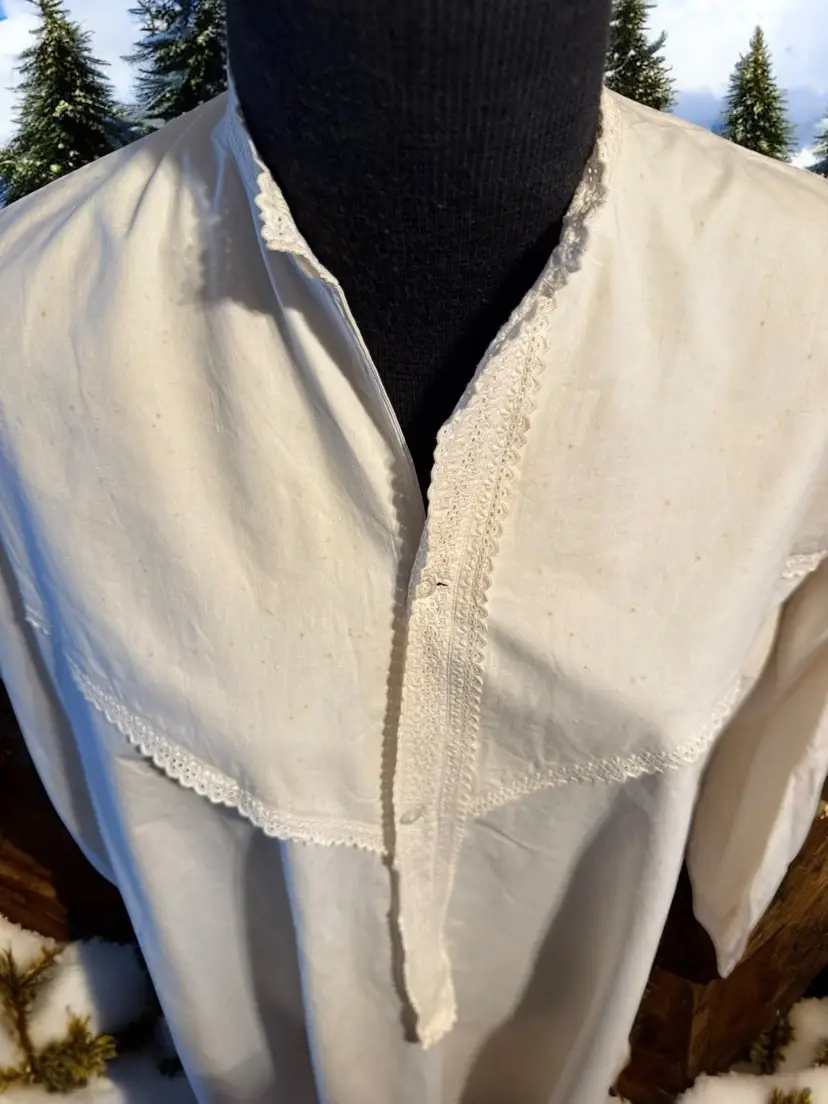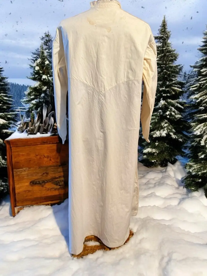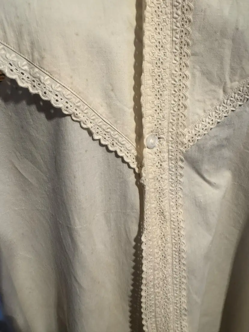 This 1860's Victorian era Sz lg robe , nightgown .. is made from a medium weight cotton. It buttons from neck midway down with small milky detailed white glass buttons. It has the drop shoulders with piping in the armhole seams and narrow ruffles on the cuffs and neckband done in a scalloped eyelet design.. has an opening at the waist below the buttons … the robe has been treated and alot of the foxing and other stains have come out .. there is still some minor here or there .. but quite amazing condition to be from the 1870’s !! and one on the back as shown in pic .. bias cut , measurements are 42 bust, 46 waist , 58 in hips , 21 in sleeve and 49 in long
