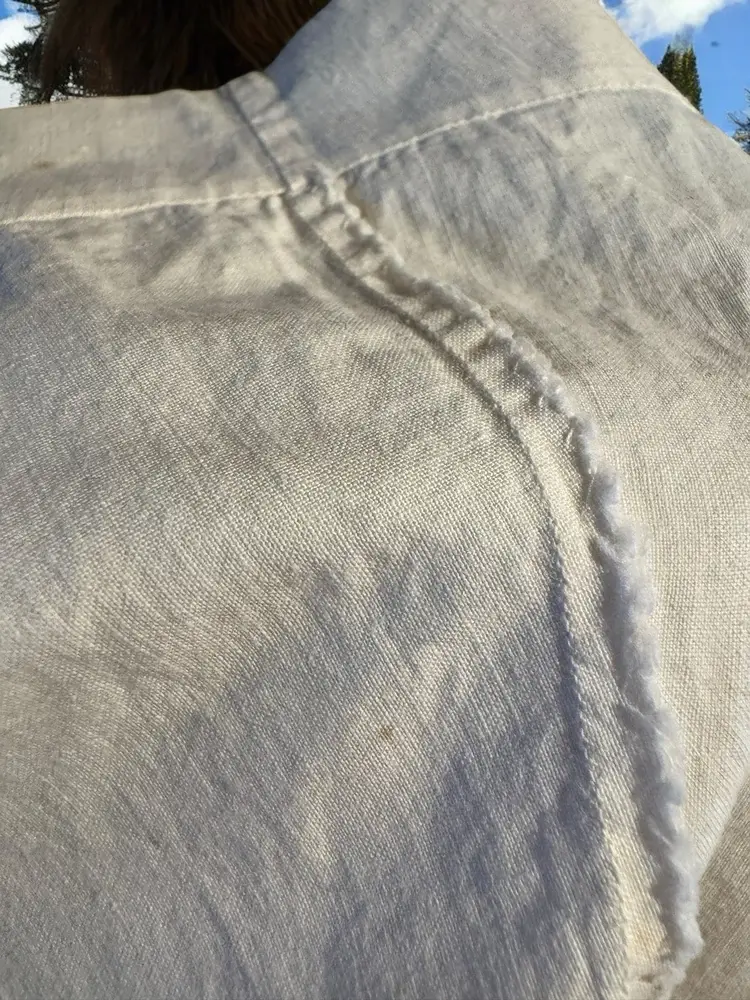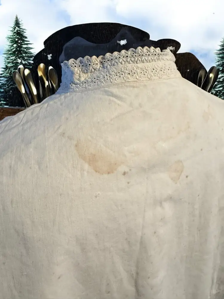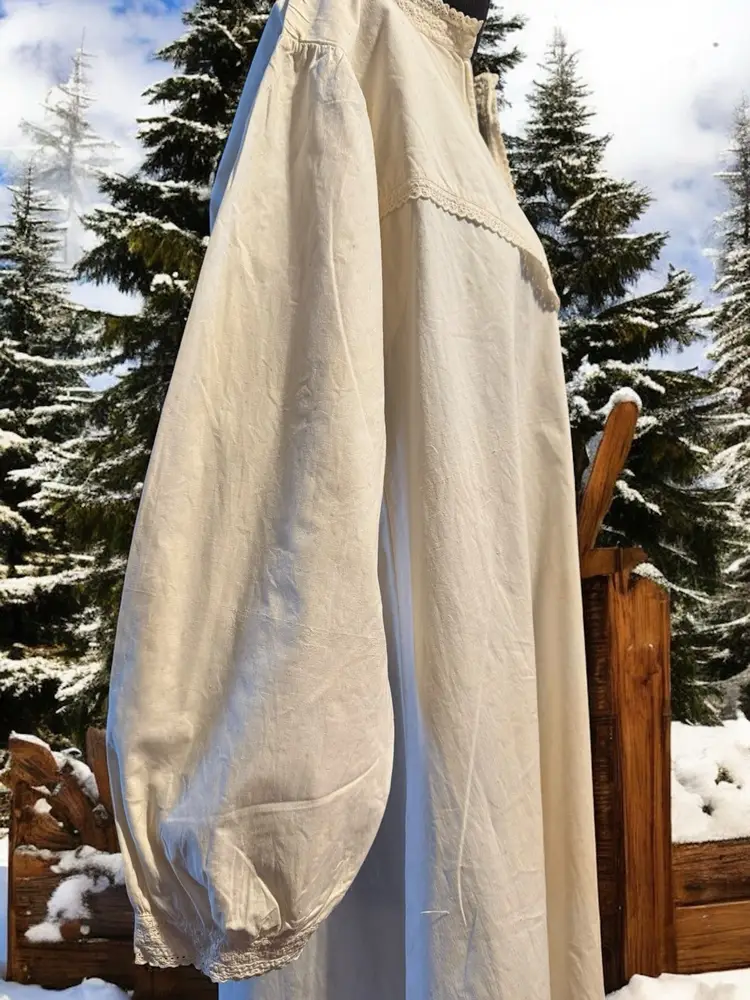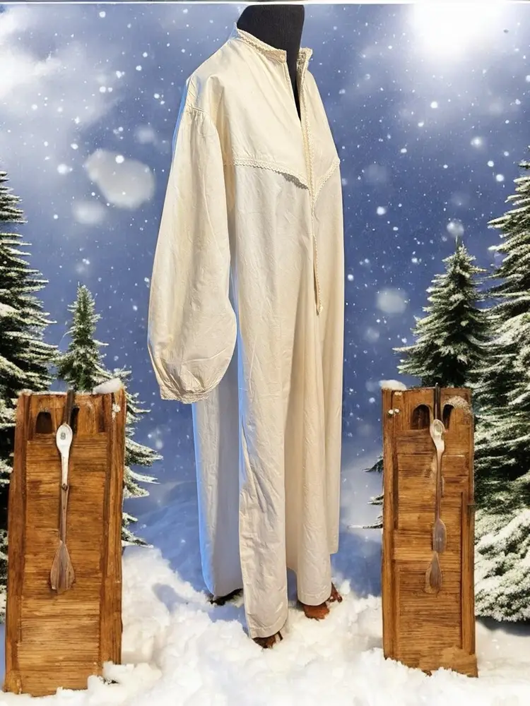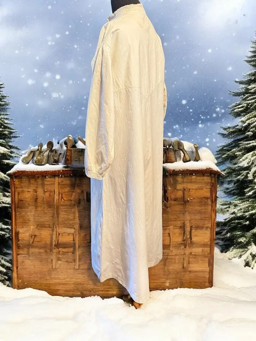 This 1860's Victorian era Sz lg robe , nightgown .. is made from a medium weight cotton. It buttons from neck midway down with small milky detailed white glass buttons. It has the drop shoulders with piping in the armhole seams and narrow ruffles on the cuffs and neckband done in a scalloped eyelet design.. has an opening at the waist below the buttons … the robe has been treated and alot of the foxing and other stains have come out .. there is still some minor here or there .. but quite amazing condition to be from the 1870’s !! and one on the back as shown in pic .. bias cut , measurements are 42 bust, 46 waist , 58 in hips , 21 in sleeve and 49 in long