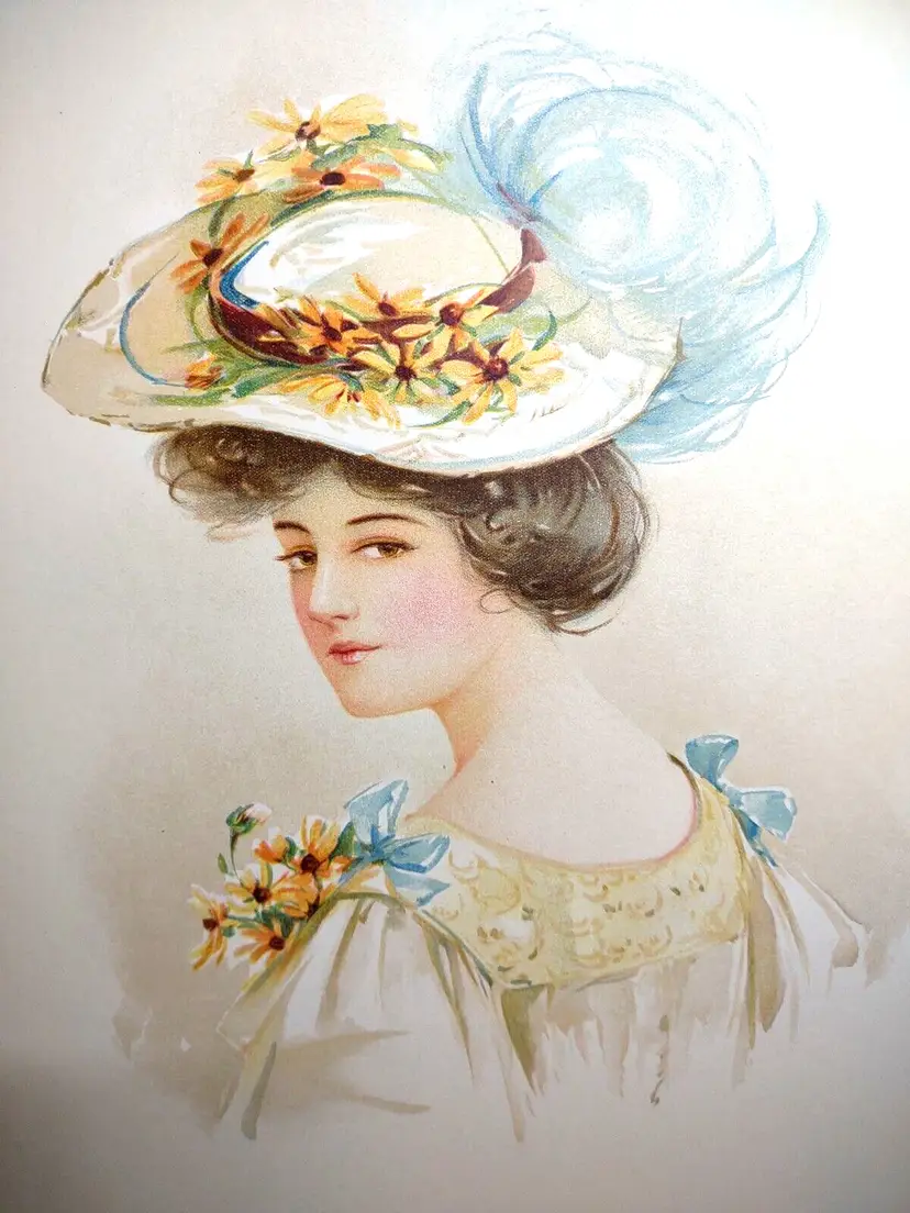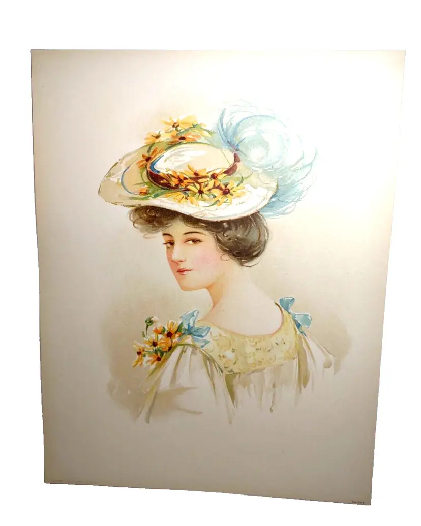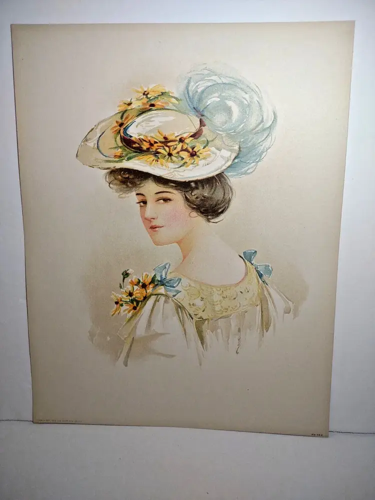 Unit of Sale: Single Piece Artist: Unknown Size: Medium (up to 36in.) Date of Creation: 1900-1949 Item Length: 13 Region of Origin: Unknown Framing: Unframed Listed By: Dealer or Reseller Year of Production: 1908 Width (Inches): 10 Item Height: 13 Style: Vintage Features: Victorian Item Width: 10 in Culture: Unknown Time Period Produced: 1900-1924 Image Orientation: Portrait Signed: No Color: Multi-Color Material: Lithograph, Paper Certificate of Authenticity (COA): No Original/Licensed Reprint: Original Print Surface: Paper Subject: Women Type: Print Height (Inches): 13 Theme: Art, Prints, Victorian, Women, Hat, Flower Hat Production Technique: Lithography Country/Region of Manufacture: United States