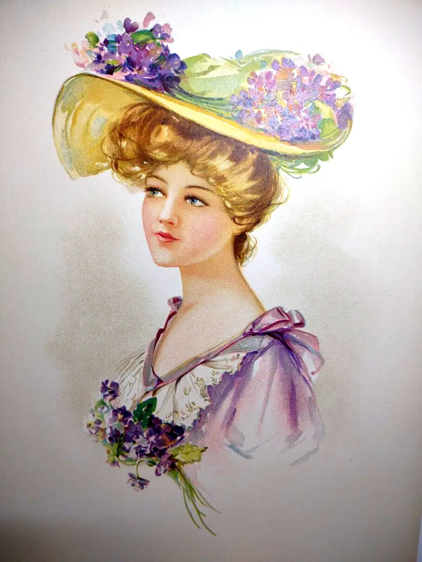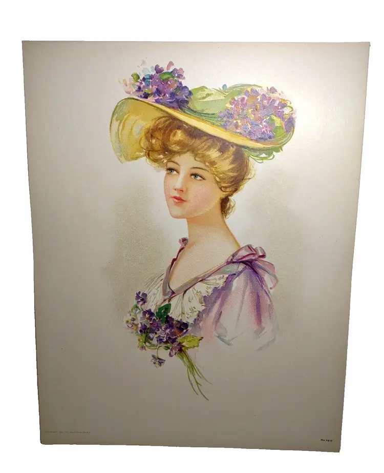 Unit of Sale: Single Piece Artist: Unknown Size: Medium (up to 36in.) Date of Creation: 1900-1949 Item Length: 13 Region of Origin: Unknown Framing: Unframed Listed By: Dealer or Reseller Year of Production: 1908 Width (Inches): 10 Item Height: 13 Style: Vintage Features: Victorian Item Width: 10 in Culture: Unknown Time Period Produced: 1900-1924 Image Orientation: Portrait Signed: No Color: Multi-Color Material: Lithograph, Paper Certificate of Authenticity (COA): No Original/Licensed Reprint: Original Print Surface: Paper Subject: Women Type: Print Height (Inches): 13 Theme: Art, Prints, Victorian, Women, Hat, Flower Hat Production Technique: Lithography Country/Region of Manufacture: United States