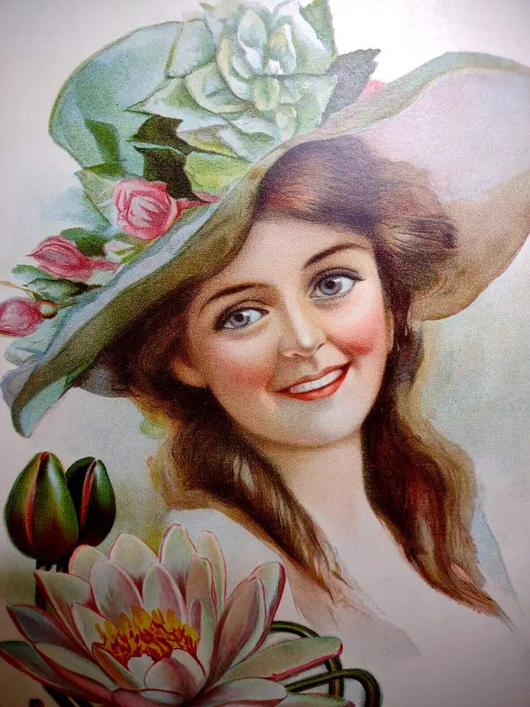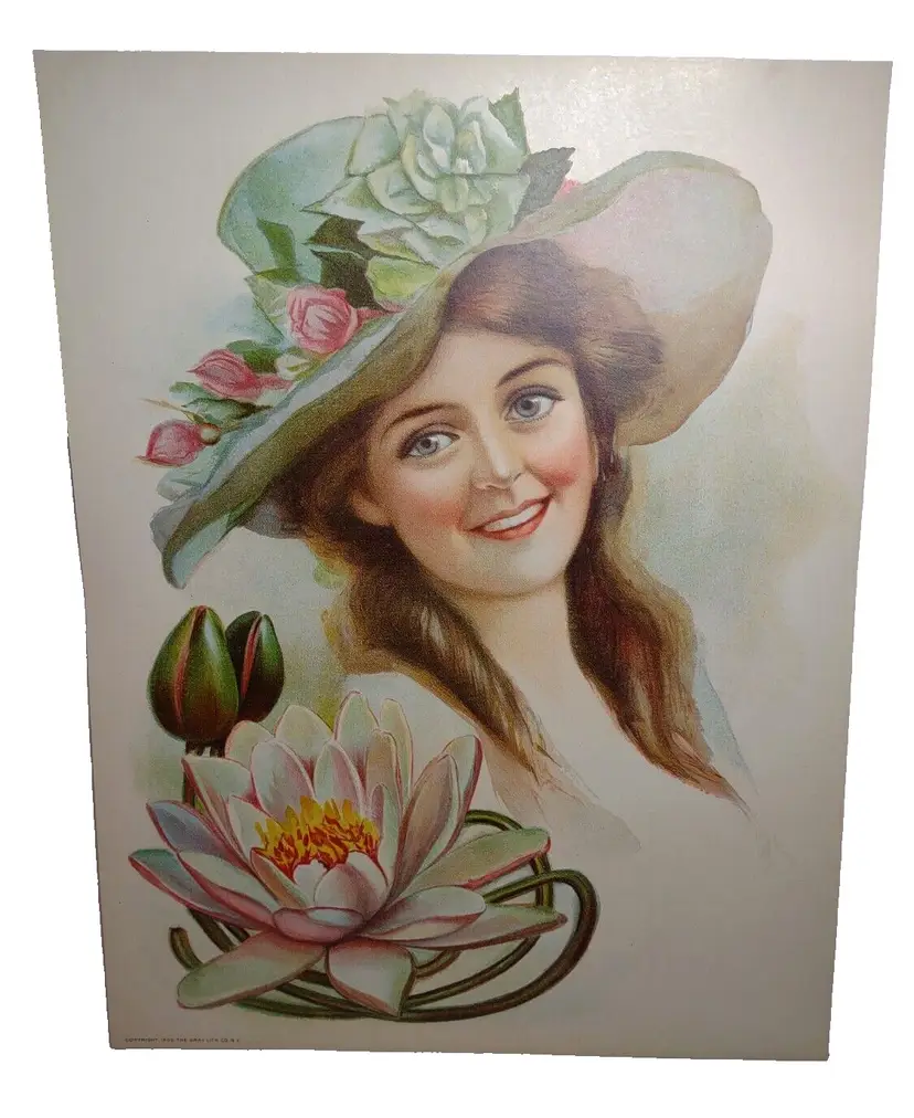 Unit of Sale: Single Piece Artist: Unknown Size: Medium (up to 36in.) Date of Creation: 1900-1949 Item Length: 13 Region of Origin: Unknown Framing: Unframed Listed By: Dealer or Reseller Year of Production: 1906 Width (Inches): 10 Item Height: 13 Style: Vintage Features: Victorian Item Width: 10 in Culture: Unknown Time Period Produced: 1900-1924 Image Orientation: Portrait Signed: No Color: Multi-Color Material: Lithograph, Paper Certificate of Authenticity (COA): No Original/Licensed Reprint: Original Print Surface: Paper Subject: Women, Victorian, Flower Hat Type: Print Height (Inches): 13 Theme: Women Production Technique: Lithography Country/Region of Manufacture: United States