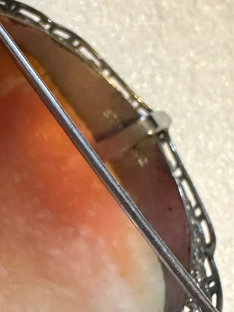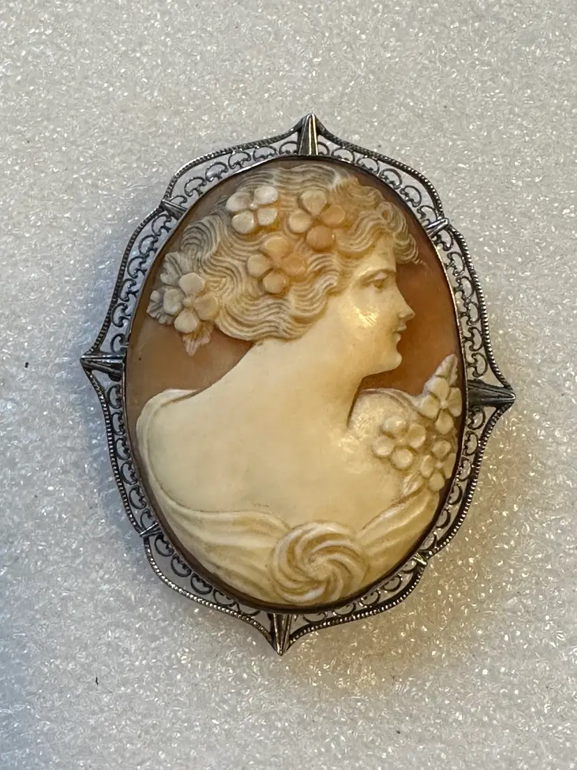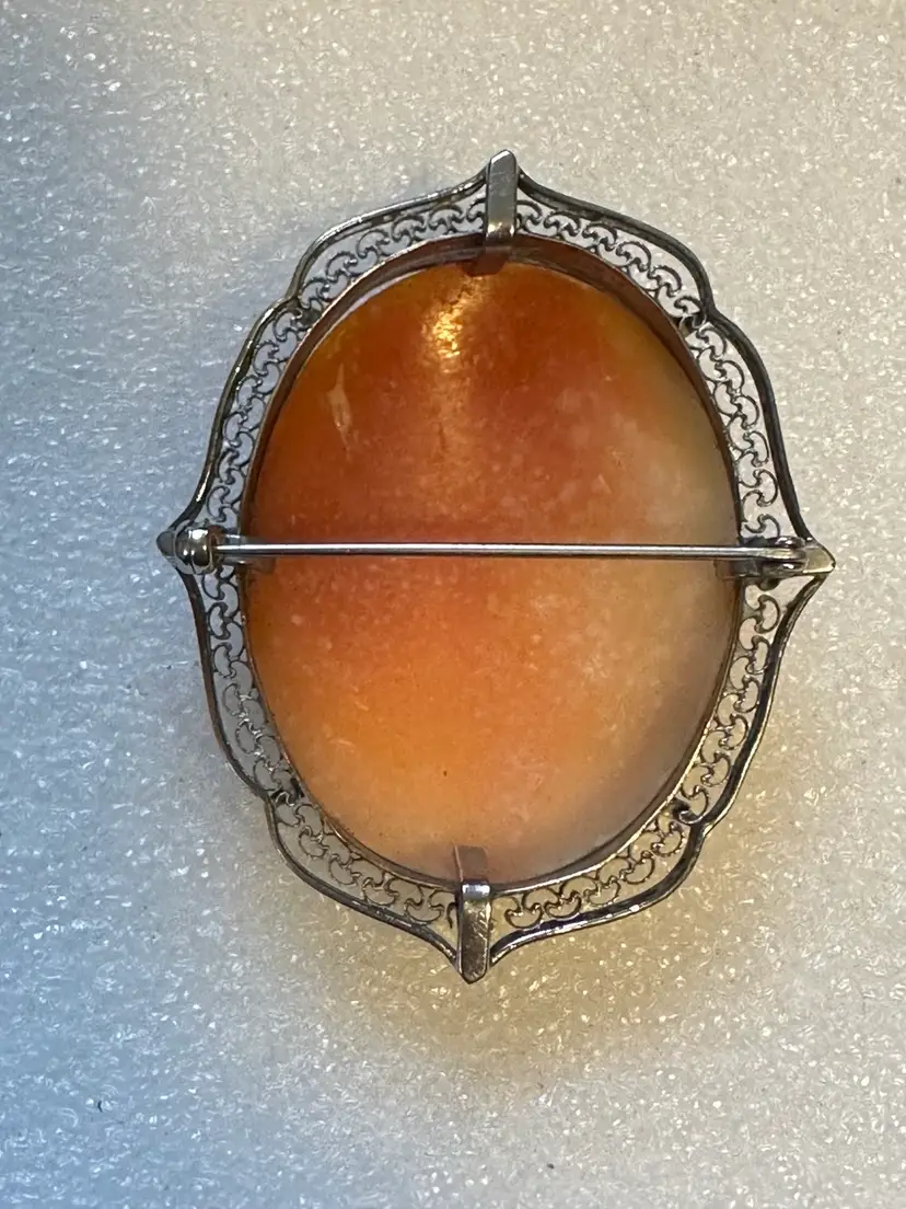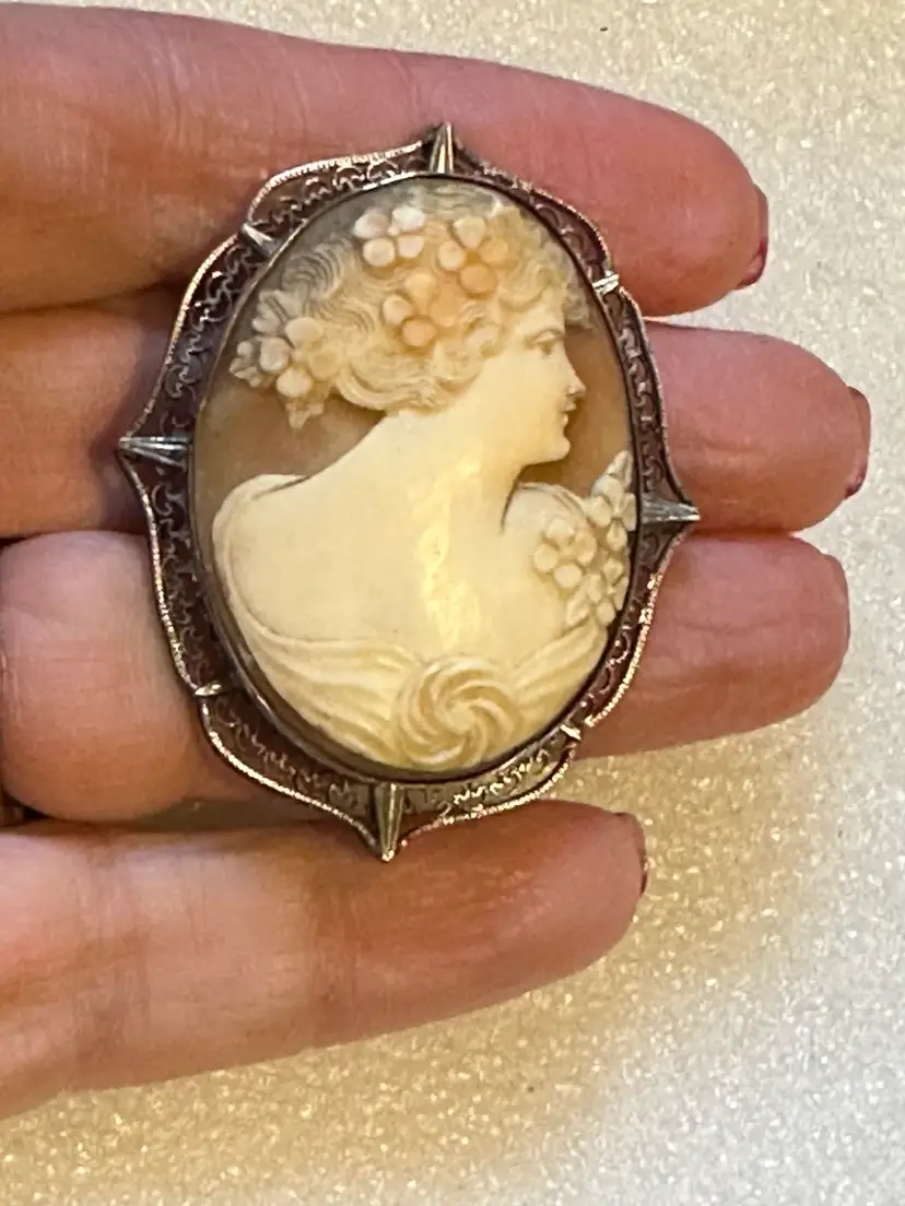 Lovely antique cameo! It is carved shell set in sterling silver frame. Very pretty lady with fine detailing. It measures 2” x 1.5”. Condition is very good.