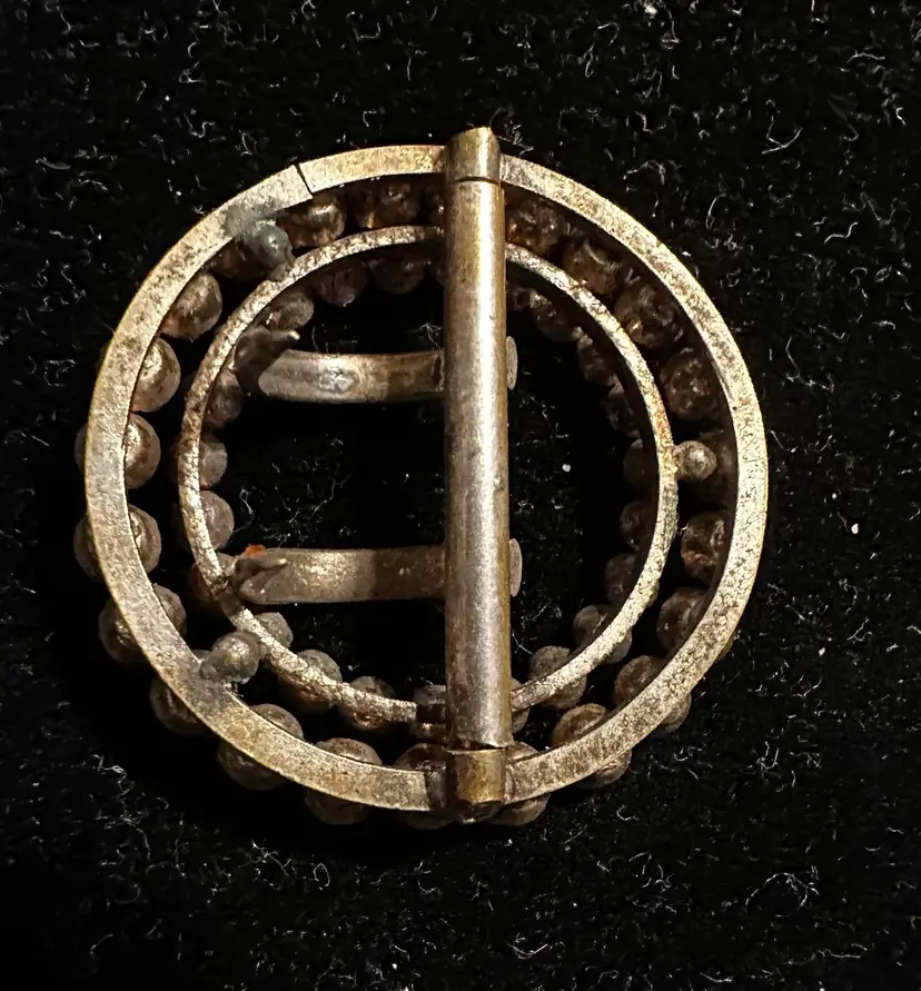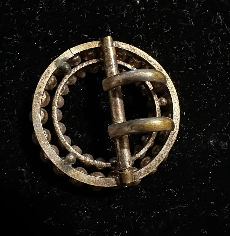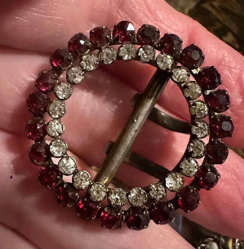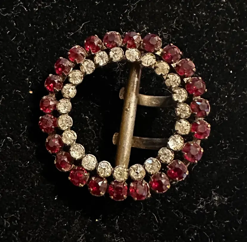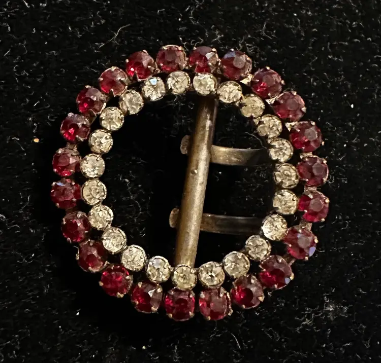 Very sweet antique Victorian buckle is 1.25” in diameter. It is set with red and clear paste stones. It is in very good condition.