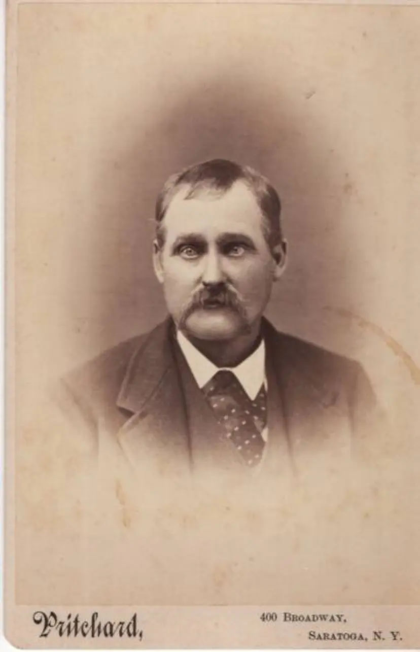 This Victorian cabinet card shows a man with mustache. Look at the eyes, will see the righ one looking right at you, the left is off to the center of face. Very possible the right is a glass eye.