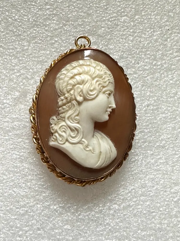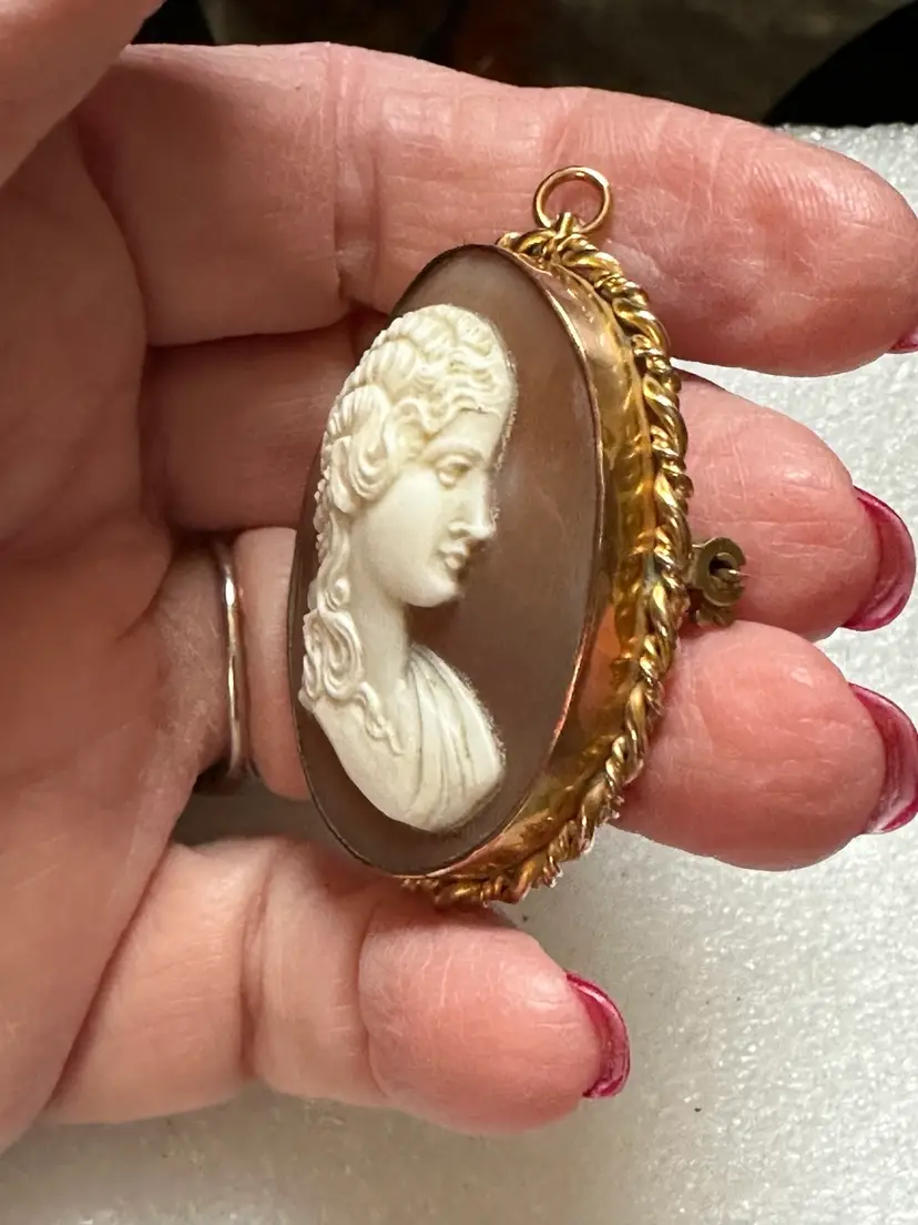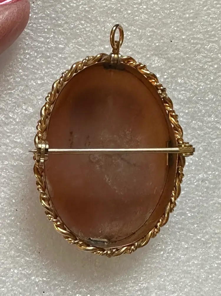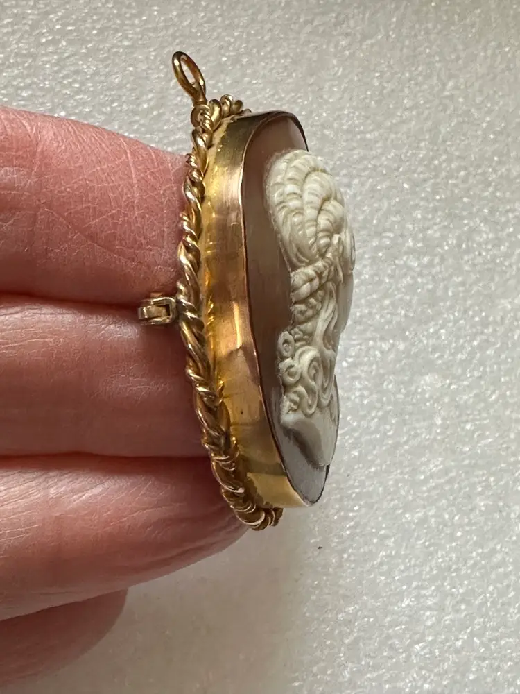 Lovely Victorian carved shell cameo in 14k gold frame. It can be worn as a pin or brooch. It measures 2” x 1 3/8”. It is in excellent condition.