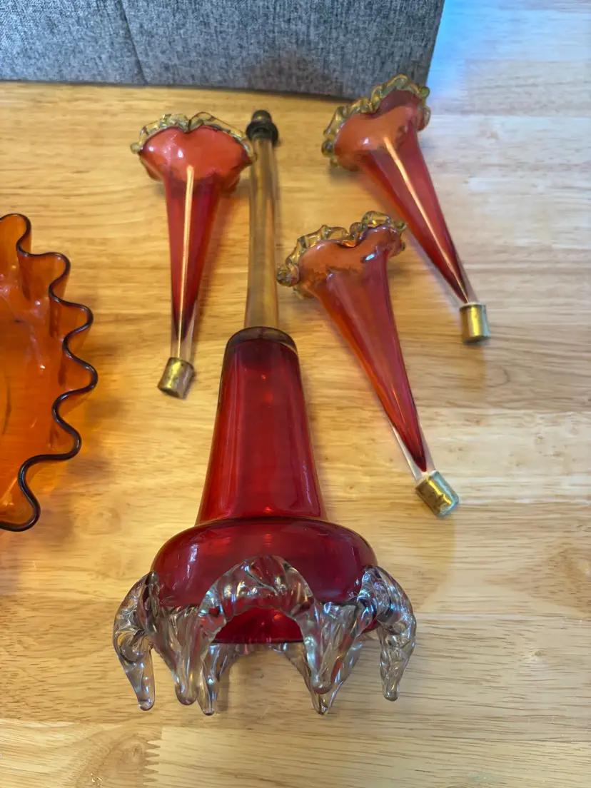 This Victorian Cranberry glass epergne is a stunning decorative vas that features a ruffled pattern. Hand-blown , this art glass piece exudes elegance, and charm The unmarked brand adds to its vintage appeal, making it a unique and eye-catching addition to any collection of glassware.