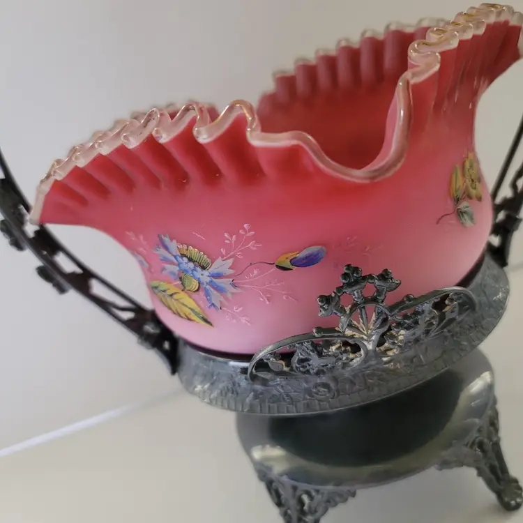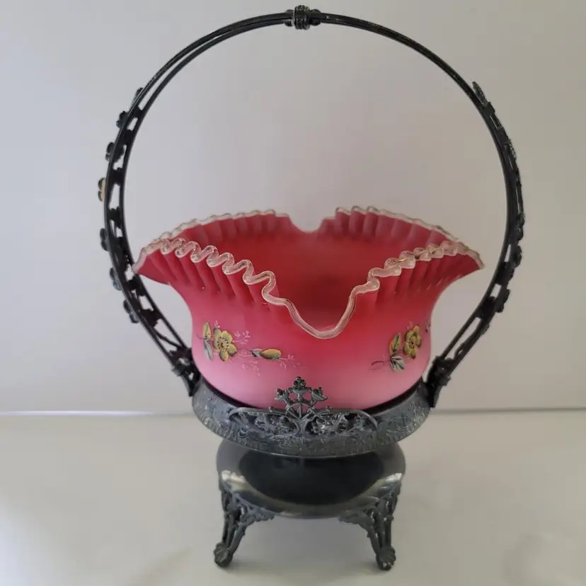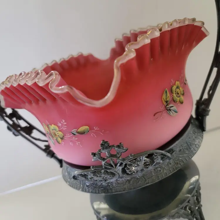 Victorian Fruit / Berry Basket "Wedding Basket" E.G. Webster Silverplate No chips or cracks to glass Hand painted (minor nicks to paint) Silverplate has patina 13" silverplate 4" × 8.5" glass basket