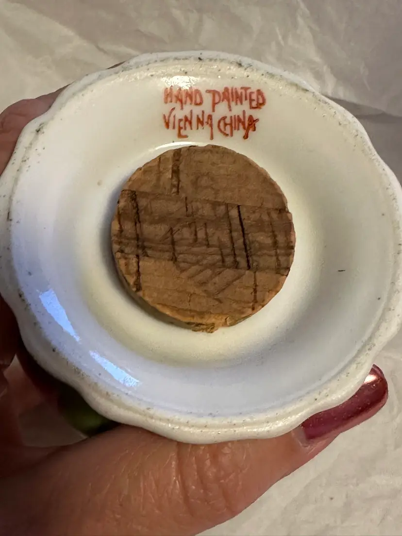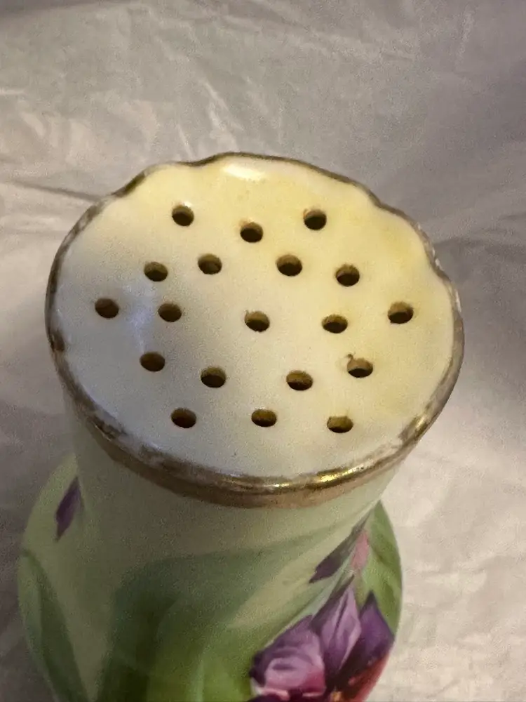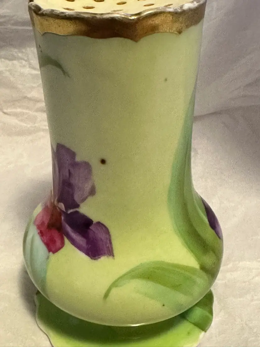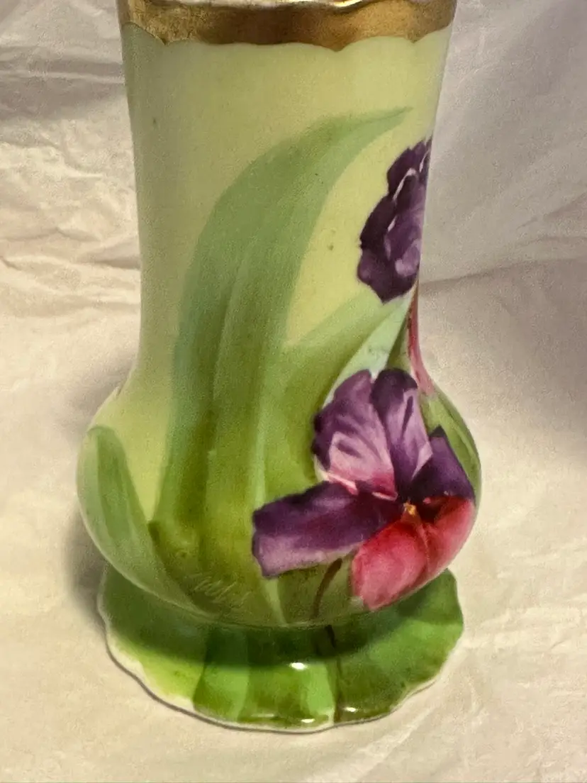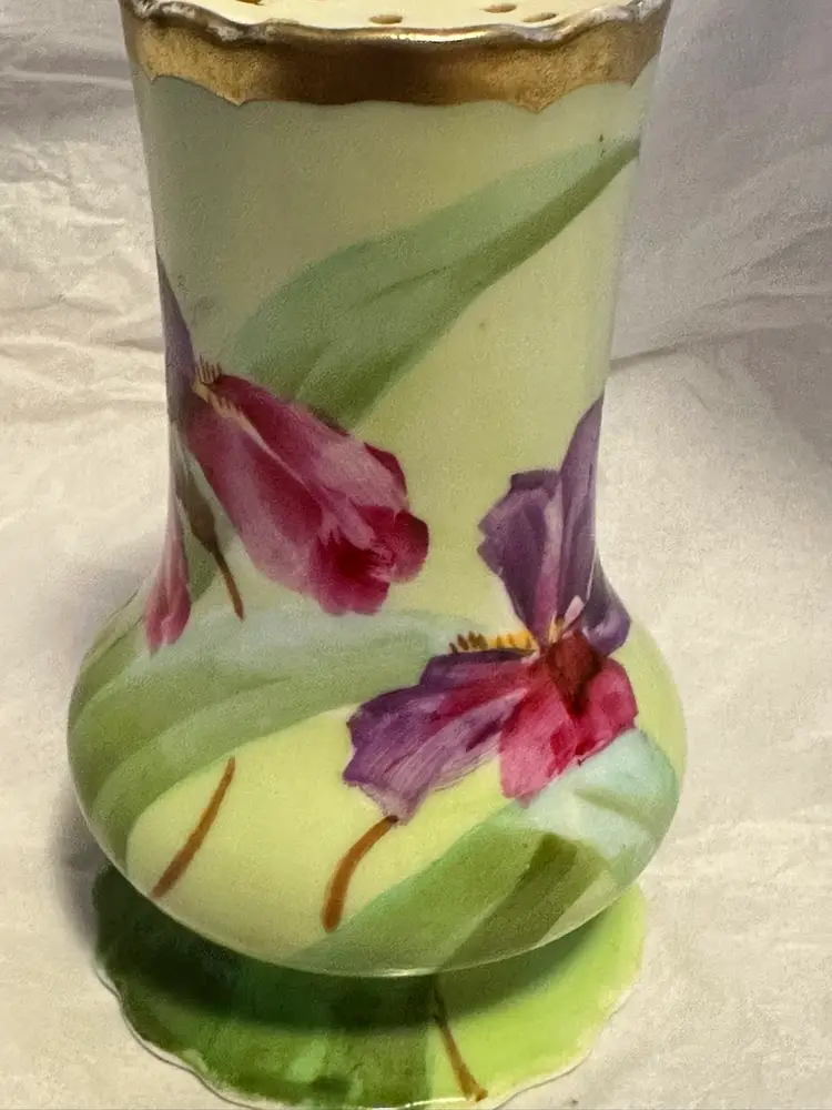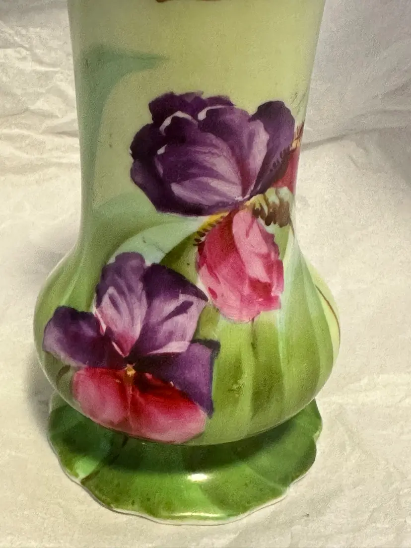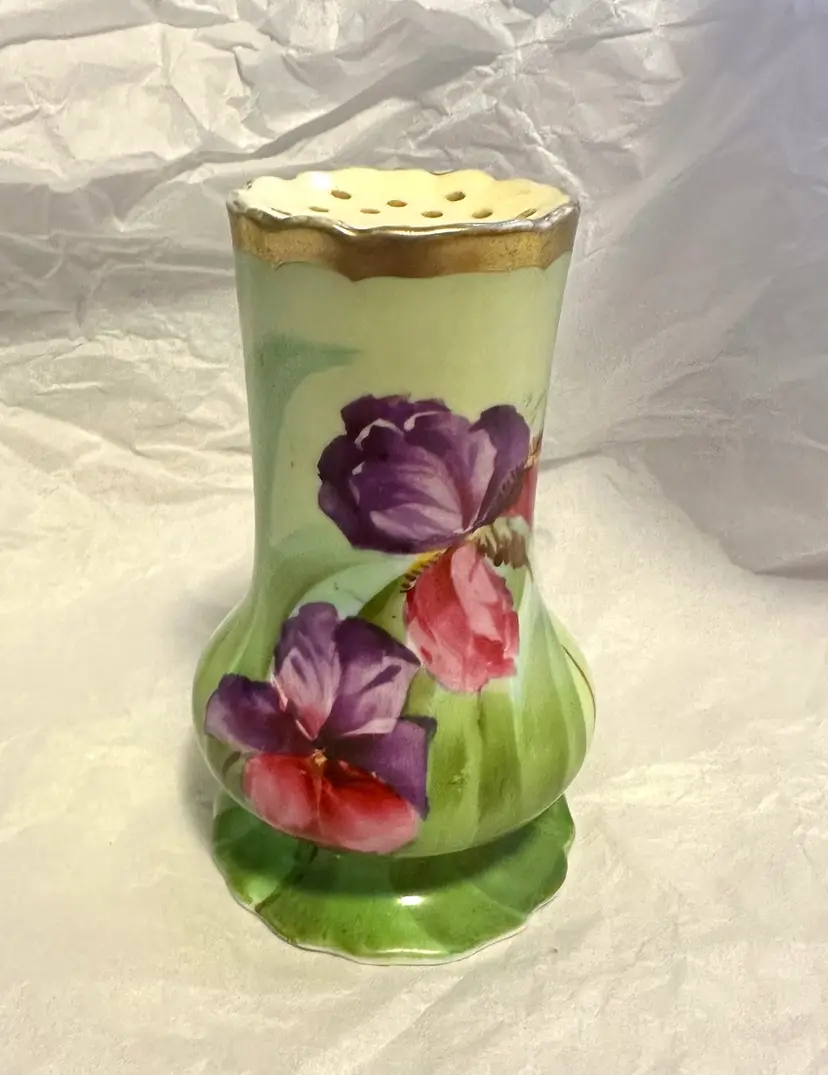 Beautiful antique hatpin holder is porcelain by Vienna China. It is hand painted in an iris floral pattern. It measures 5” tall. 2” across the top, 3” across the bottom. Very good condition.