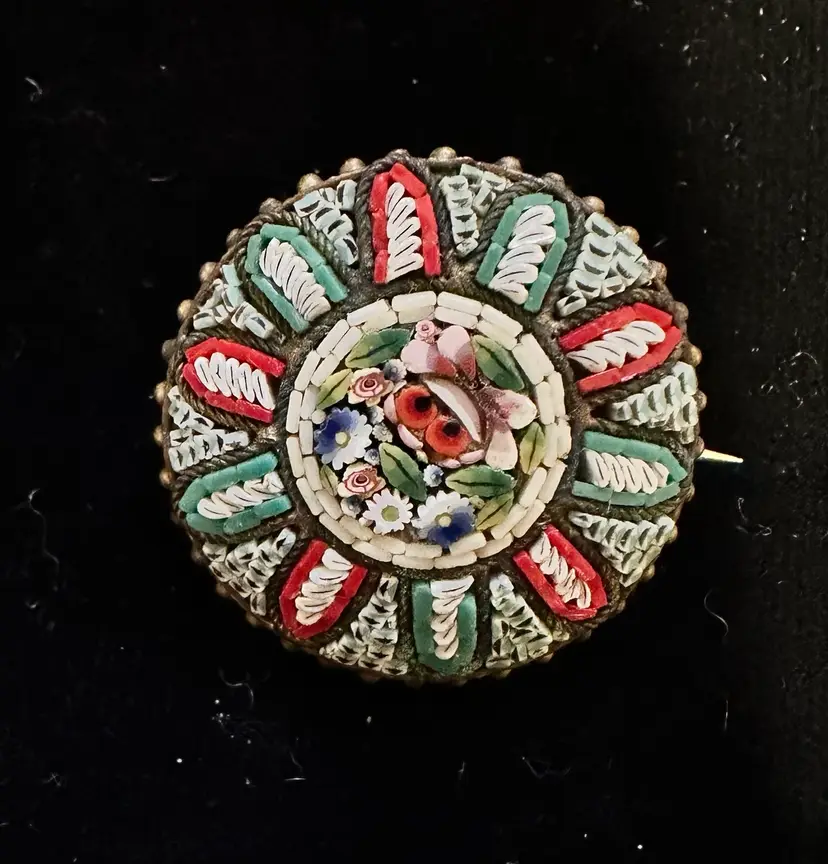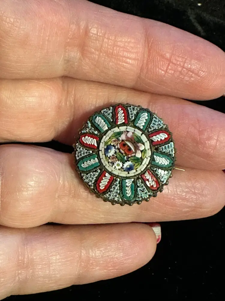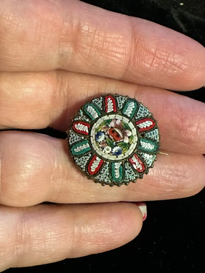 Lovely antique micro mosaic pin with floral design. It is 1”. 1 tiny tile missing.