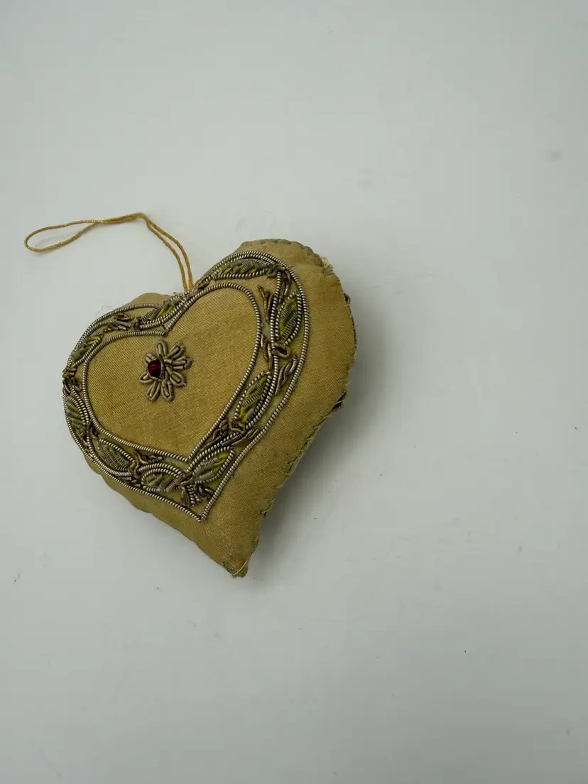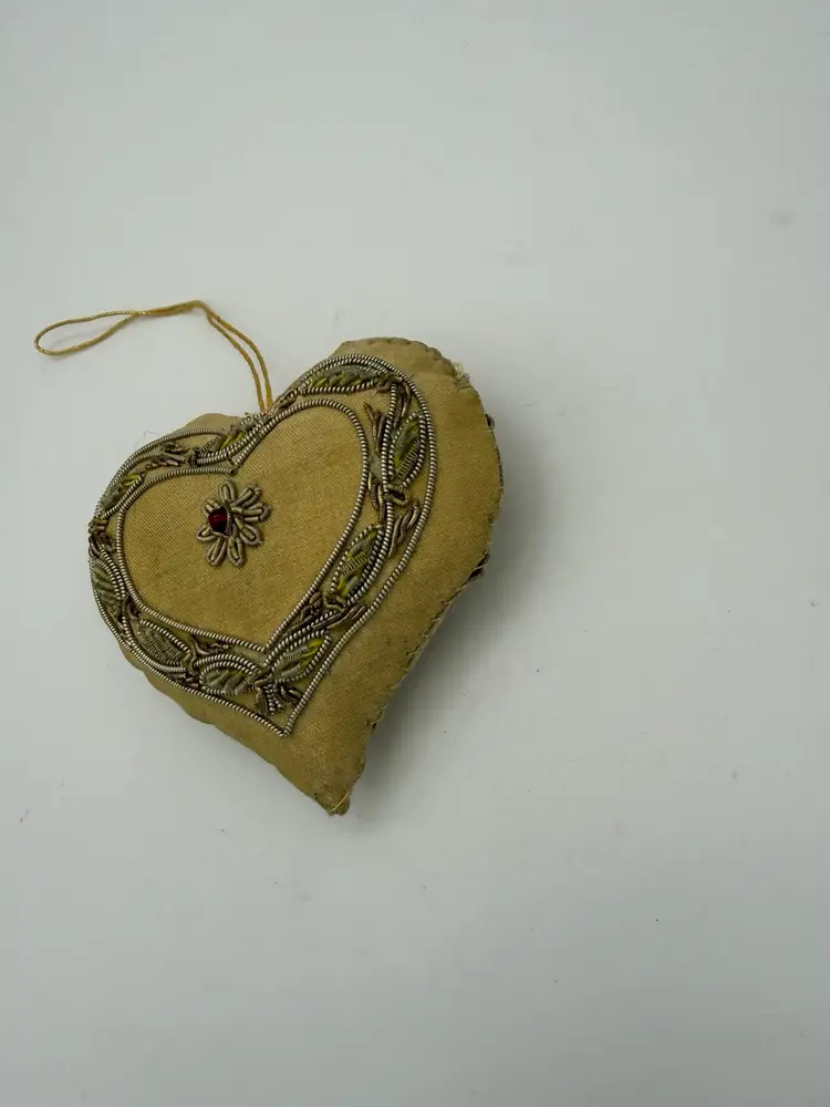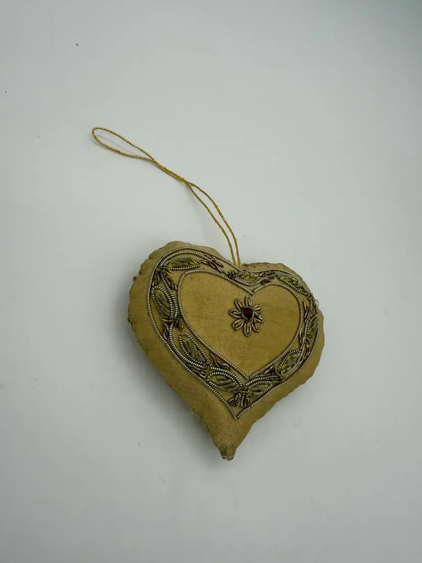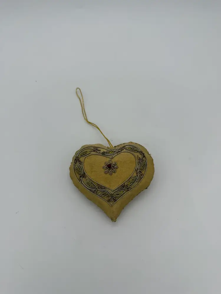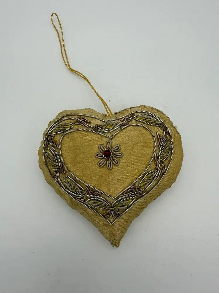 This Victorian Mid Century Hand Embroidered Heart Shaped Zordozi Christmas Ornament is a unique and charming collectible item, perfect for any vintage lover or collector. Handmade with intricate brocade patterns and threaded beads, this small ornament features a Victorian style design with a heart shape, making it ideal for Christmas or all occasions. The beige, silver, gold, and red colors add a touch of elegance to any holiday decor, while the OOAK character and handmade quality make it a special addition to any ornament collection. Made in India, this vintage ornament is a beautiful example of mid-century craftsmanship. Measuring to be 3.5” X 4”