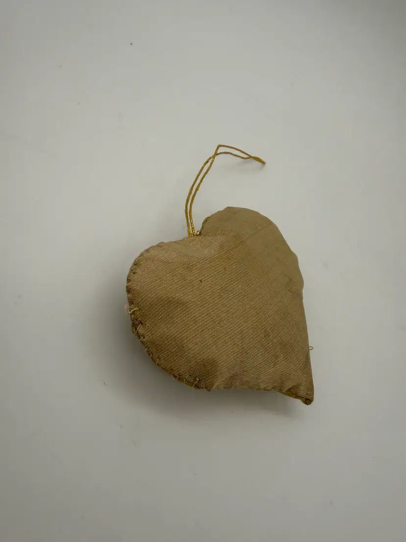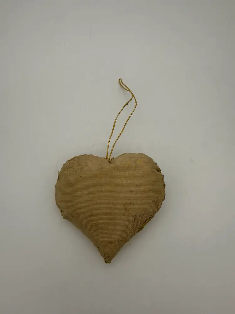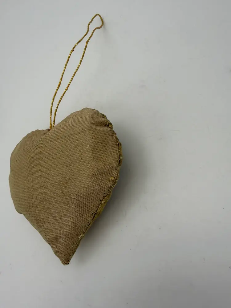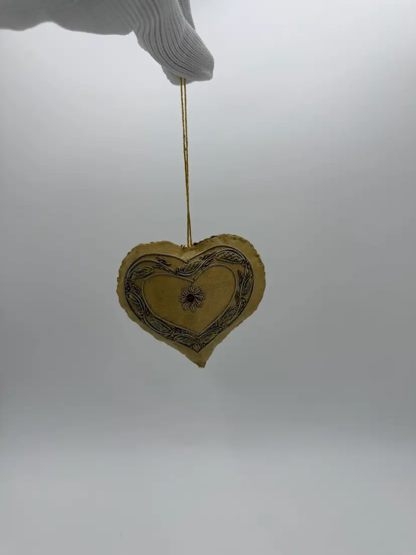 This Victorian Mid Century Hand Embroidered Heart Shaped Zordozi Christmas Ornament is a unique and charming collectible item, perfect for any vintage lover or collector. Handmade with intricate brocade patterns and threaded beads, this small ornament features a Victorian style design with a heart shape, making it ideal for Christmas or all occasions. The beige, silver, gold, and red colors add a touch of elegance to any holiday decor, while the OOAK character and handmade quality make it a special addition to any ornament collection. Made in India, this vintage ornament is a beautiful example of mid-century craftsmanship. Measuring to be 3.5” X 4”
