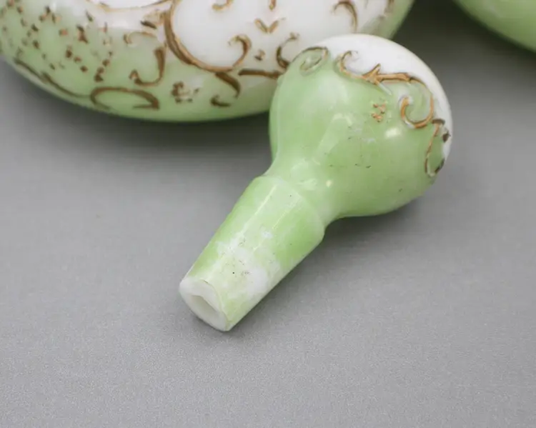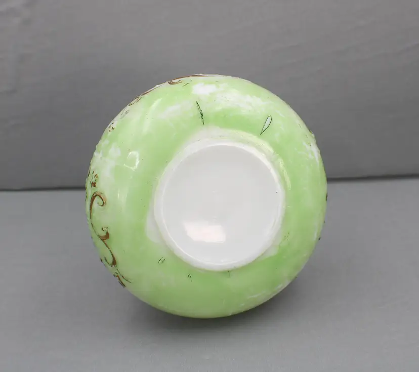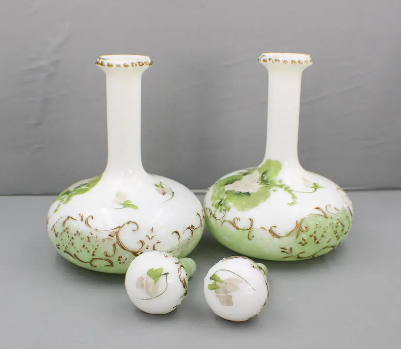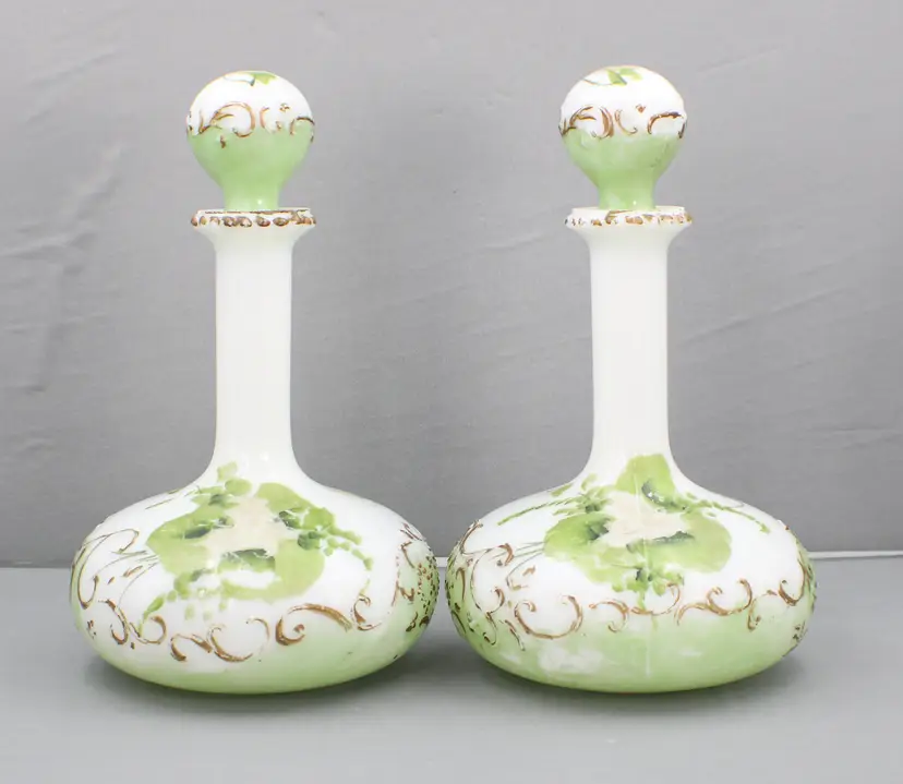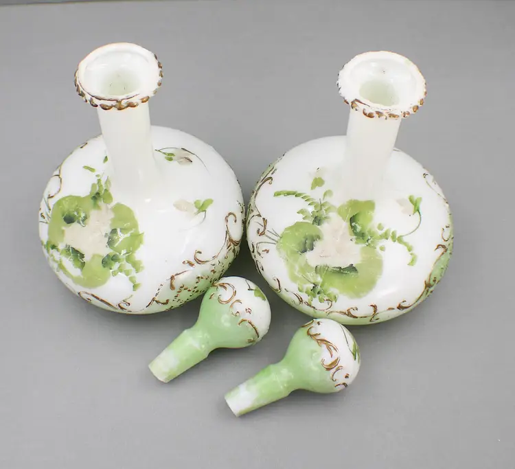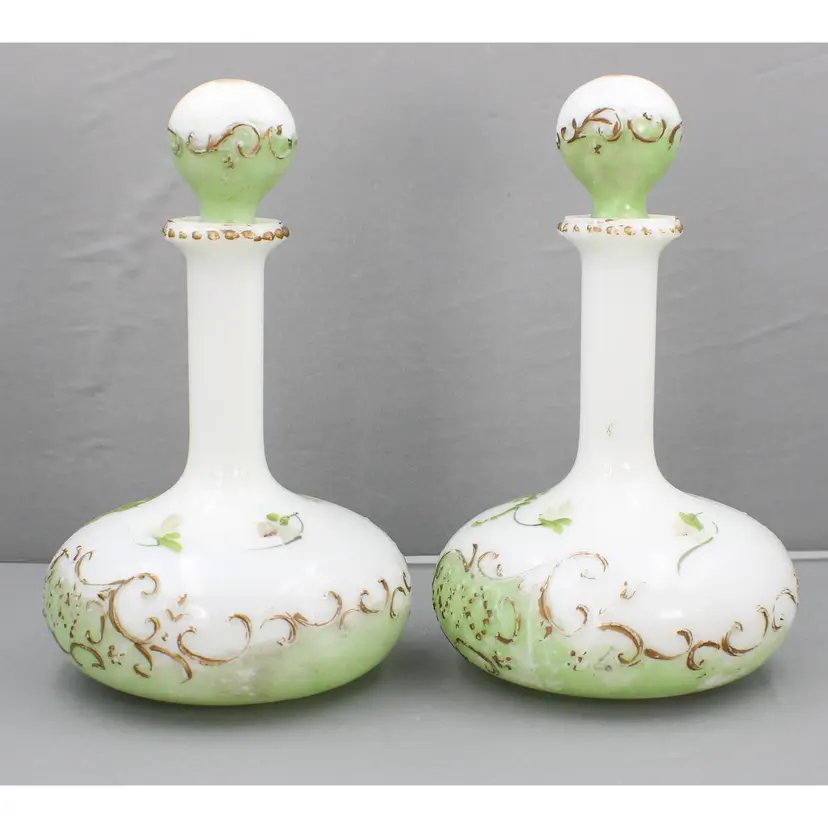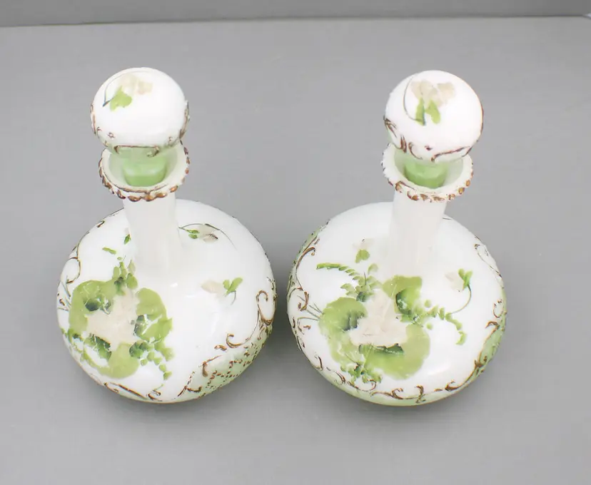 A Beautiful Pair of Hand Painted Victorian Milk Glass Barber Bottles/Perfume Vanity Bottles. These milk glass bottles/ evoke nostalgic elegance in colors of white, soft green and gold. The bottles are 9 1/2" H (with stoppers) x 5 3/4" diameter(at the base). Stoppers fit nicely, although one sits a little higher. One stopper has a chip on the edge (see photo). The gold gilding and the flower pattern have some wear, which is to be expected for their age.
