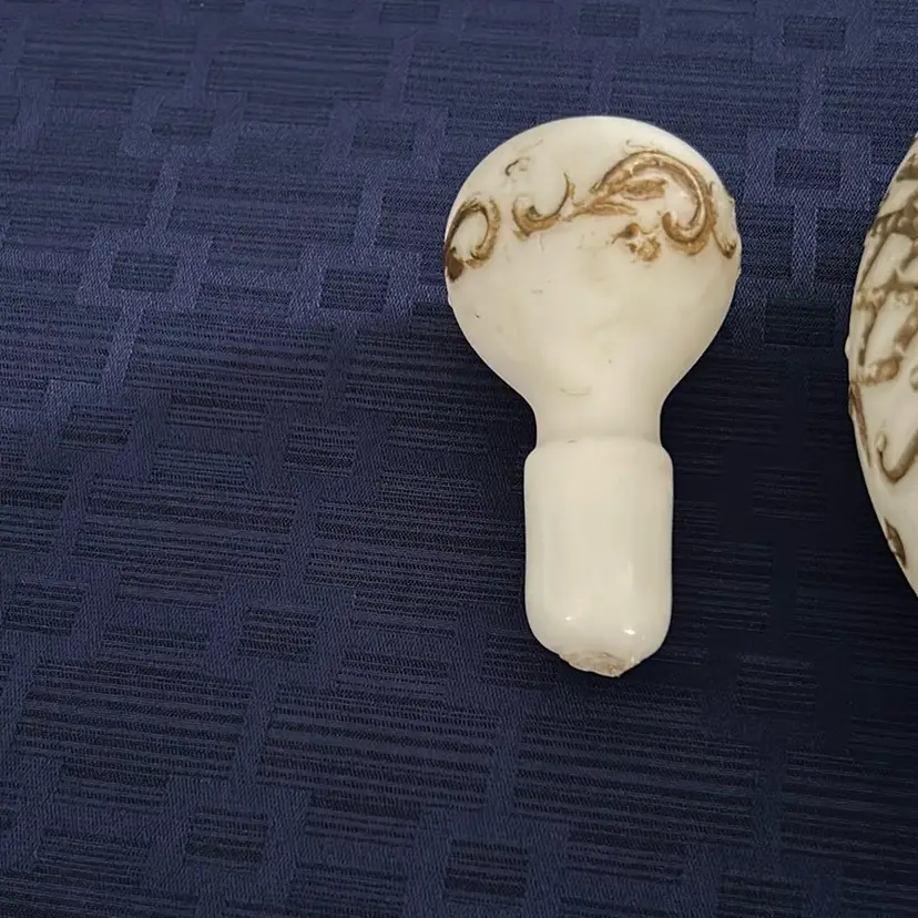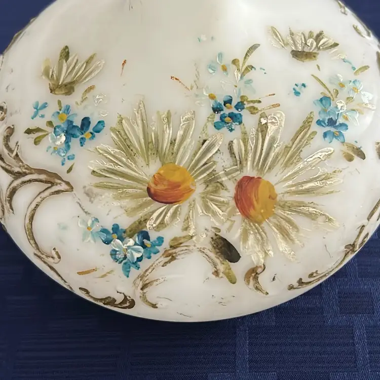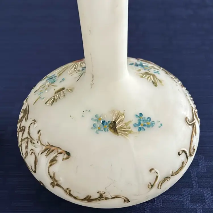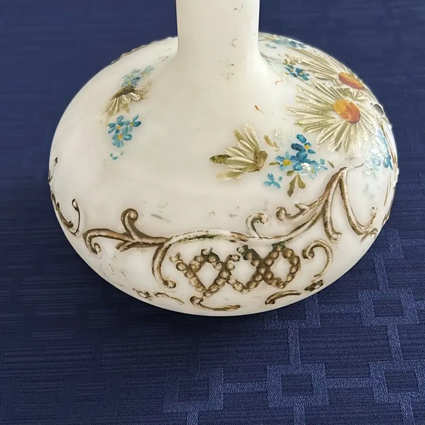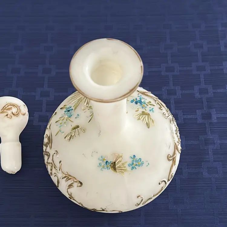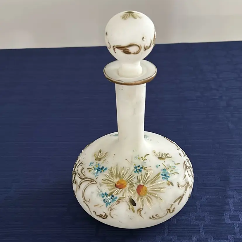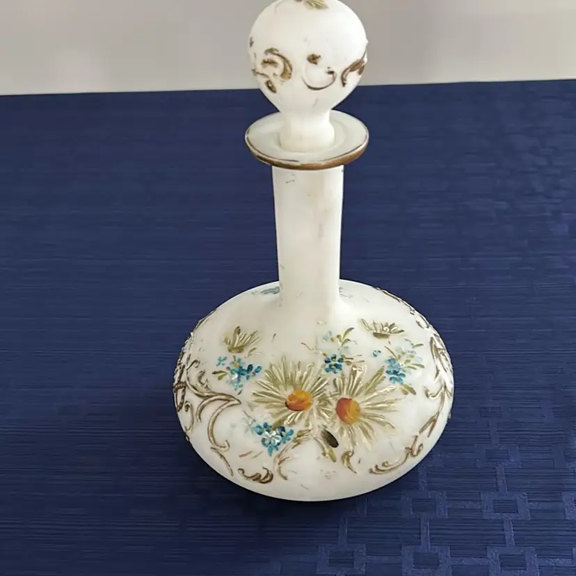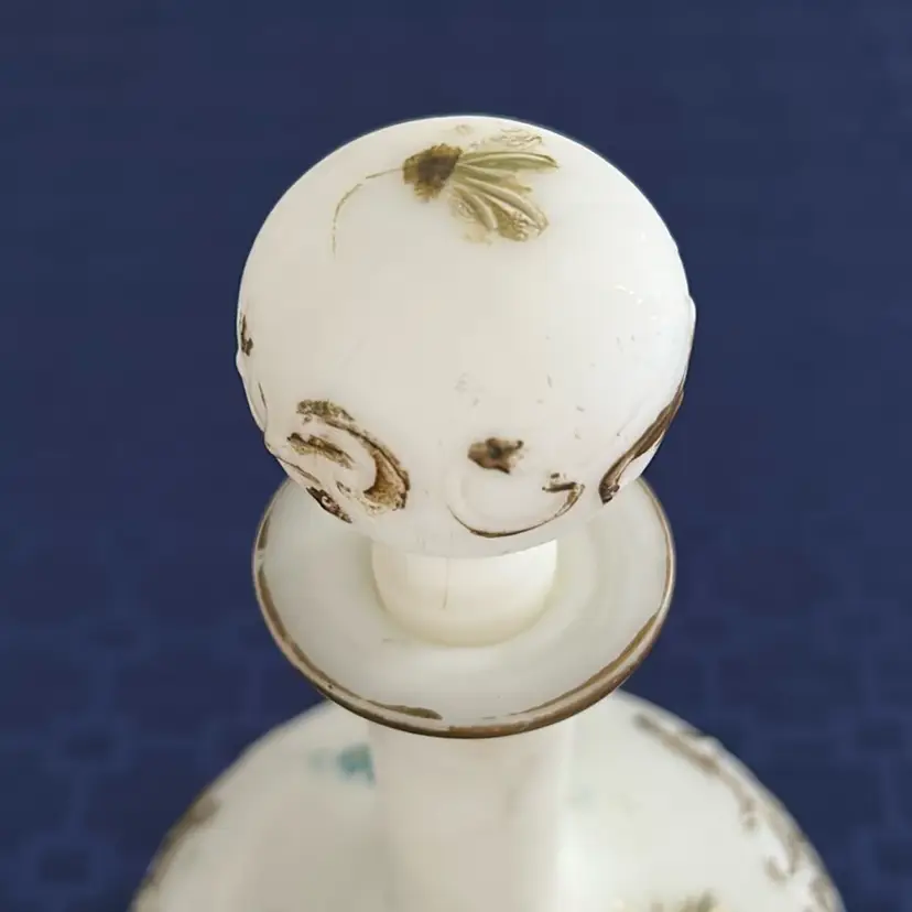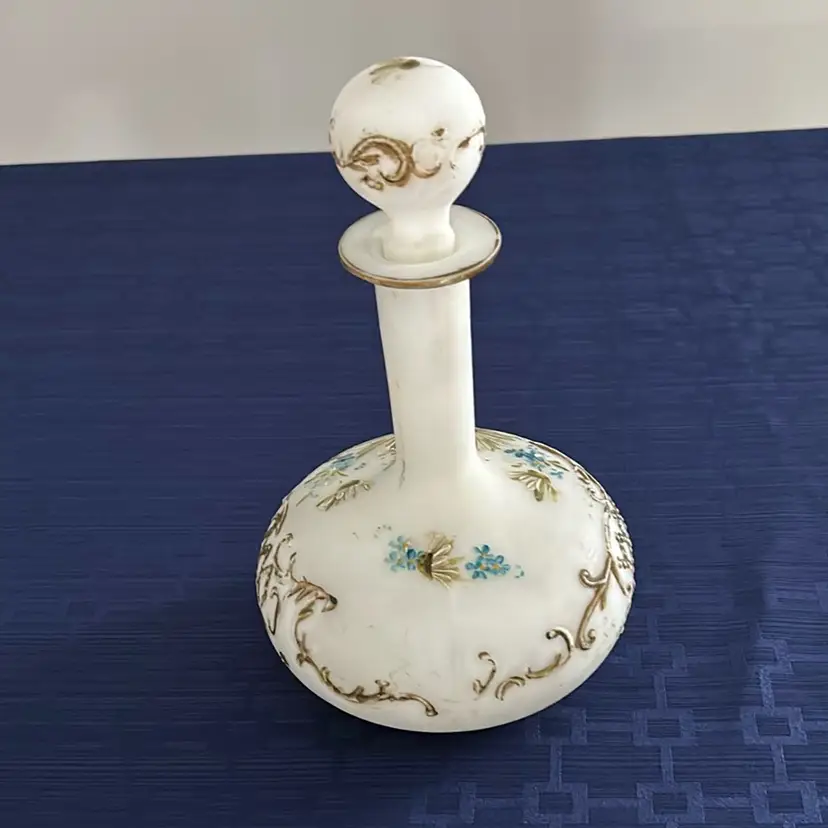 Beautiful Victorian, milk glass, barber decanter. Has slide imperfections in the paint, but still a beautiful piece. See the pictures. 9.5 inches high. Beautiful decor piece for any home.
