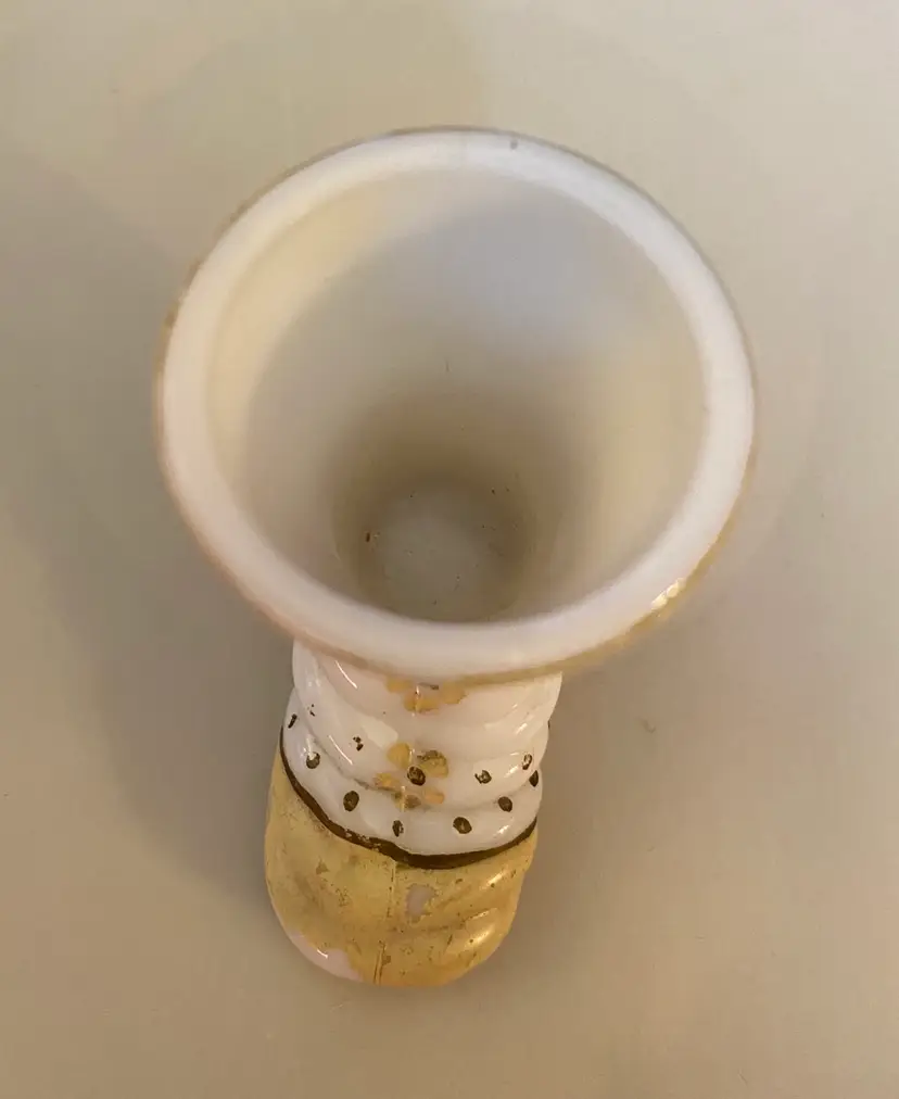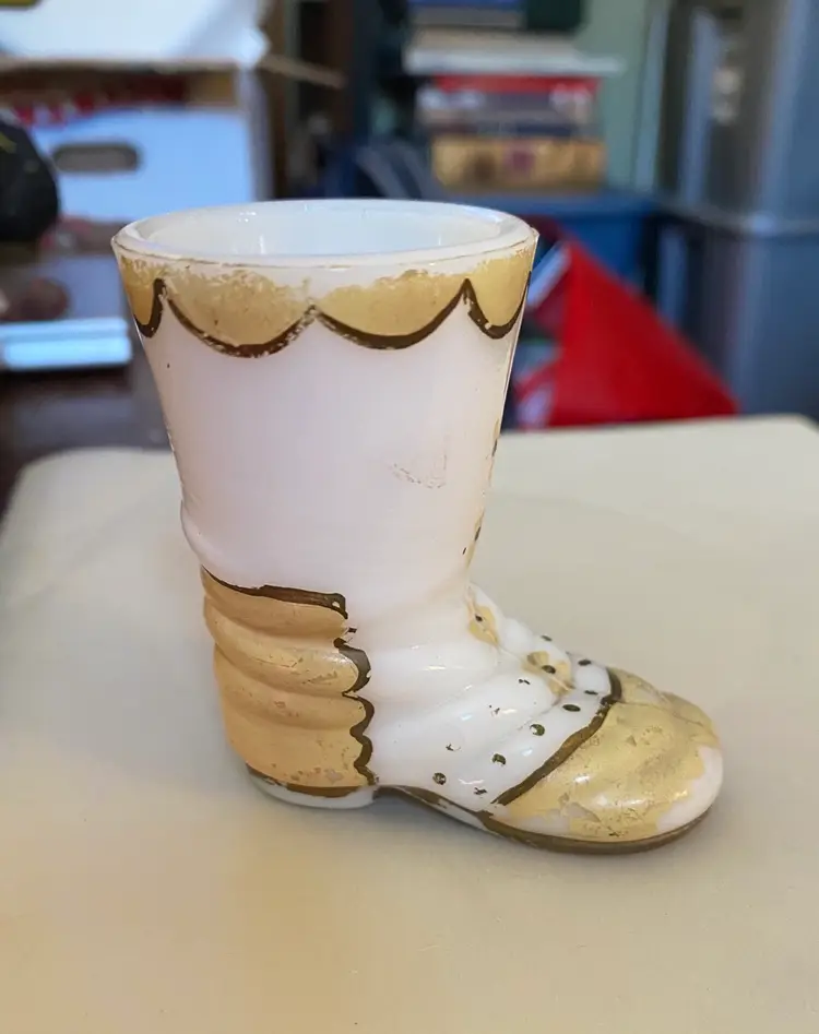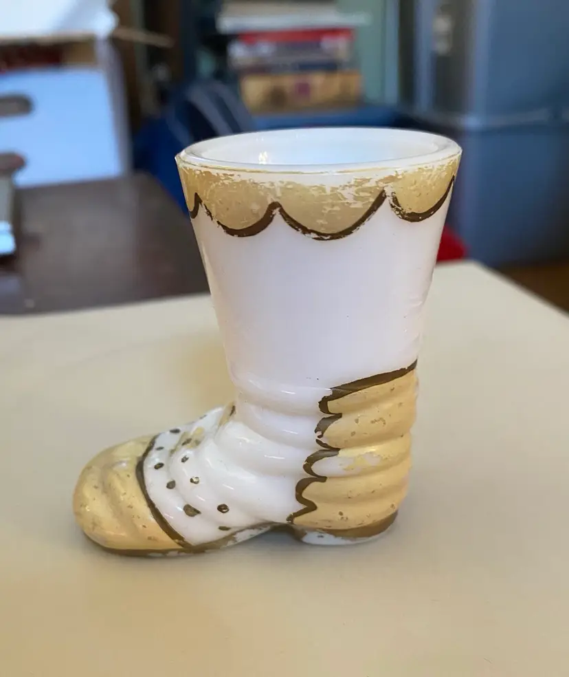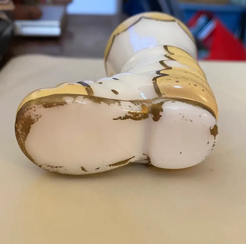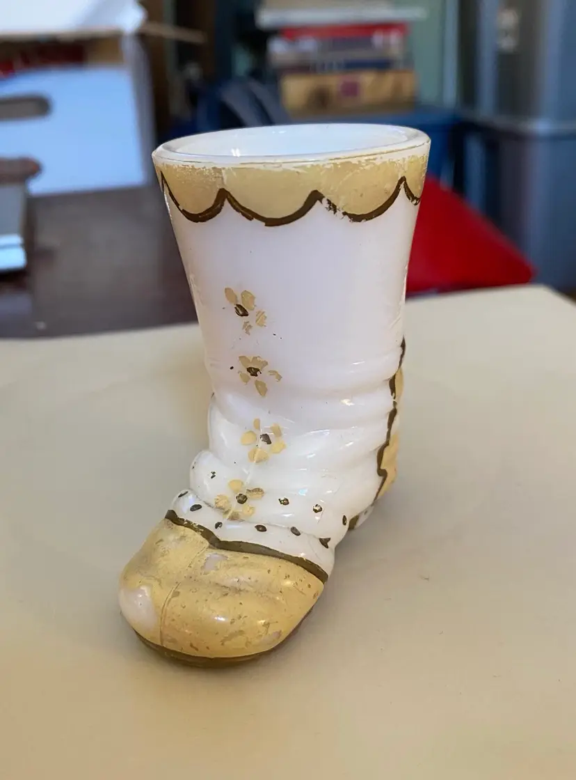 Sweet antique toothpick holder in the shape of a boot. It has been painted along time ago. It is 2 3/4” tall. No chips, cracks or repairs. Very good condition.