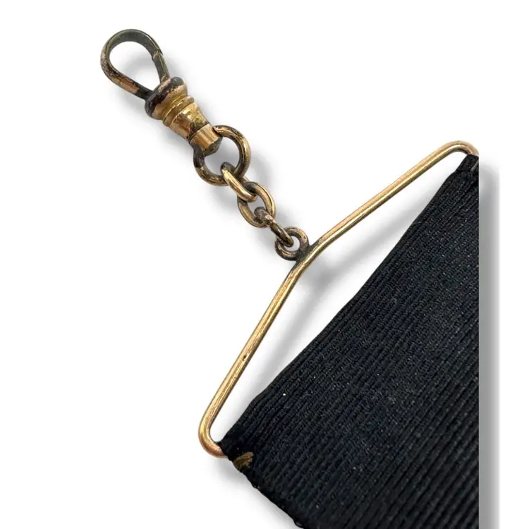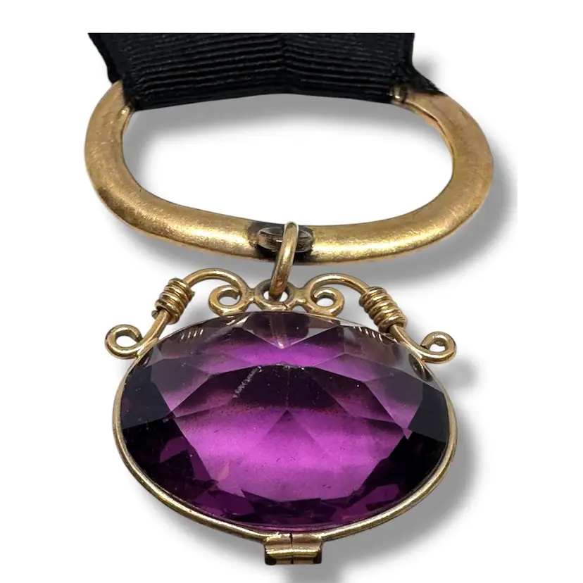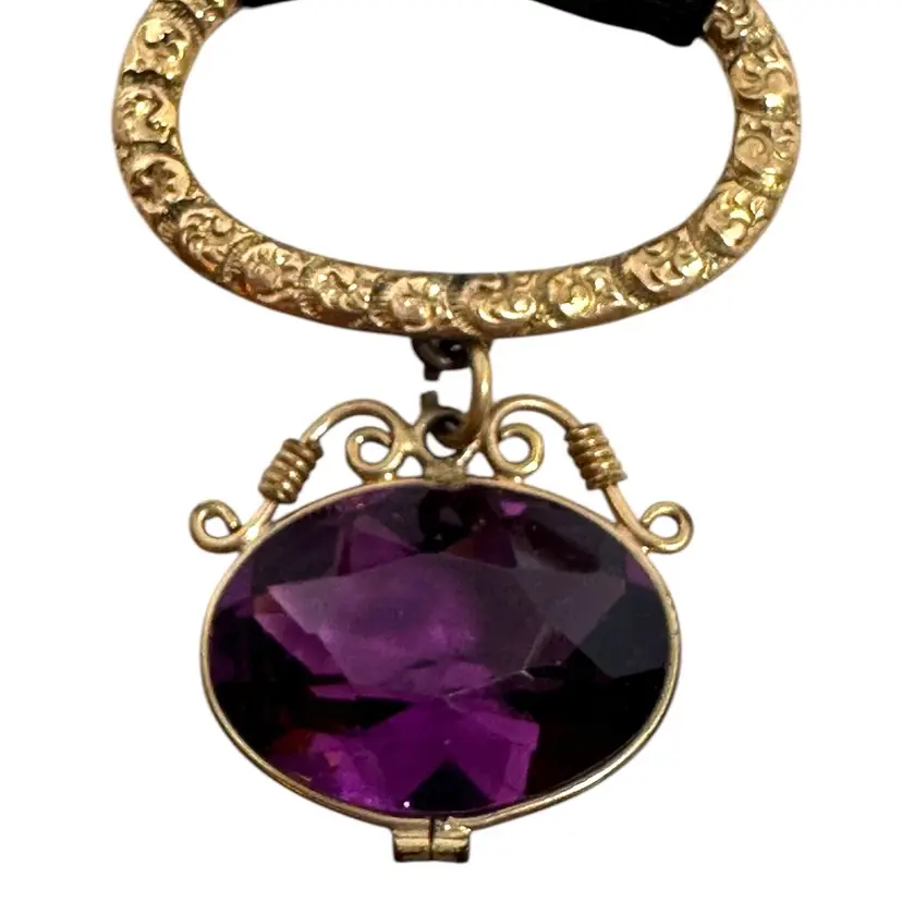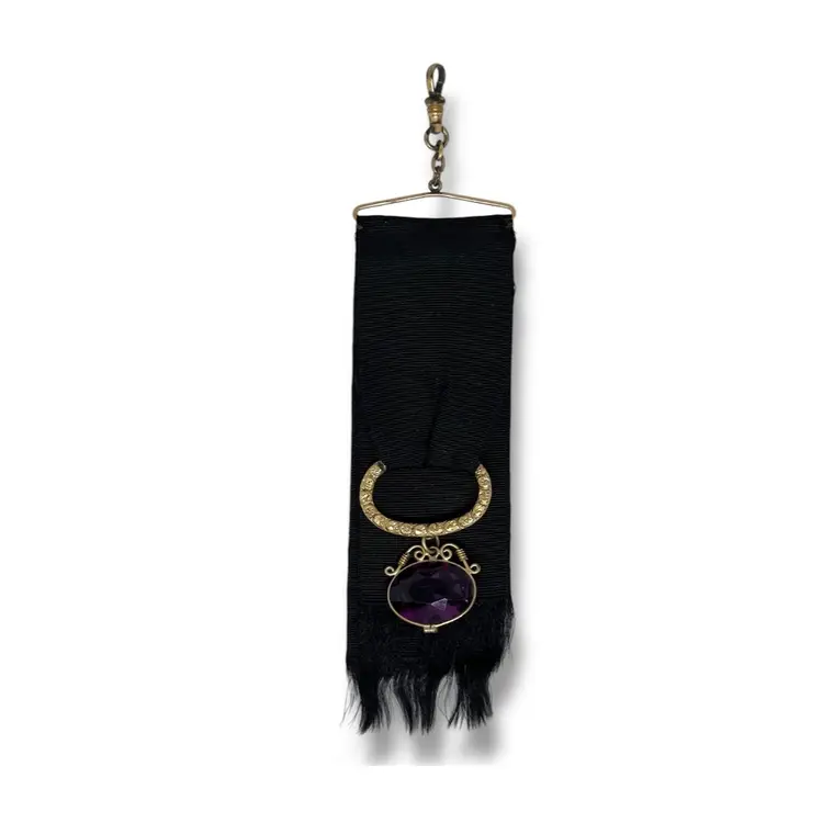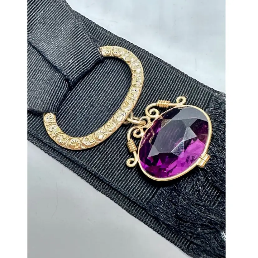 This beautiful fob is a must-have for any watch collector or Victorian jewelry enthusiast. The black ribbon is accented with a gold-filled amethyst glass watch fob, adding a touch of elegance. The intricate design and attention to detail make this piece a true work of art.