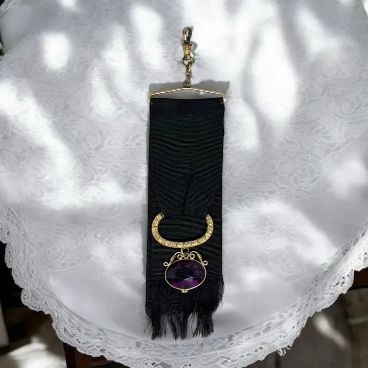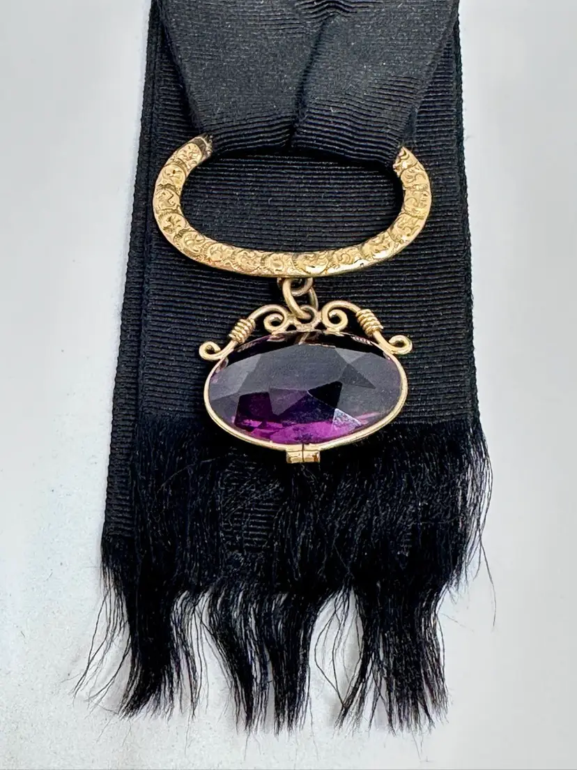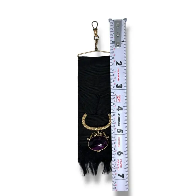 The fob is in excellent condition, ready to be added to your collection or worn as a statement piece. Its timeless beauty and historical significance make it a valuable addition to any jewelry collection. Don't miss your chance to own this stunning Victorian mourning black ribbon with amethyst glass watch fob. This will be carefully packaged and shipped to you right away.