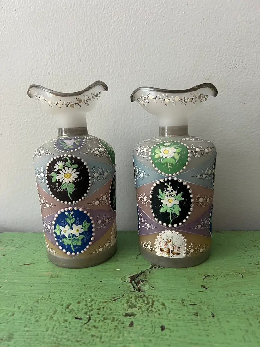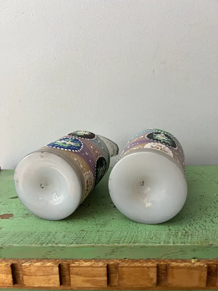 Absolutely stunning double spout opaline pouring bottles. c. 1880s-1910. Hand painted. Excellent condition. No noted flaws. Pontil mark on the base. Pieces are numbered.