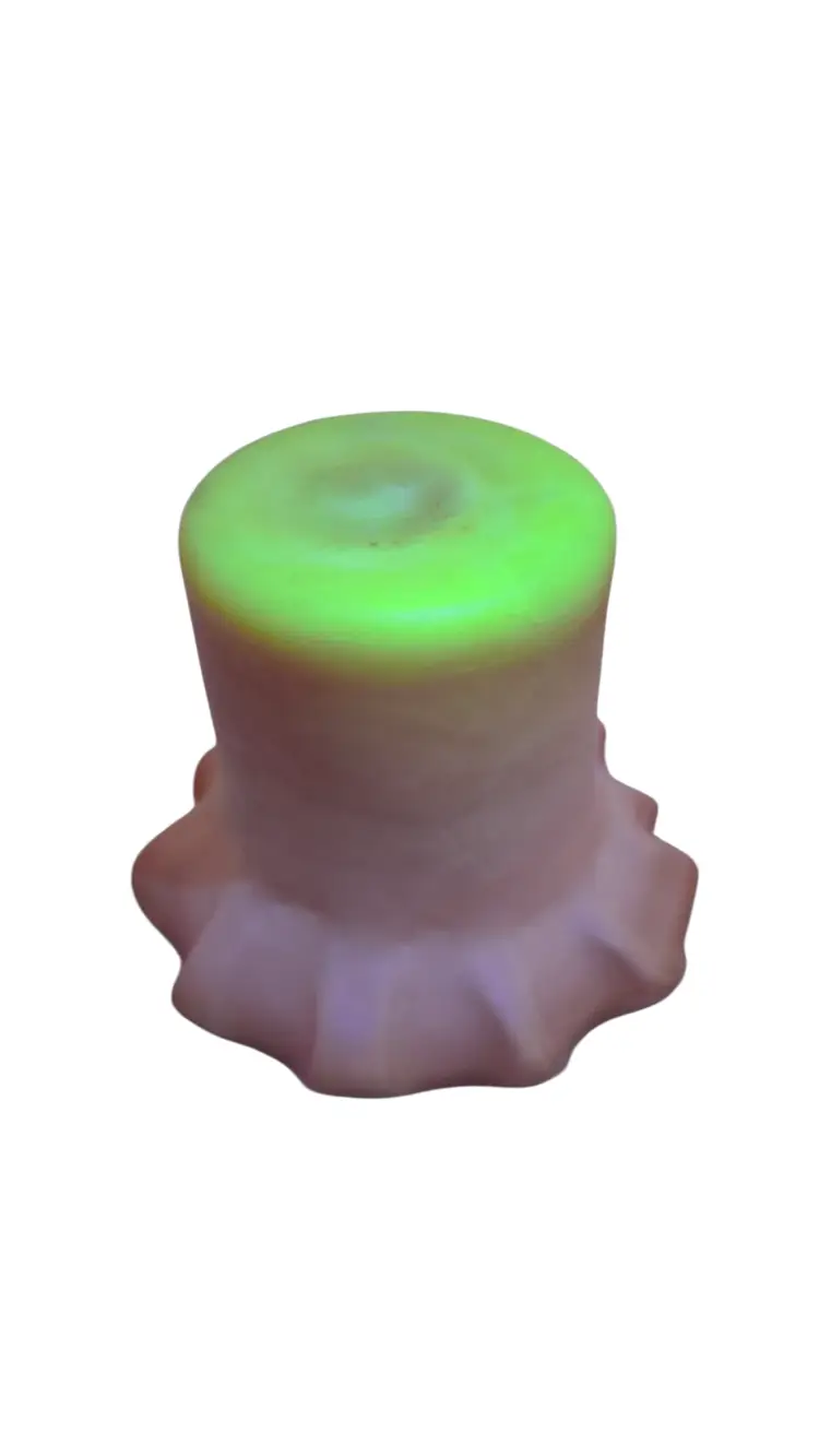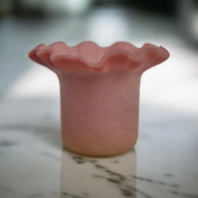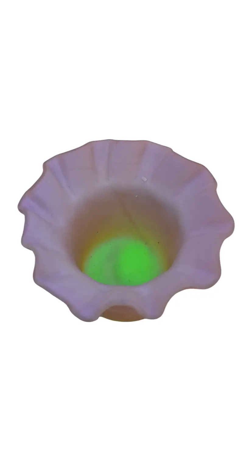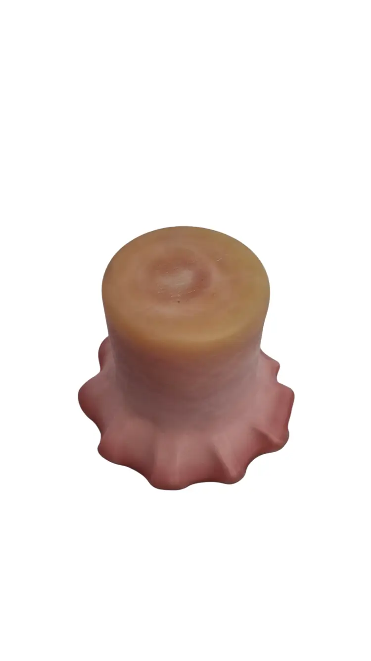 Victorian Peachblow Art Glass Toothpick Holder • Burmese Satin Glass • Glows Under Blacklight • Ruffled Edge Toothpick • Antique Vanity Décor This charming little Victorian-era art glass toothpick holder is a beautiful example of the softly colored Burmese / peachblow style glass that was popular in the late 1800s. The shading transitions from a warm blush rose to a creamy, soft peach tone, and the surface is satin with a velvety finish. The top features a lovely ruffled, wavy edge that gives it a delicate, flower-like form. A wonderful detail—it does glow under blacklight, showing the gentle green fluorescence associated with glass of this period. It’s a lovely display piece for collectors of Victorian art glass, custard glass, bride’s table décor, or small vanity accessories. Details: • Approx. 2¼” tall x 3” wide • Satin art glass in peachblow / Burmese-style shading • Glows under black light • Ruffled / crimped rim • Likely late Victorian era • No maker’s mark – maker unknown • Overall excellent antique condition, with age-appropriate patina Perfect for display in a curio cabinet, used as a ring bowl on a dresser, or added to a Victorian glass collection.