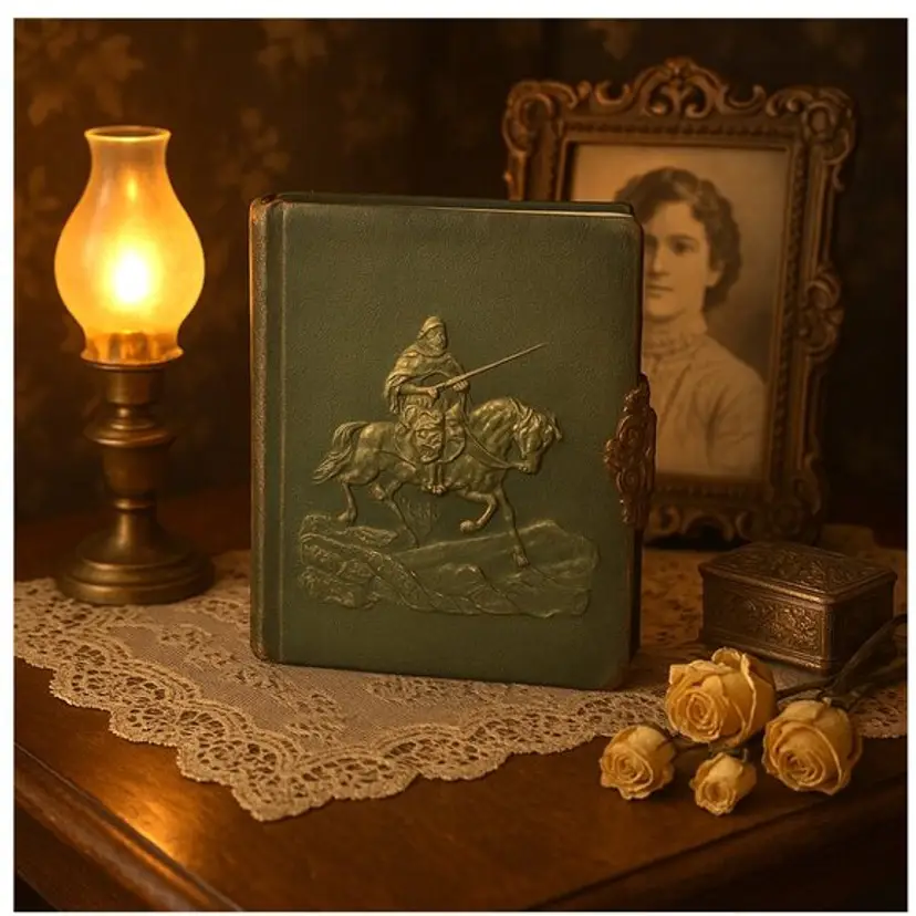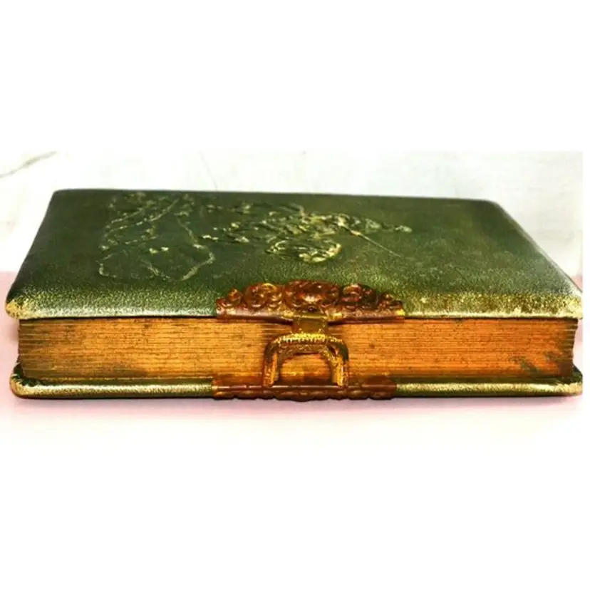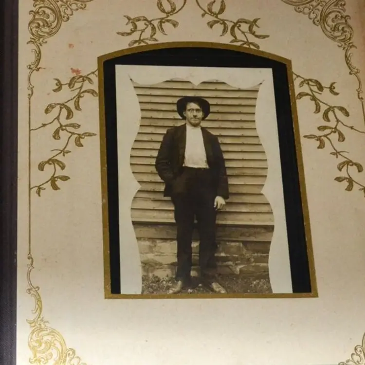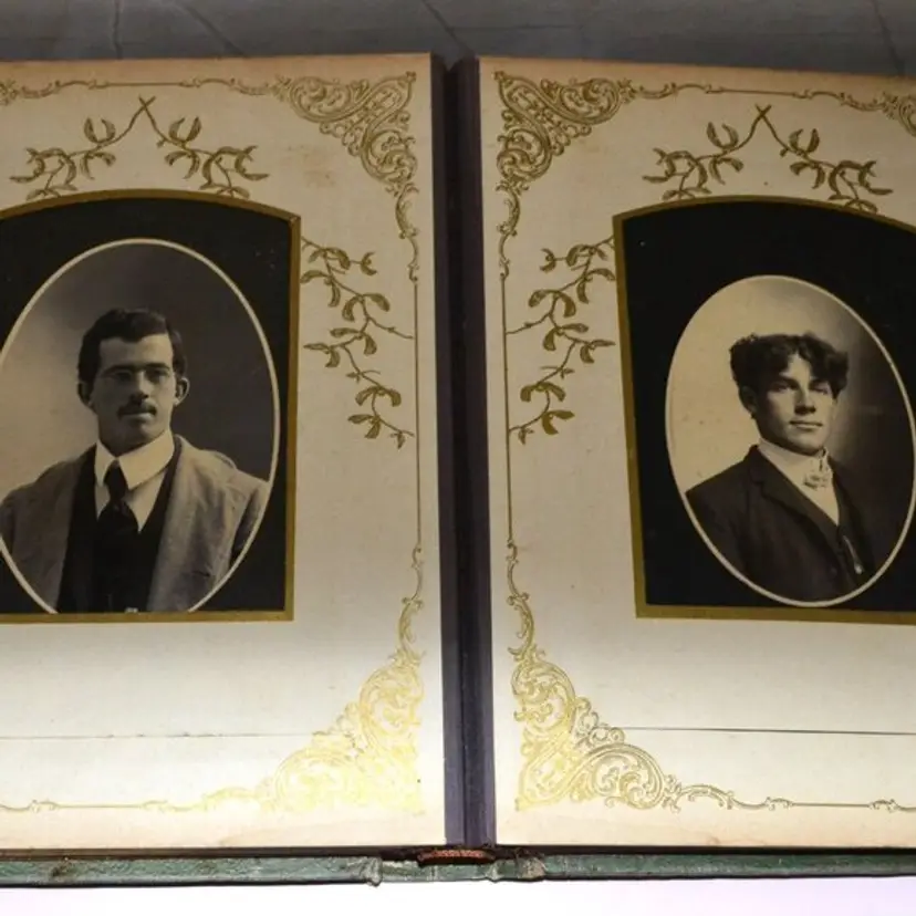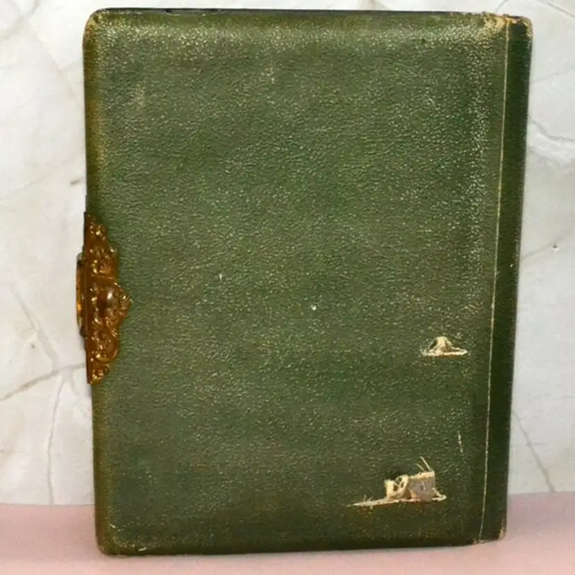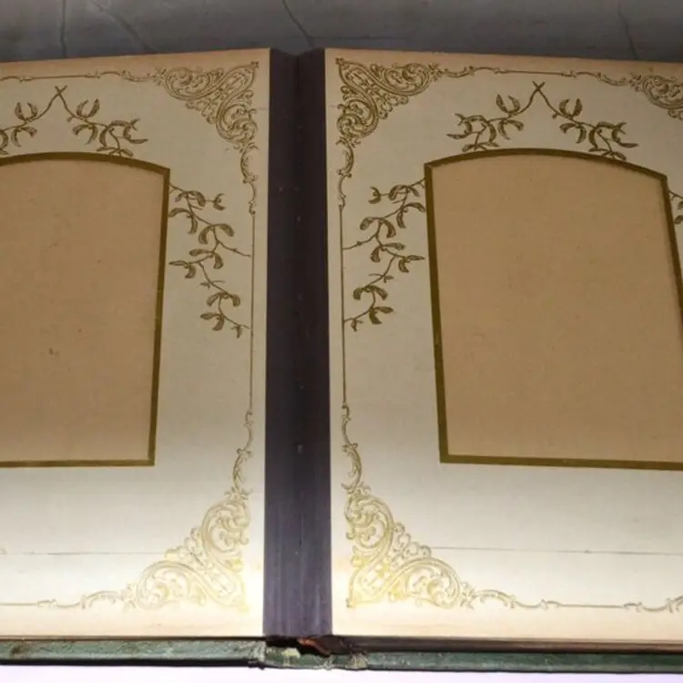 Preserving bygone memories in elegant style, this late 19th-century photo album features an embossed velvet cover, ornate metal clasp, and thick card pages housing original cabinet portraits. The album’s aged patina and decorative trimmings provide a place to put your cabinet cards and add to Victorian decor.