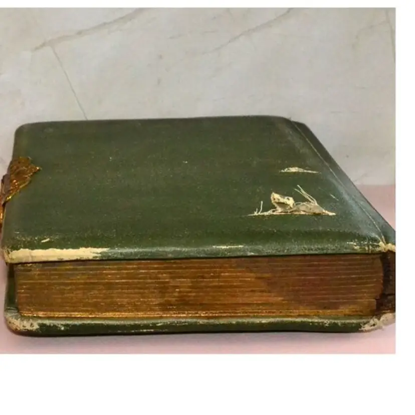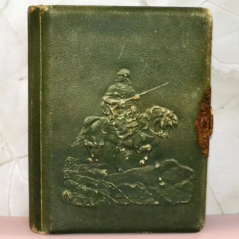 This album measures 8 x 10 x 2. Understandably with its age there are condition issues. There is the slight tear in the back, edge wear and spine wear. This all adds to the charm of this piece and will not detract in displaying.