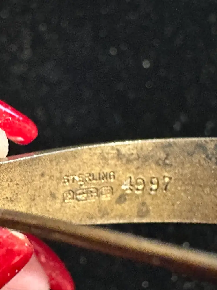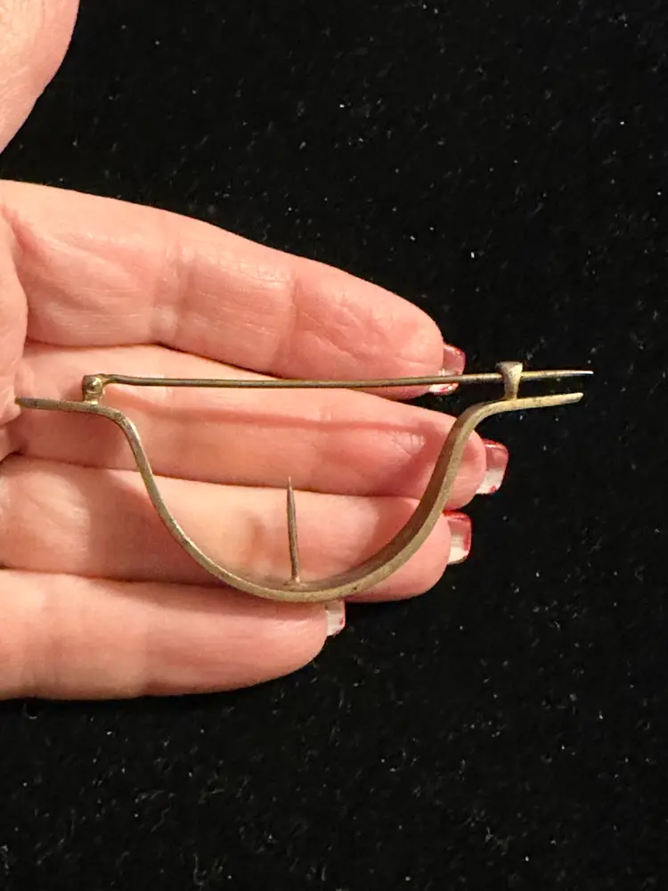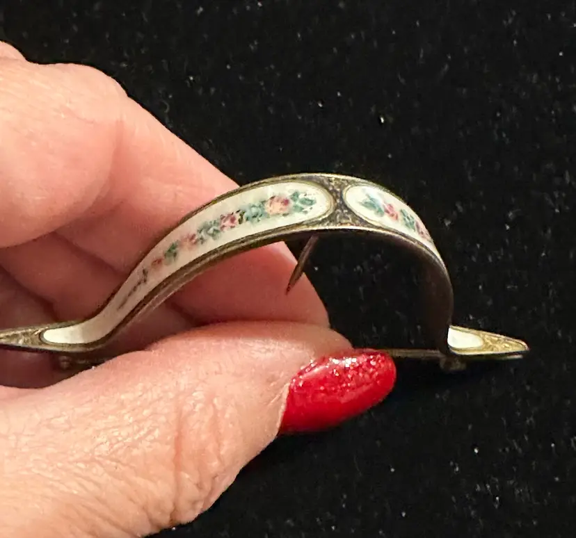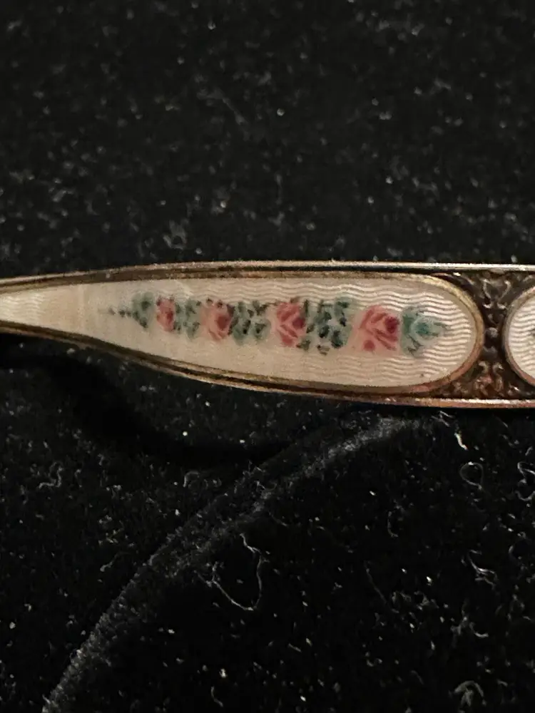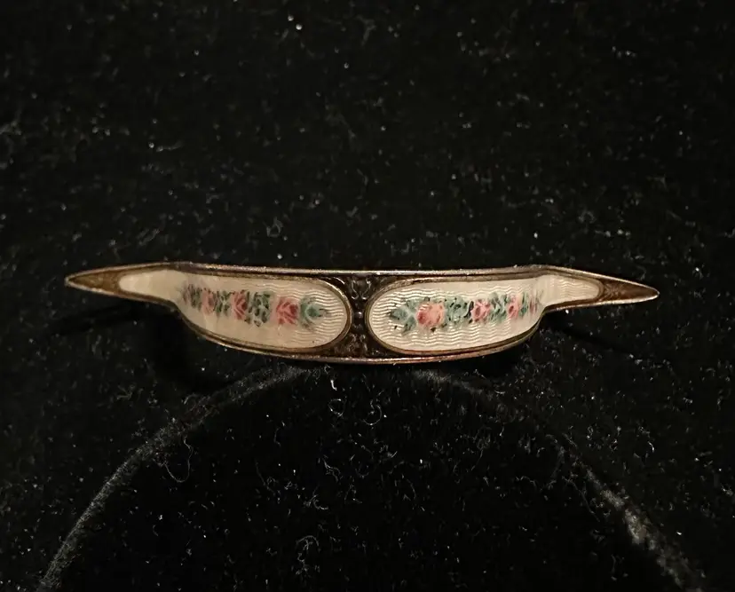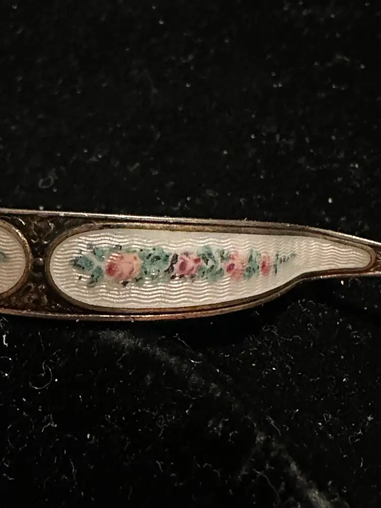 Antique posey pin by R. Blackington. It is sterling silver with white enamel & hand painted flowers. It is 3” x 3/8”. Very good condition.