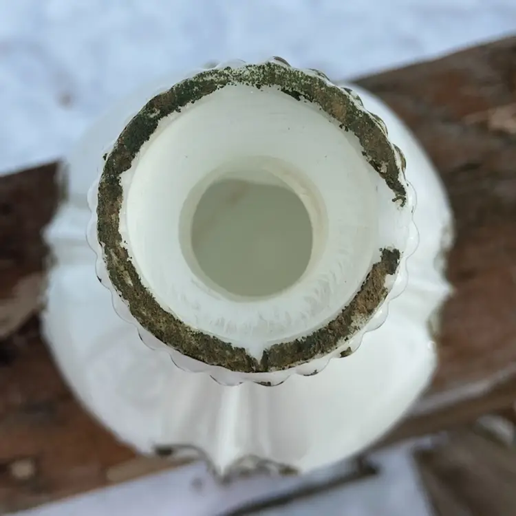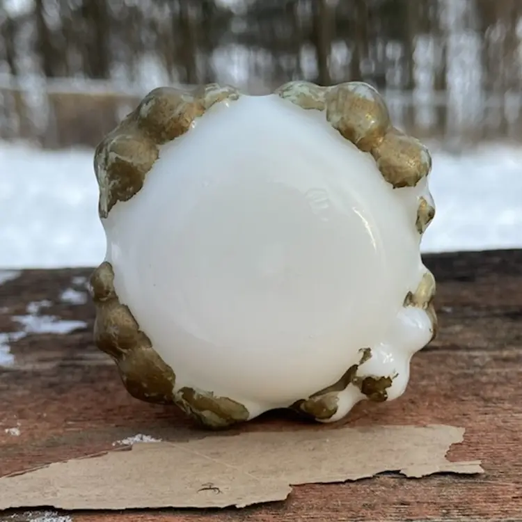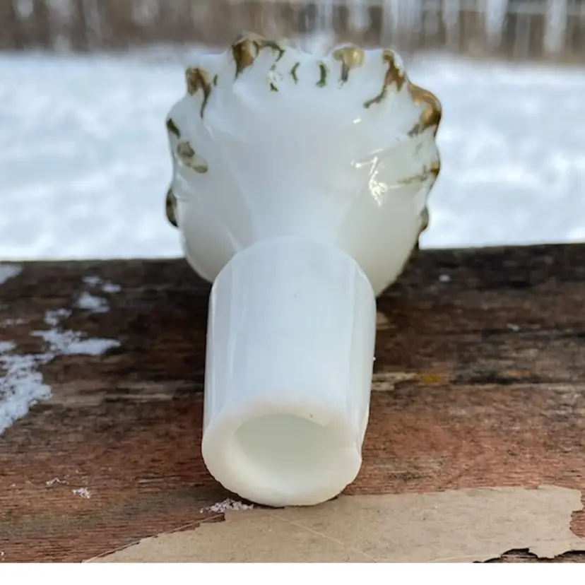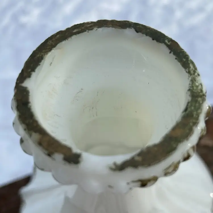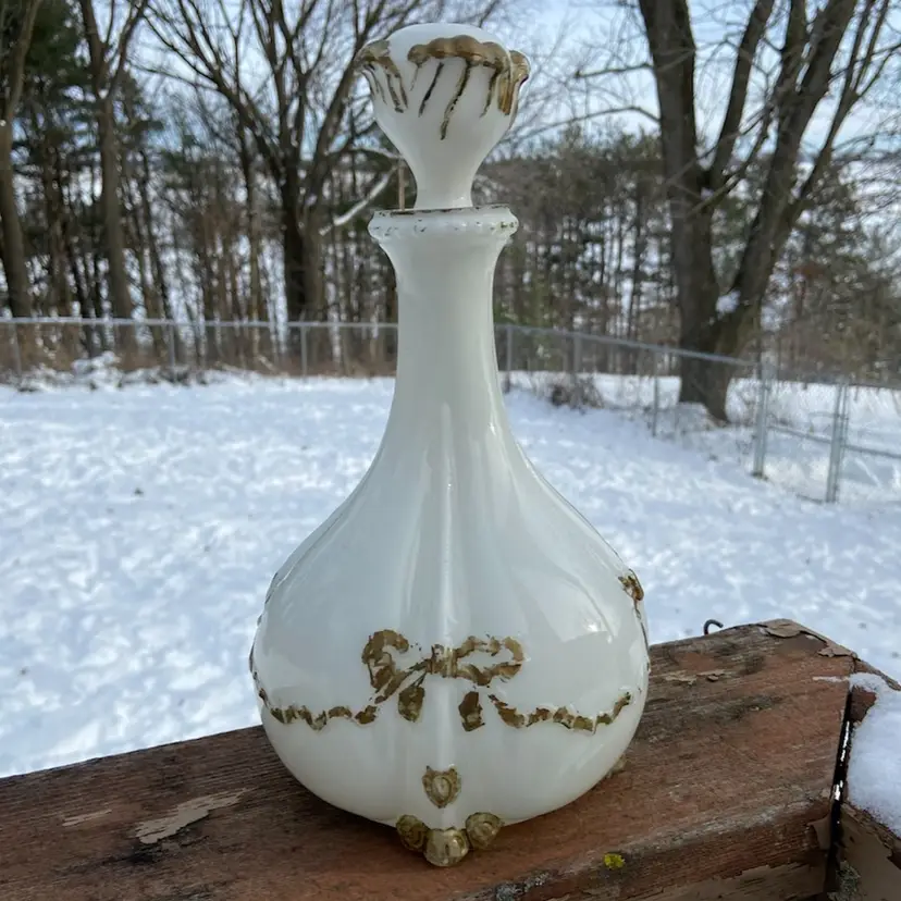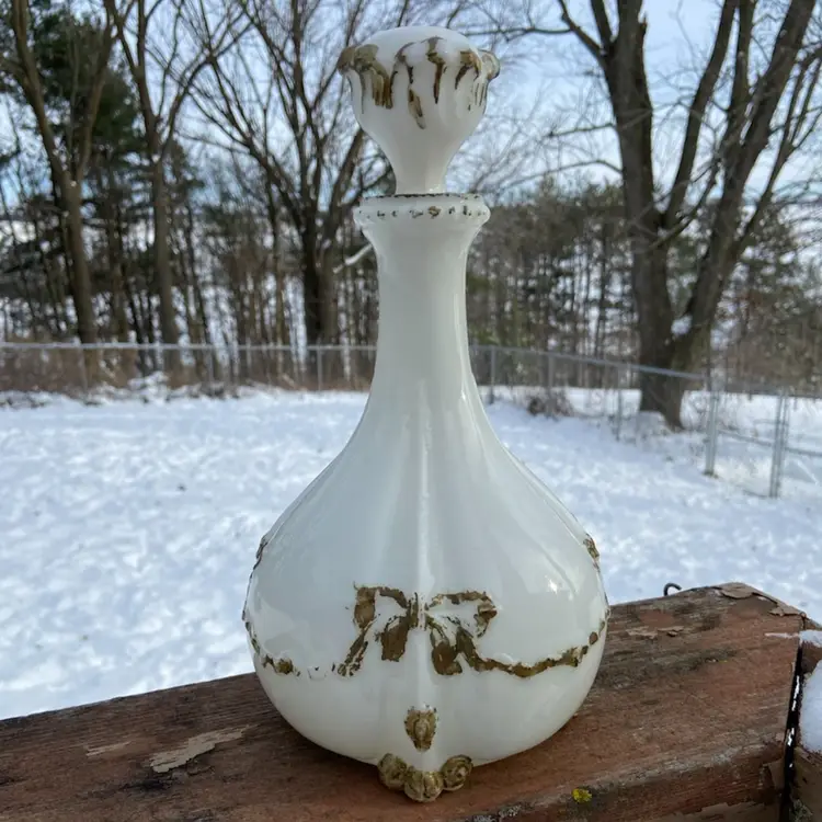 Approx: 10.25”h (including stopper) x 6”w x opening 7/8”. Preowned condition. *A couple chips on interior lip of vase and on stopper. Paint loss. See images as part of description.