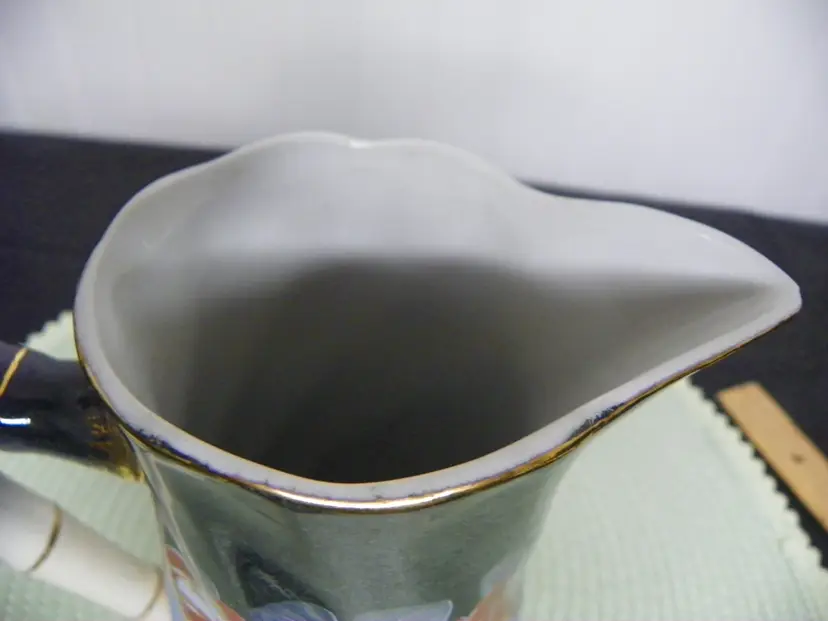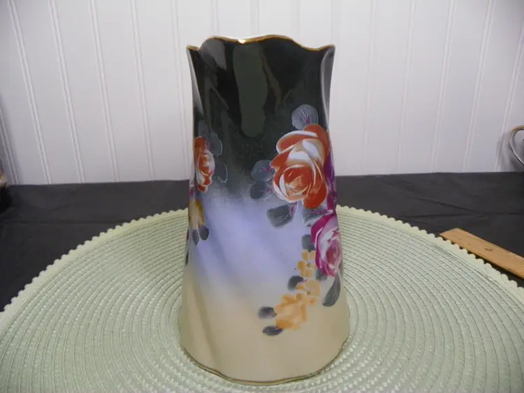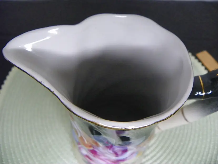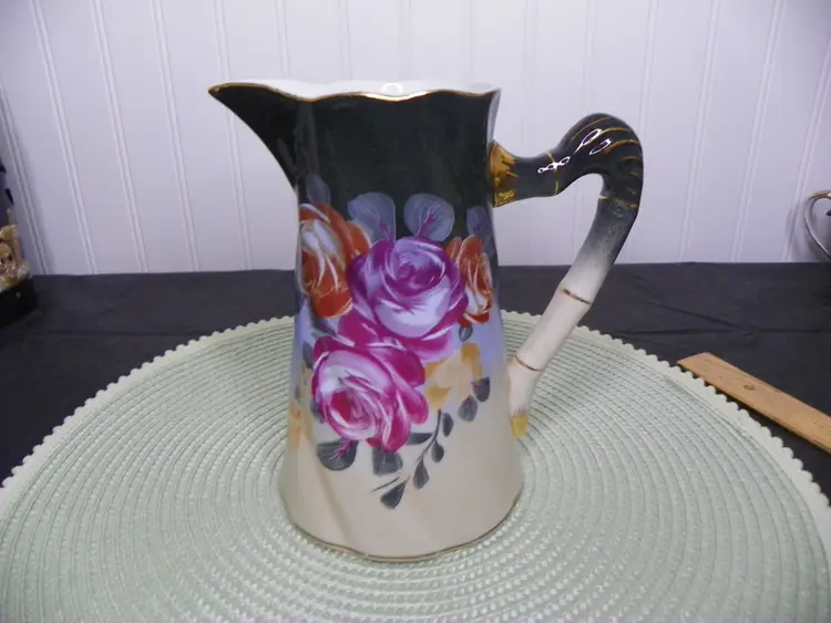 This beautiful pitcher features roses on a black/cream background with gold trim. Good condition, no chips or cracks.