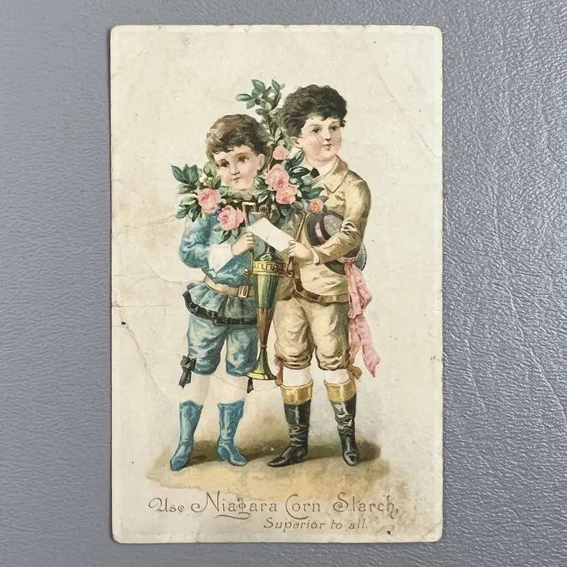 Victorian Trade Card Niagara Corn Starch Children With Bouquet Of Flowers 3x4.25"